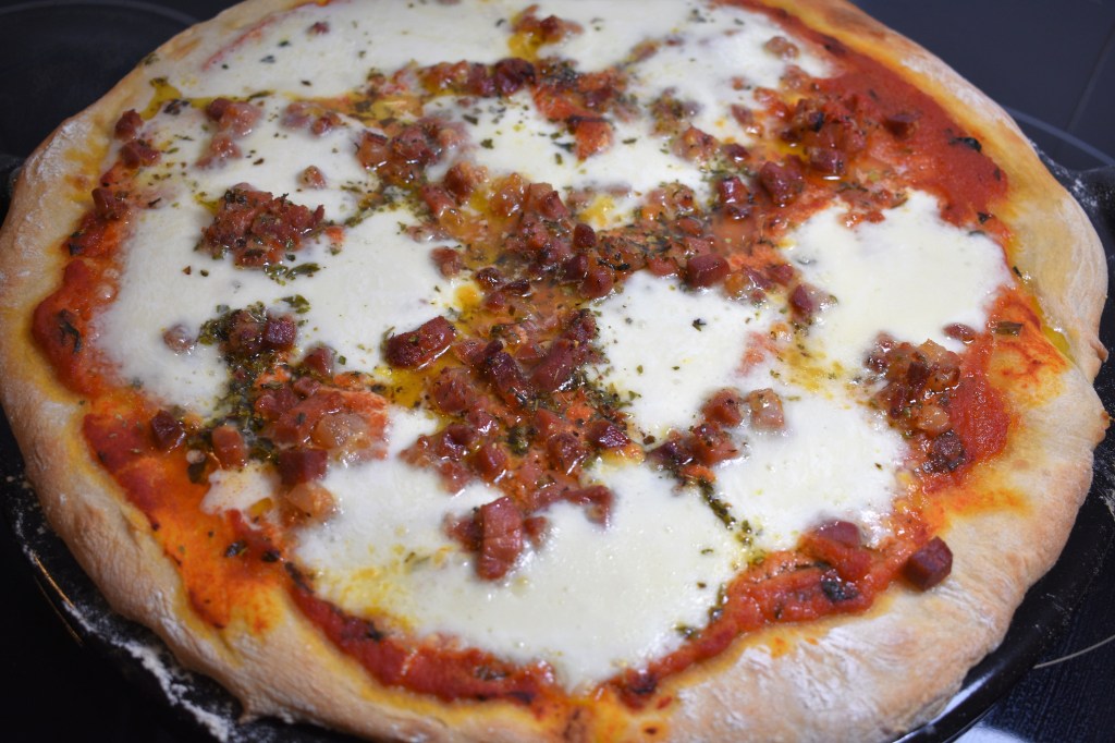 Hola, hace días que no publico nada..la verdad estoy un poco perezosa en la cocina con tanto calor. Pero no podía dejar de traeros la receta de la pizza. Hay sitios maravillosos, sobre todo en Uruguay, donde hacen unas pizzas estupendas. Pero hacerla en casa tiene su toque, te desestresa, te organiza una cena y encima todos felices. ¿A quien no le gusta la pizza? Creo que a nadie. Esta pizza que os traigo es para que te organices, porque aunque es muy fácil de hacer lleva su tiempo, 8 horas de fermentación en nevera y 2 horas más antes de meterla al horno. Así que si quieres cenar pizza casera la preparas por la mañana y a la noche la tienes. Puedes tenerla en la nevera hasta 3 días, 72 horas. Lo mejor es hacerla un jueves a la noche para la típica cena de viernes noche. Tu te organizas como quieras, tendrás poco trabajo, solo necesitarás mimo y paciencia. Con esta receta he estrenado una base cerámica de la marca Emile Henry de las rebajas de Claudia&Julia, que logra una corteza increíble como si tuvieras un horno de leña. Pero si no la tienes, no te preocupes, te quedará igual de estupenda.