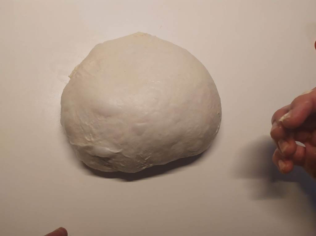 2. Ponemos en un bol la harina, hacemos un hueco en el medio y ponemos la levadura disuelta, el aceite y vamos integrando con una cuchara de madera. Vamos añadiendo el agua poco a poco, y por último la sal. Formamos una bola de masa integrada. Al principio la masa es rugosa y pegajosa. Tapamos con un film y dejamos reposar 20 minutos para que se desarrolle el gluten.