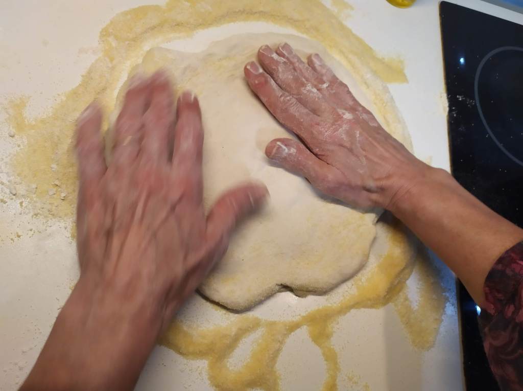 3. Nos humedecemos las manos con agua y cogemos la masa de los bordes, la doblamos como un sobre, primero de un lado, luego del otro. Dejamos reposar 20 minutos más.