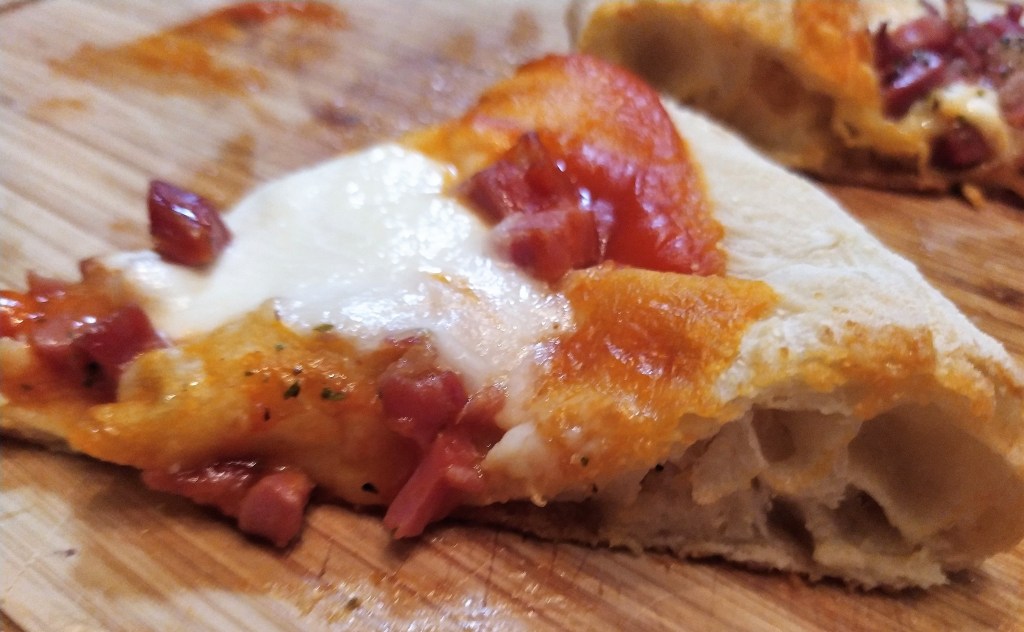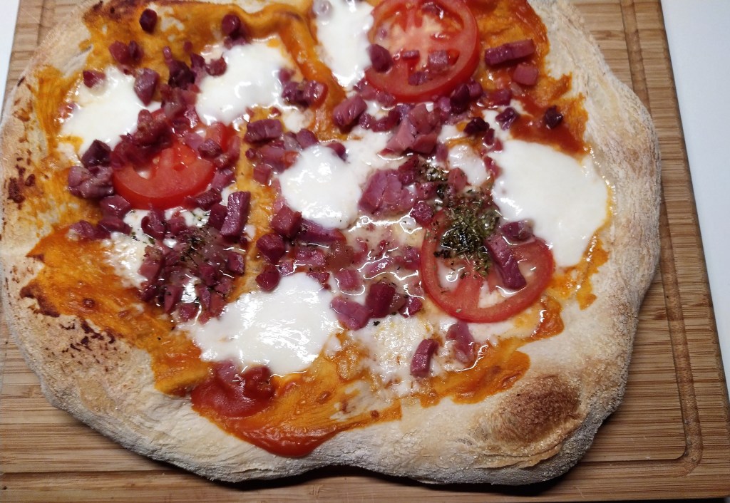 8. Transferimos la pizza a la bandeja con cuidado de no quemarnos. O ponemos sobre papel y con ayuda de una bandeja plana volcamos directamente en la base del horno. Horneamos 10 /15 minutos. Retiramos con cuidado de no quemarnos, ponemos los ingredientes a gusto sobre base de un buen tomate frito: en este caso jamón, mozzarella y orégano.