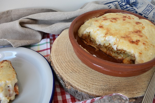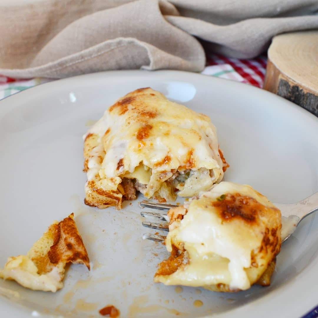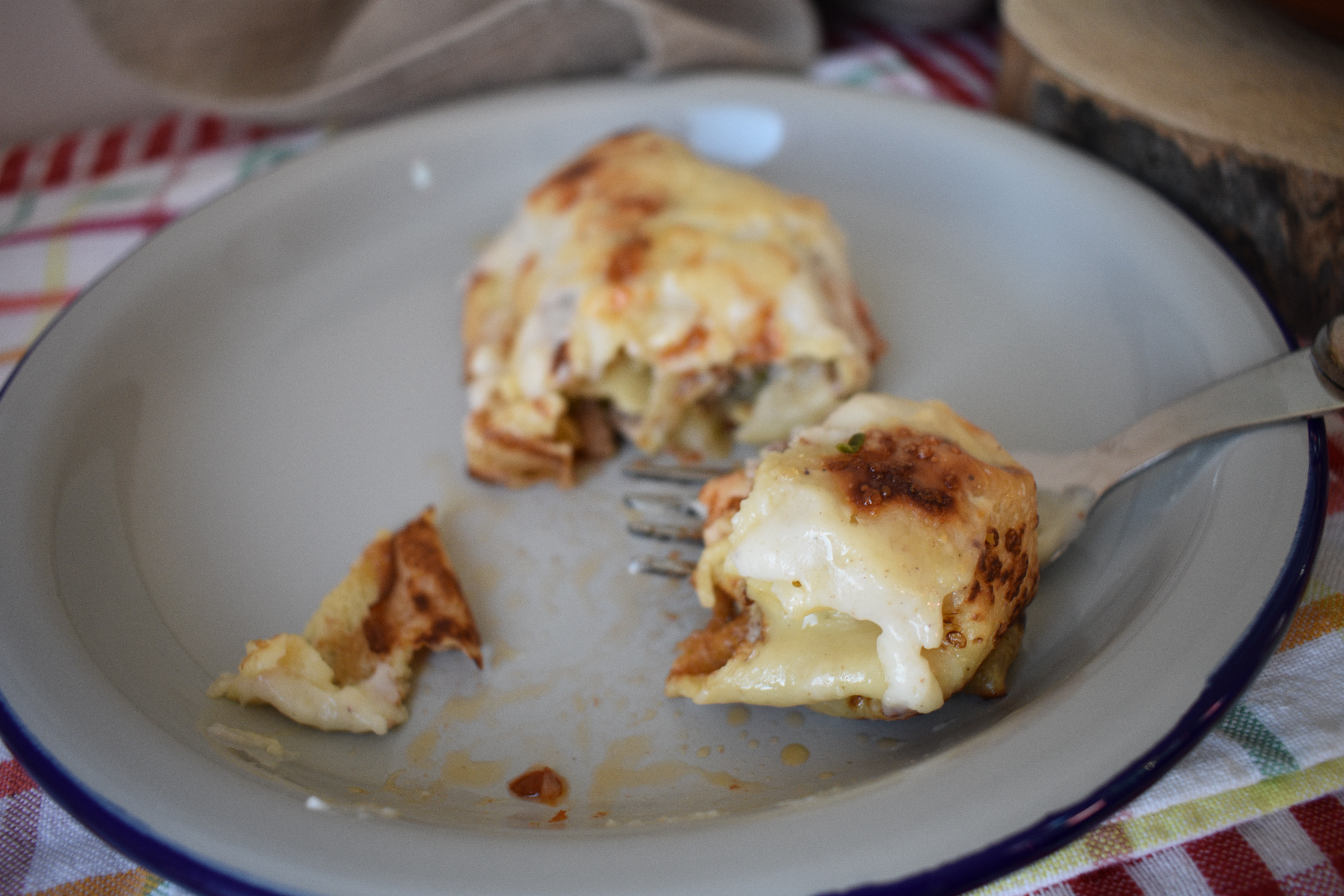 - Rellenamos las crepes y las disponemos en una fuente de horno cubierta de tomate frito casero. Cubrimos con la bechamel, queso parmesano rallado y mantequilla y horneamos durante 35 minutos aproximadamente a 200º, hasta obtener un color dorado.