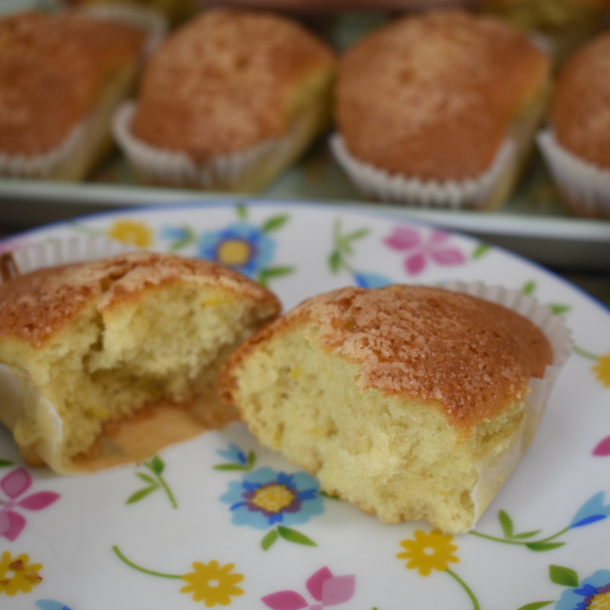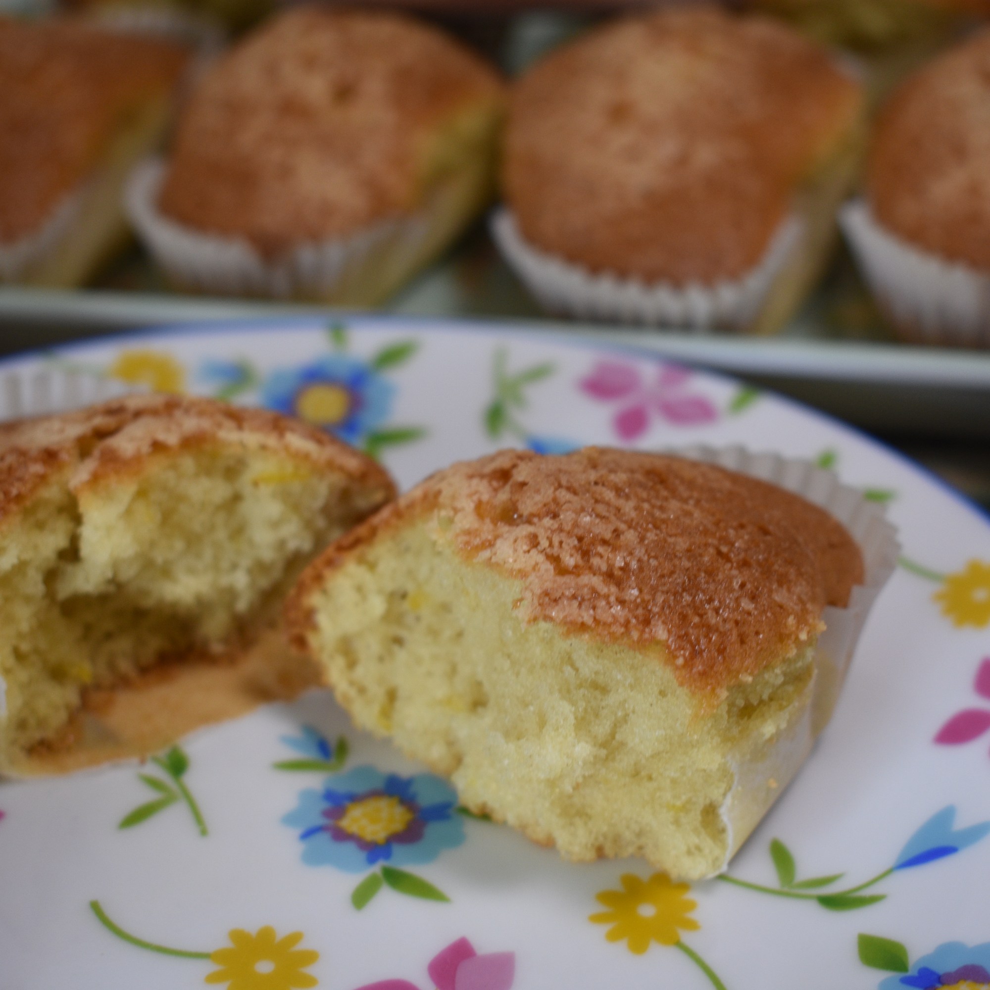 - Precalentamos el horno a 220º, colocando una bandeja debajo con agua. Colocamos cápsulas de magdalena valenciana en una bandeja de horno, bien pegadas entre sí para que no se abran. Rellenamos 3/4 partes. Espolvoreamos con azúcar y metemos al horno cuando esté bien caliente. Bajamos la temperatura a 200º, calor arriba y abajo. Cocinamos durante 15-20 minutos, deben estar bien levadas y doradas. Los últimos 5 minutos ponemos el ventilador.