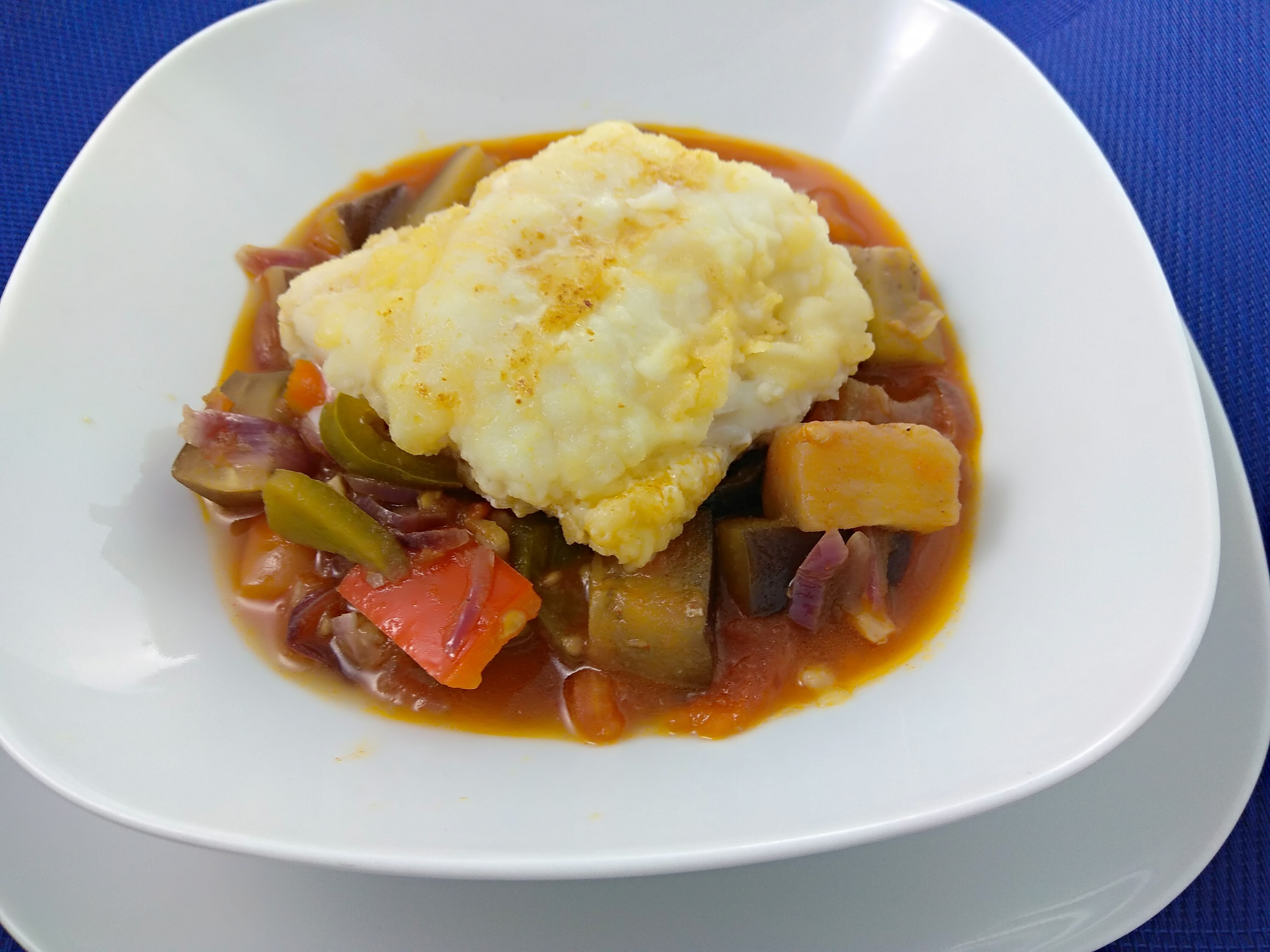Si hay un pescado que me encanta en todas sus versiones es el bacalao. Y pensar que de pequeña lo odiaba. En casa solo se consumía en Semana Santa. Lo traían en salazón desde el Atlántico. Su olor me daba naúseas, y nadie me convencía de que sabía bien después de desalado. Hoy en día podemos encontrarlo fresco y en salazón; y paradojas de la vida me encanta. Aquí va mi versión mediterránea, con una samfaina, que es una preparación catalana-valenciana de una especie de sofrito de berenjena y calabacín.
