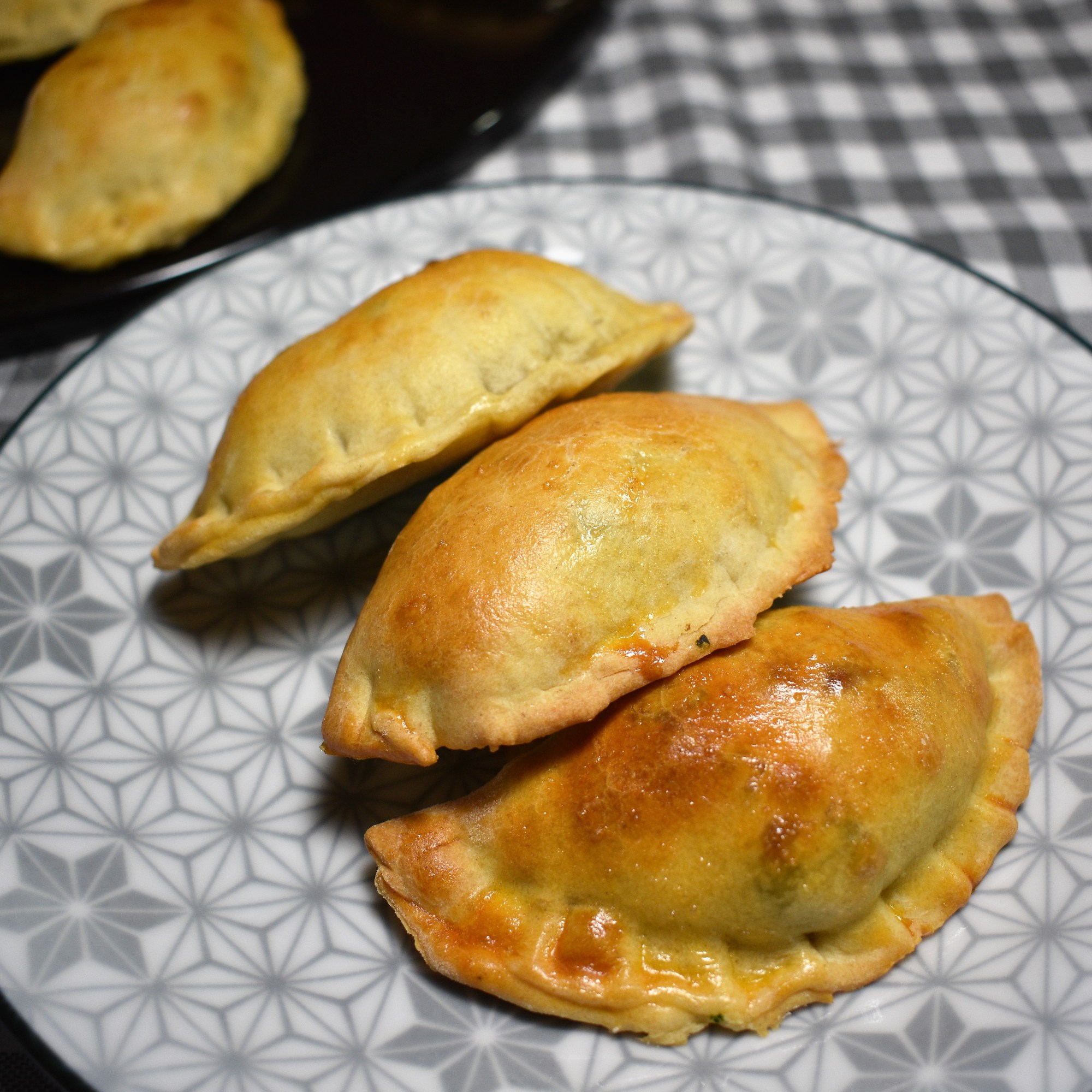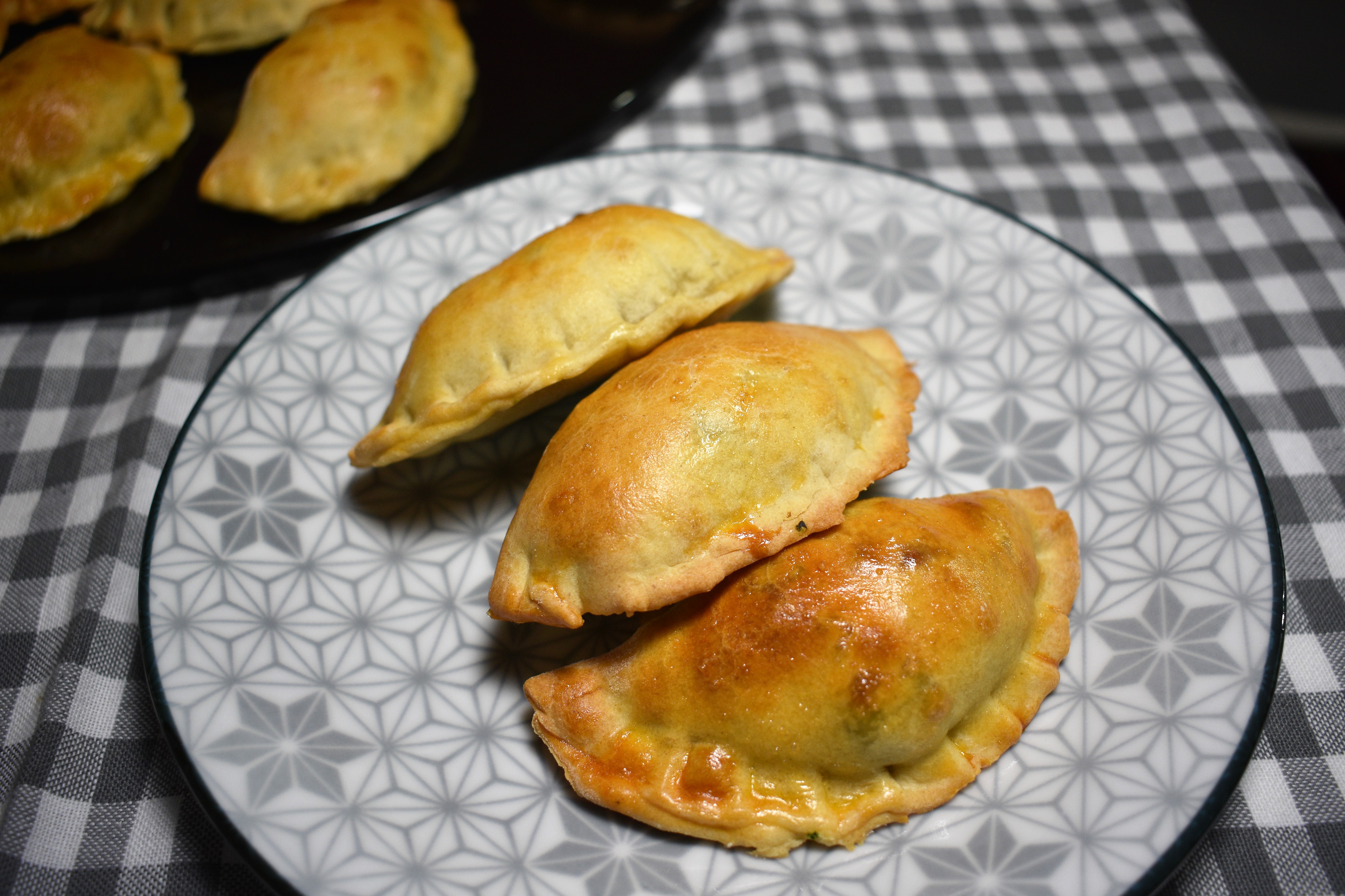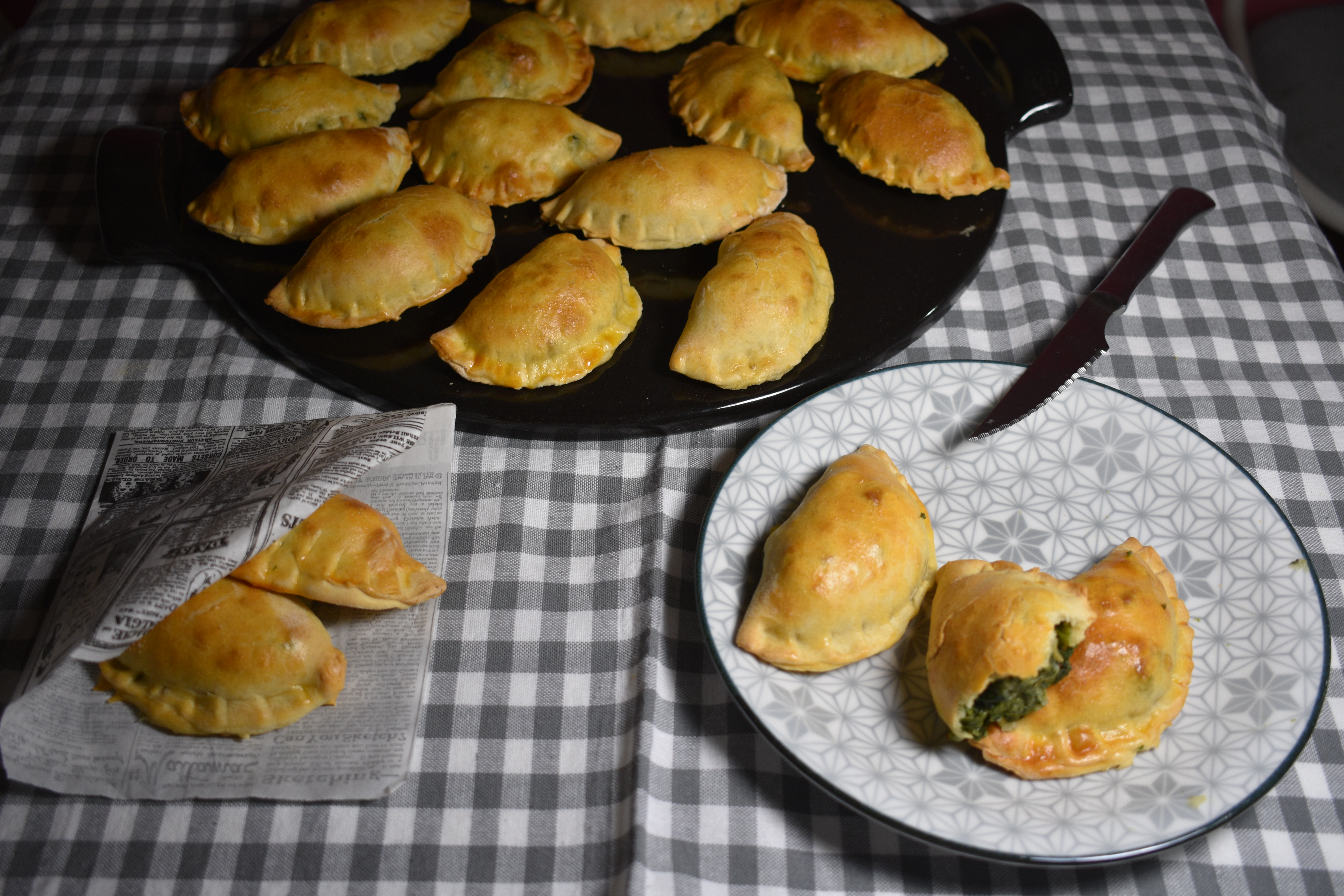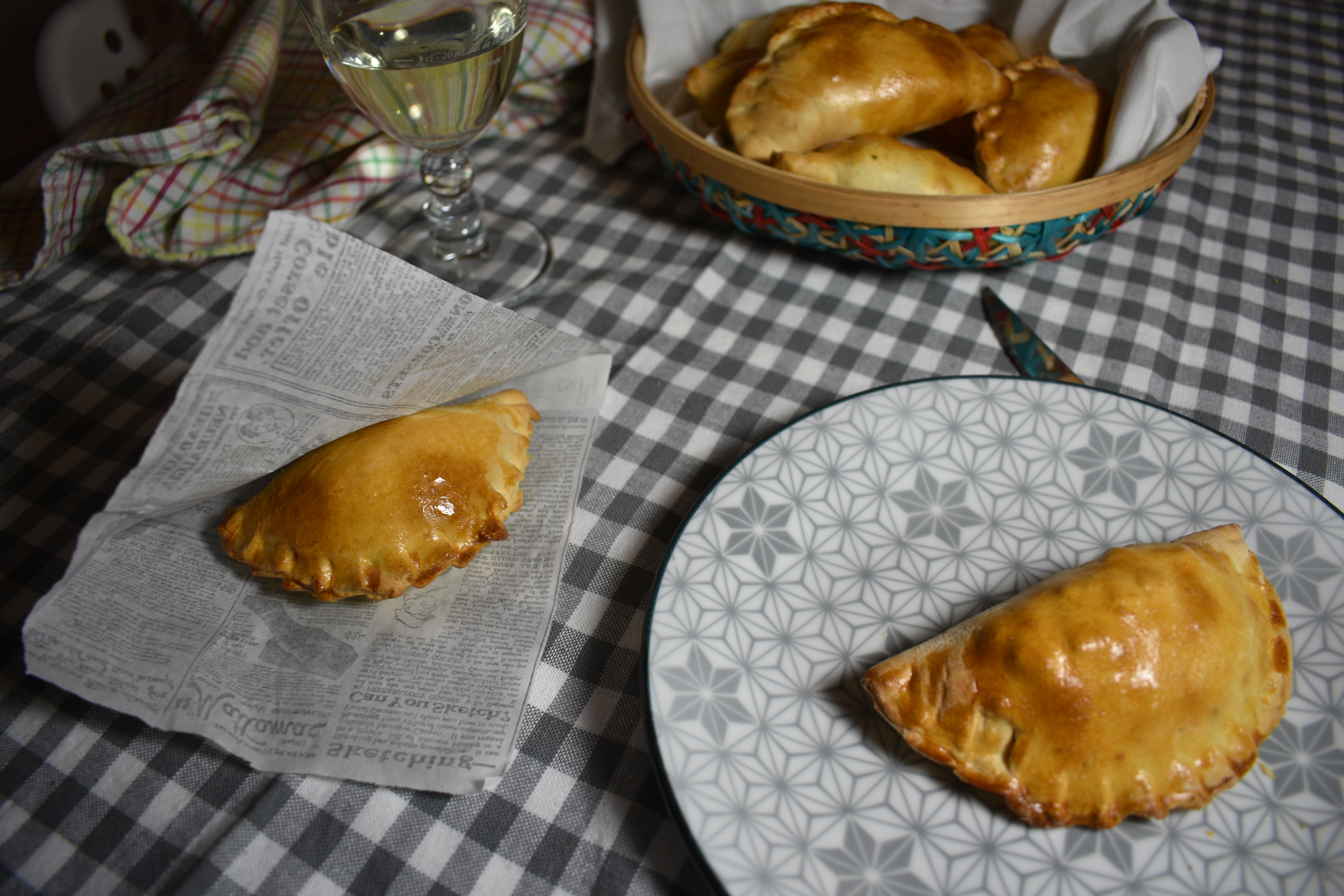 - Amasamos ligeramente la masa sobre la encimera enharinada. Estiramos a 2 mm de espesor. Cortamos círculos del tamaño deseado, y ponemos en el centro de cada uno una cucharada de relleno. Se humedecen los bordes con agua, se doblan por la mitad y se repulga el borde o aprieta bien con un tenedor. Se pintan con huevo batido y se hornean en una bandeja de horno con papel de cocina a 200º durante unos 30 minutos, calor arriba y abajo, o hasta que adquieren un bonito color dorado.