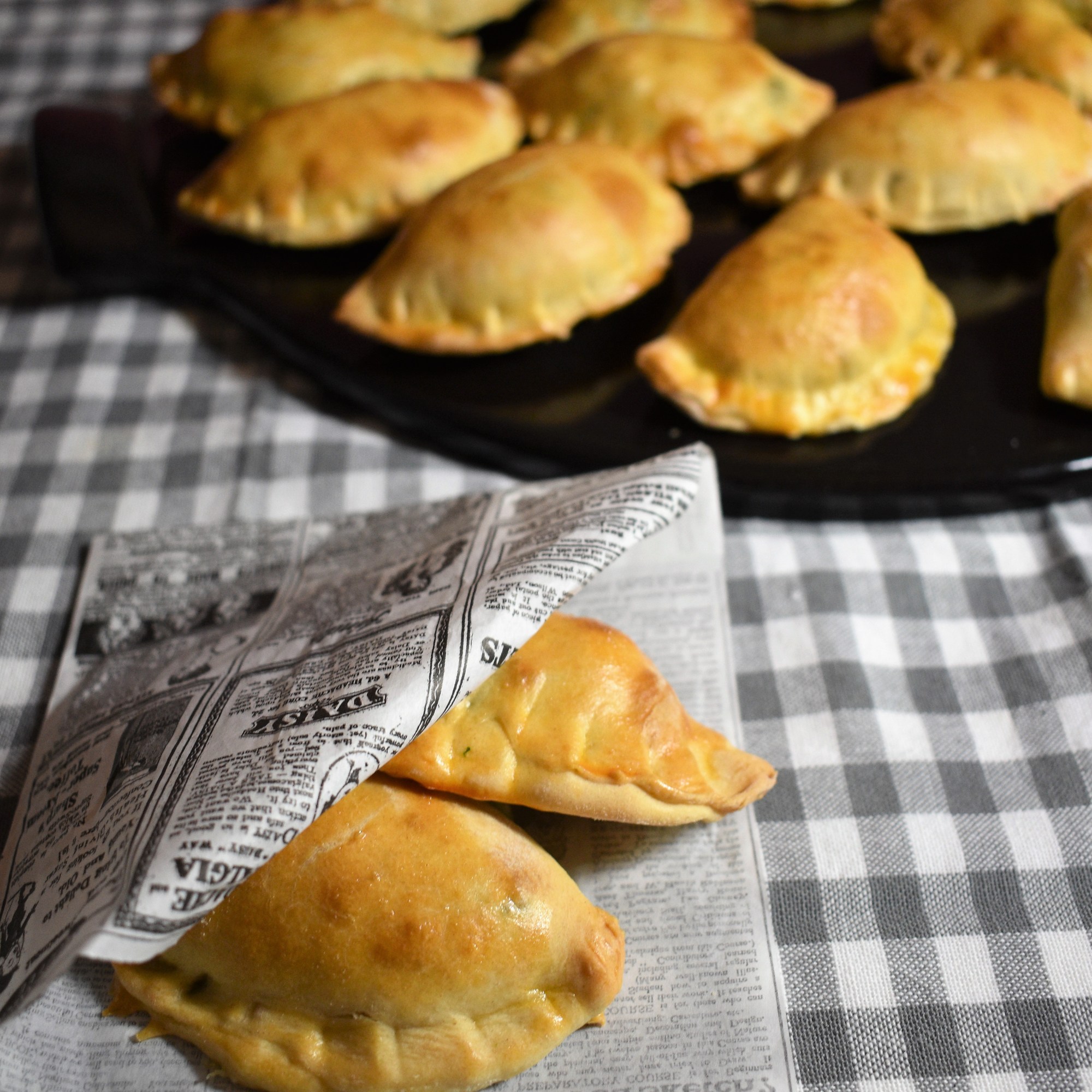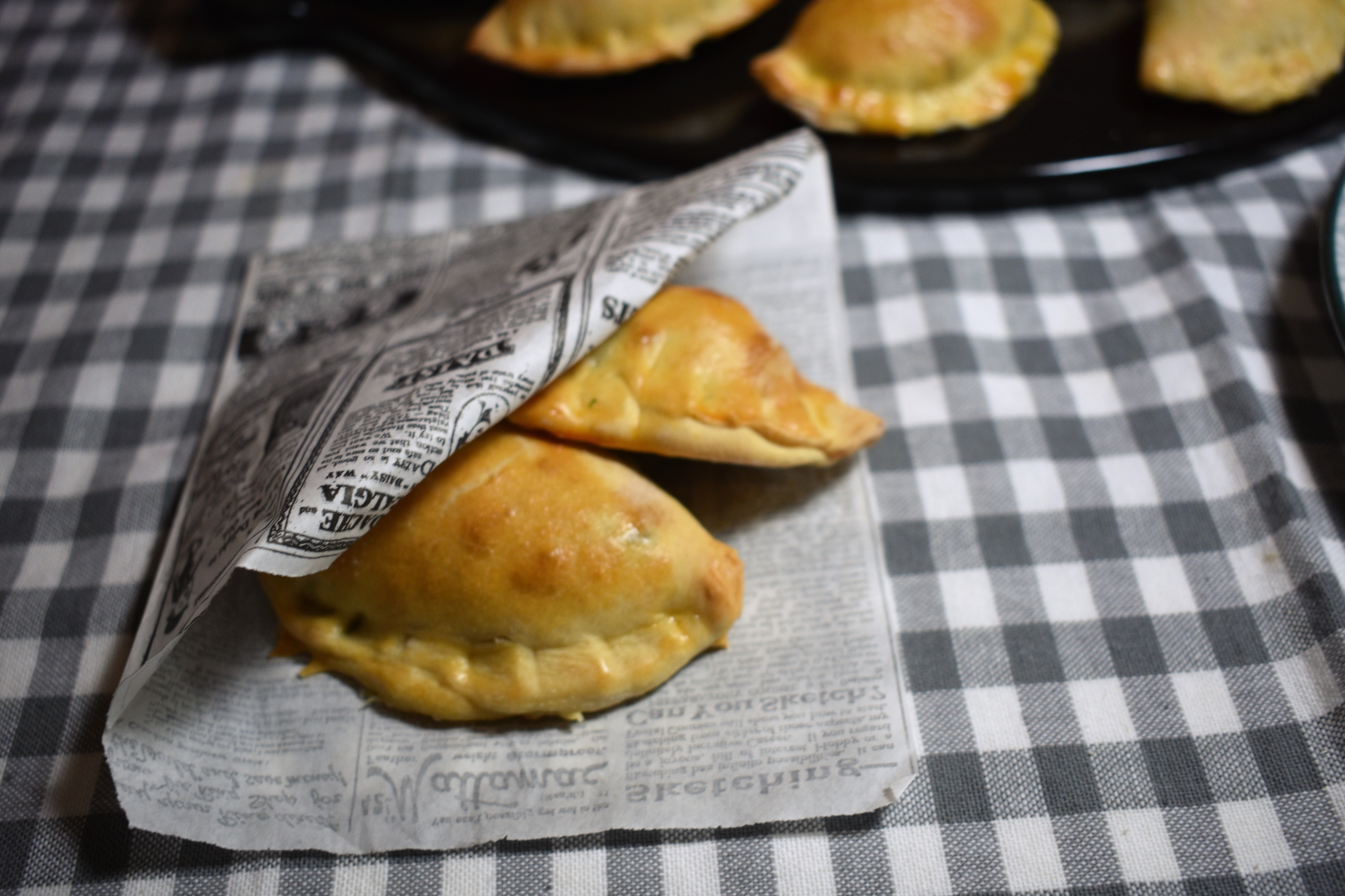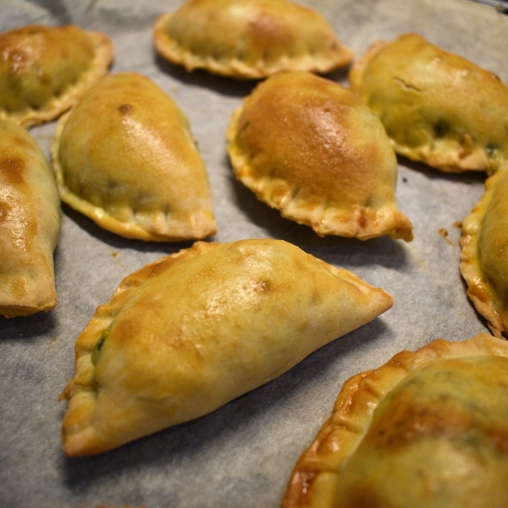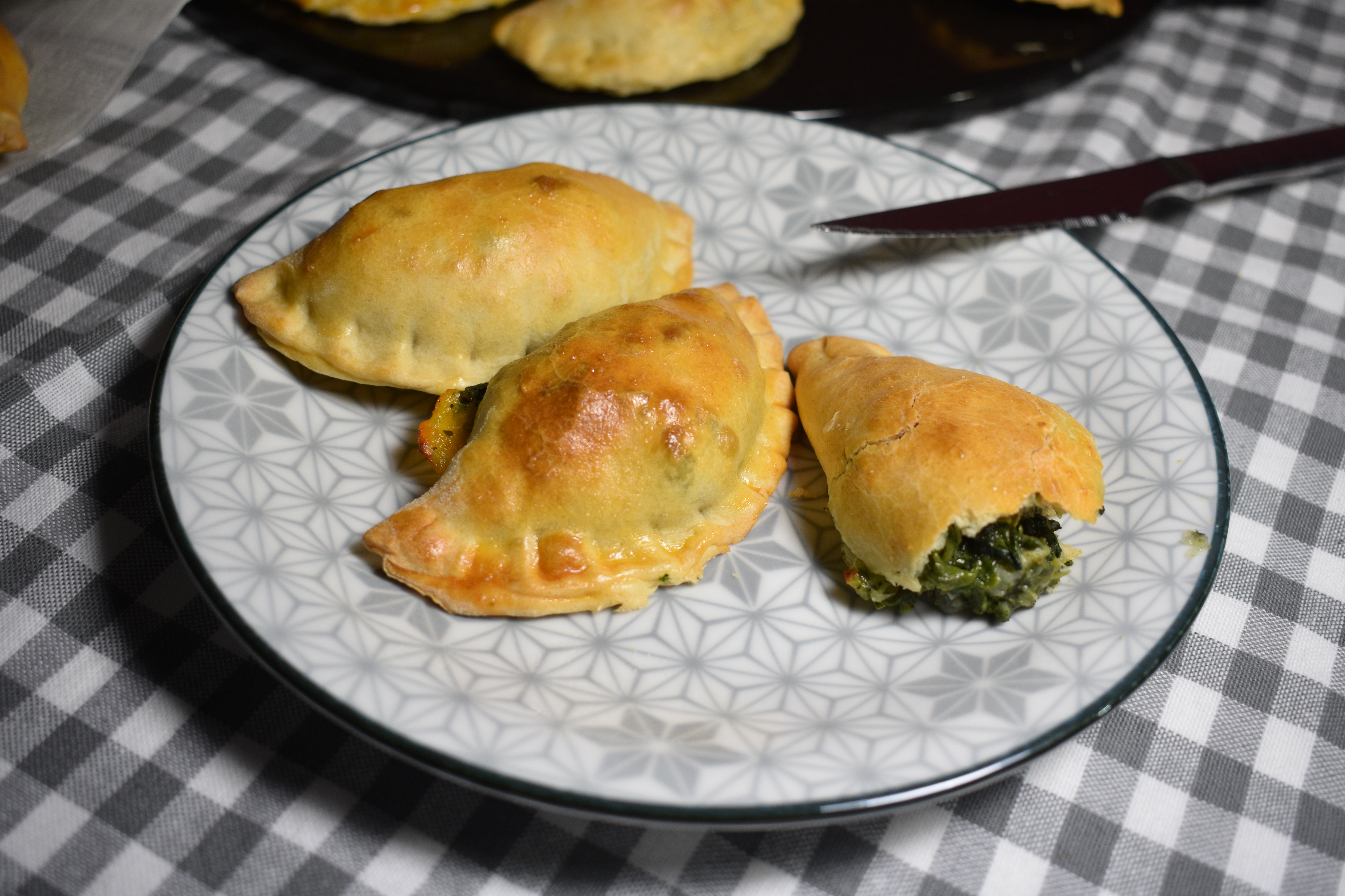 - Amasamos ligeramente la masa sobre la encimera enharinada. Estiramos a 2 mm de espesor. Cortamos círculos del tamaño deseado, y ponemos en el centro de cada uno una cucharada de relleno. Se humedecen los bordes con agua, se doblan por la mitad y se repulga el borde o aprieta bien con un tenedor. Se pintan con huevo batido y se hornean en una bandeja de horno con papel de cocina a 200º durante unos 30 minutos, calor arriba y abajo, o hasta que adquieren un bonito color dorado.