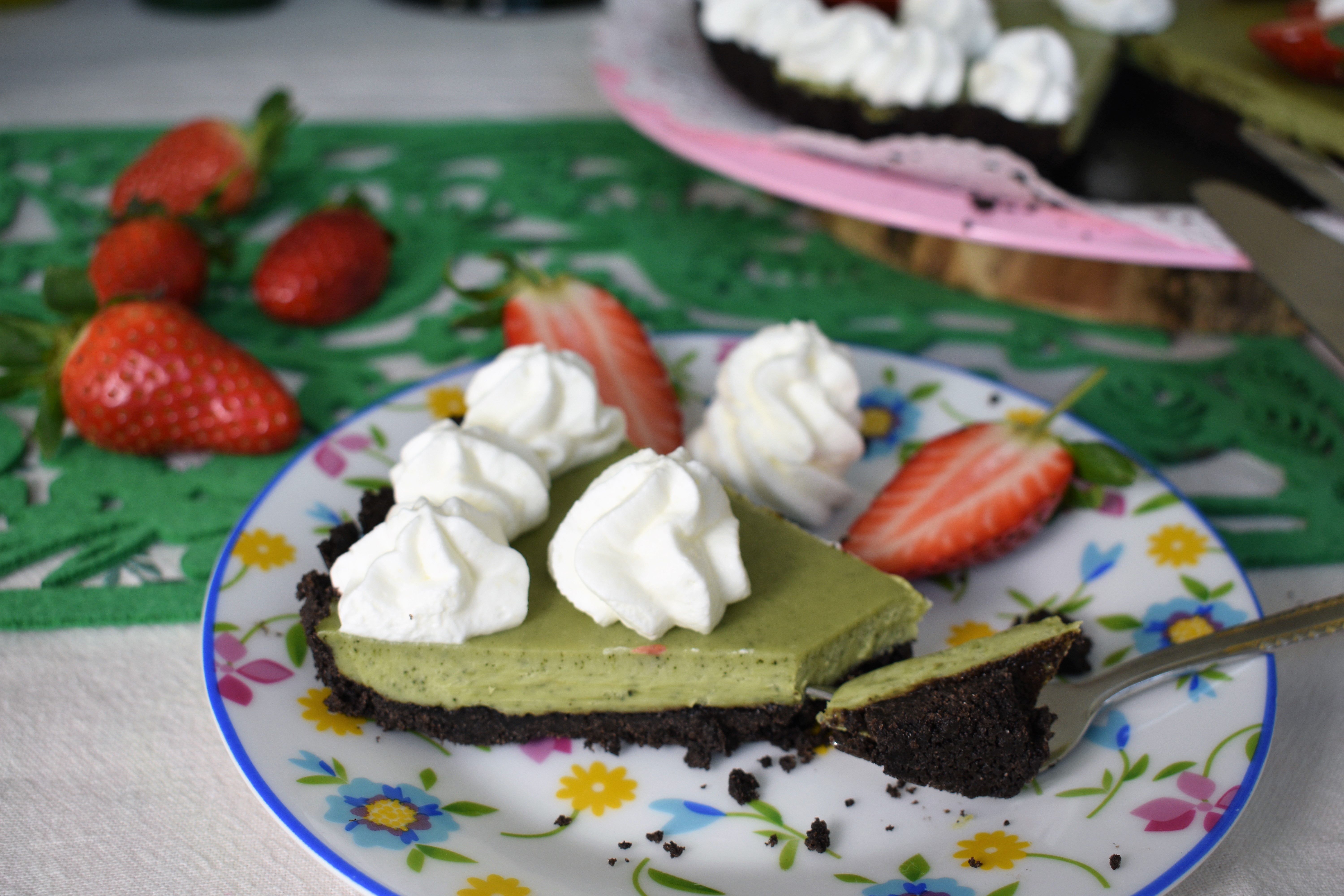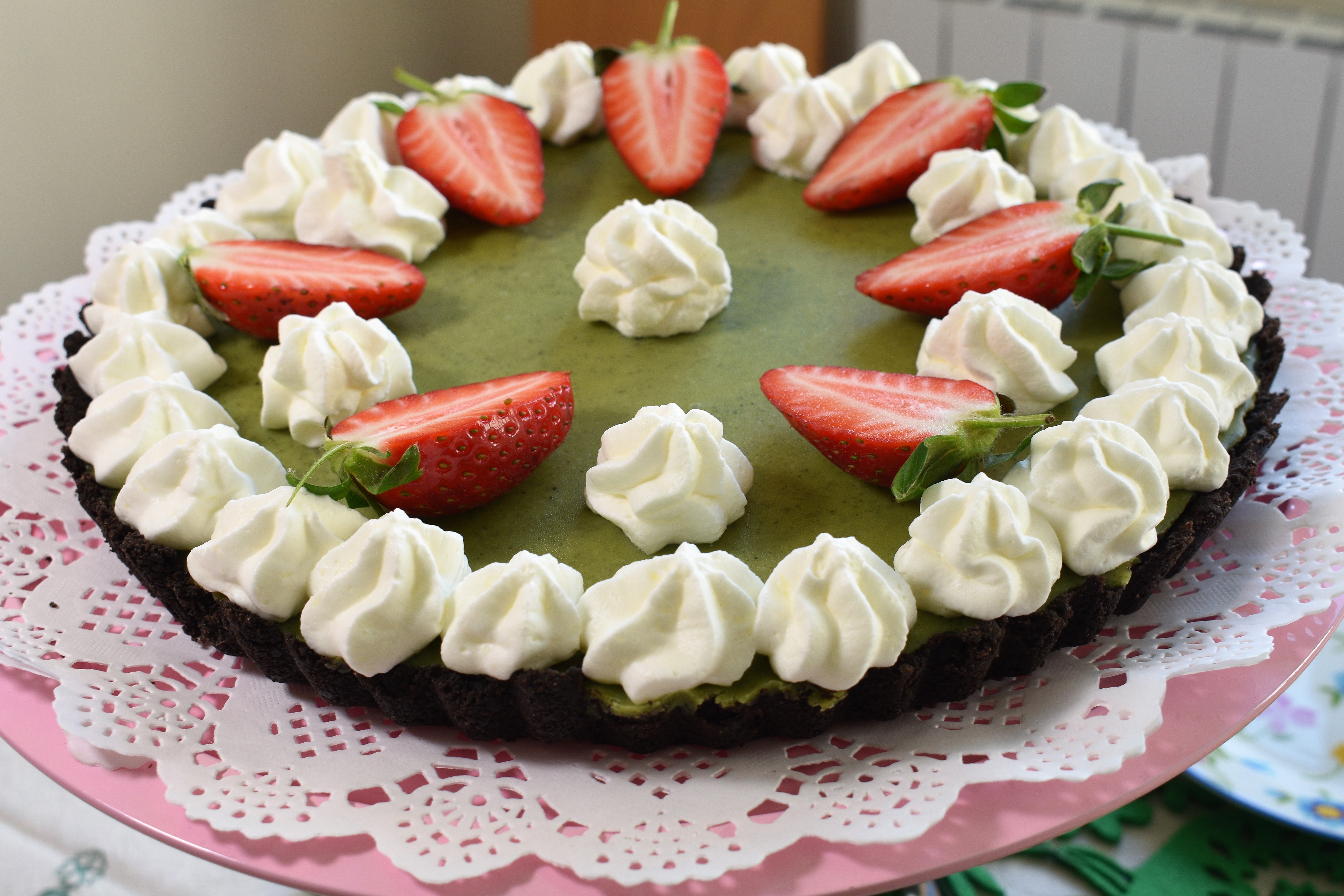 El te verde o te matcha muy conocido en Japón, tiene muchas propiedades: ayuda a reducir el estrés, el colesterol y aumentar las defensas. Desde hace unos años su uso se ha extendido en preparaciones culinarias de todo tipo. Se encuentra fácilmente es supermercados y tiendas de productos naturales. Este verano os publiqué un helado de te matcha y una pannacotta. Hoy os traigo una tarta, que como veréis combinada con chocolate es un postre exquisito. El sabor fresco del té, junto al chocolate hace de esta tarta un postre delicioso. No lleva horno, lo cual es una ventaja sobre todo en verano. Aunque yo la hice este domingo y encantó a grandes y chicos por igual.