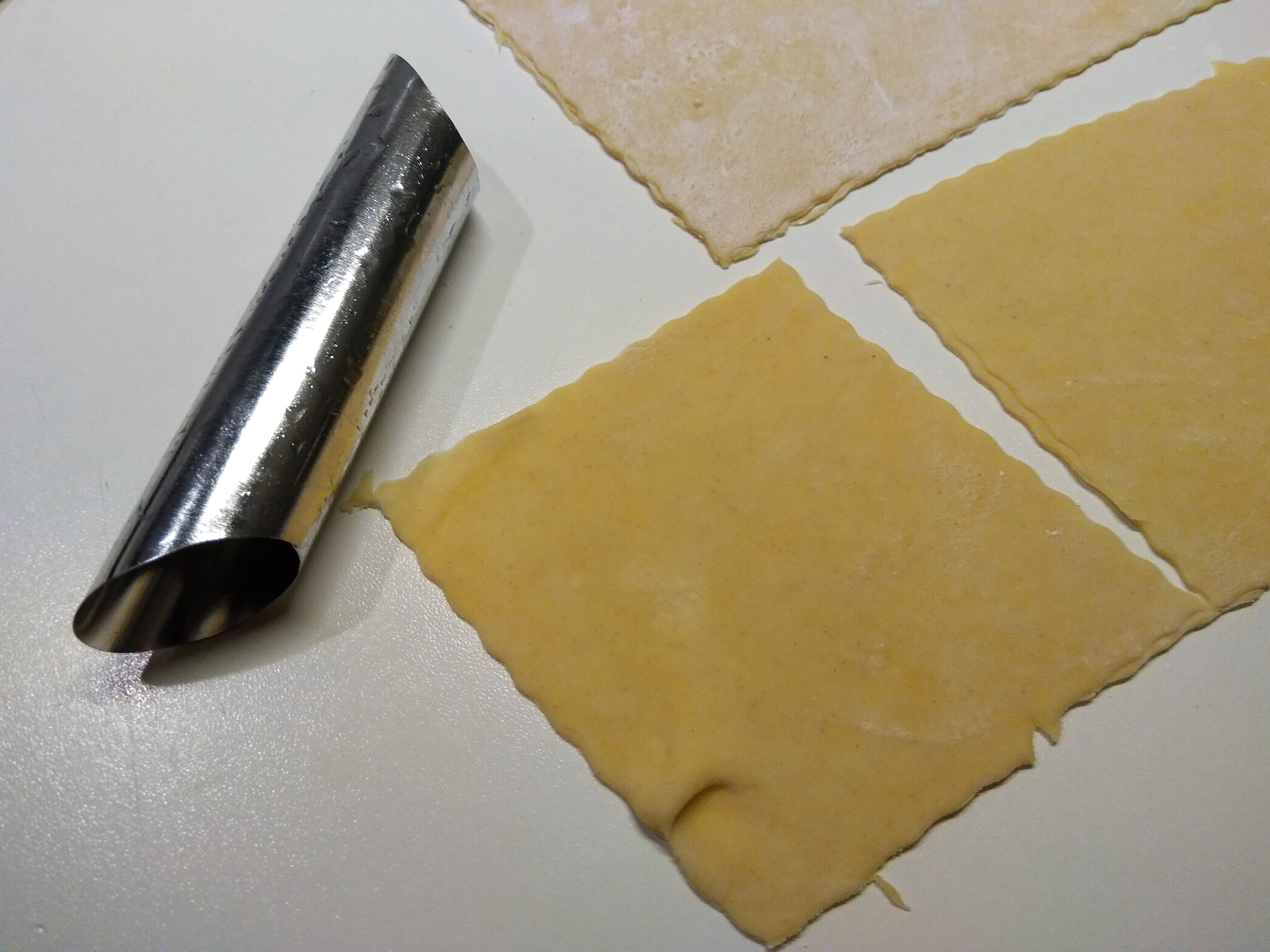 - Para darle la forma perfecta, cortamos la masa con un cortapastas. Antes de practicar el corte dejamos que la masa se relaje, dándole la vuelta de nuevo. Se encoje un poco y después ya conserva su forma.