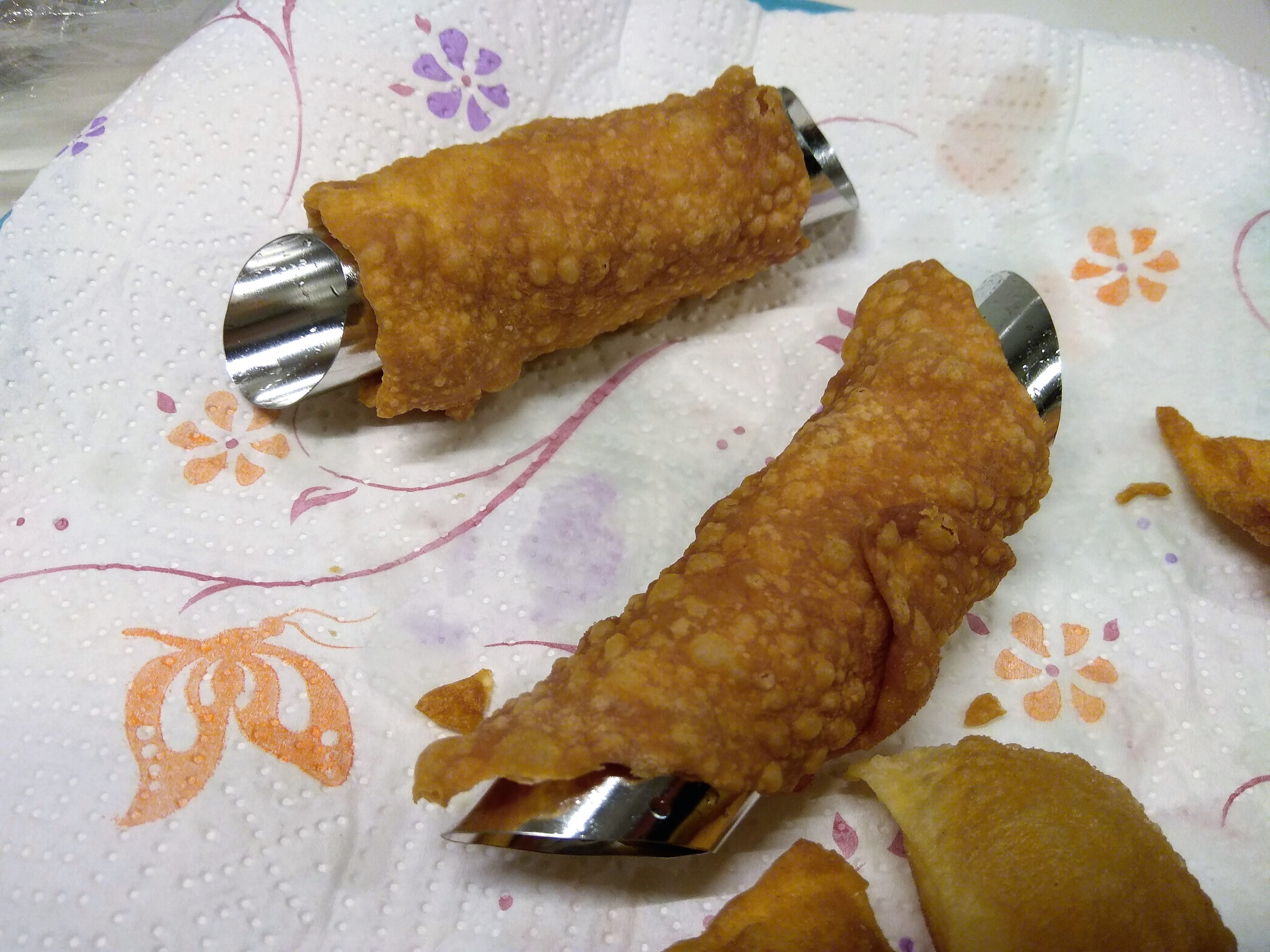 - Con ayuda de un molde metálico para canutillos, conformaremos el cilindro, pegamos sus extremos con agua y freimos en aceite de oliva a 170º aproximadamente.