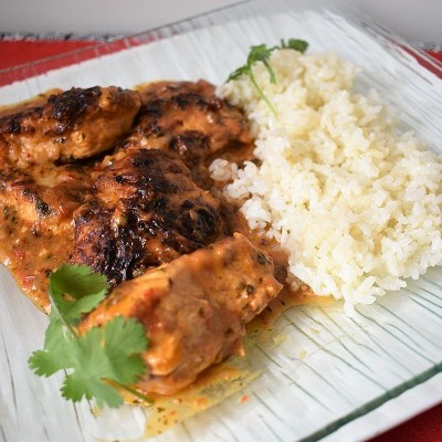 - En una cazuela de barro o fuente de horno colocamos el pollo, la salsa de maceración y la leche de coco. Horneamos a 180º C durante unos 20 minutos con ventilador y durante 10 minutos con calor arriba y abajo para que tome color.