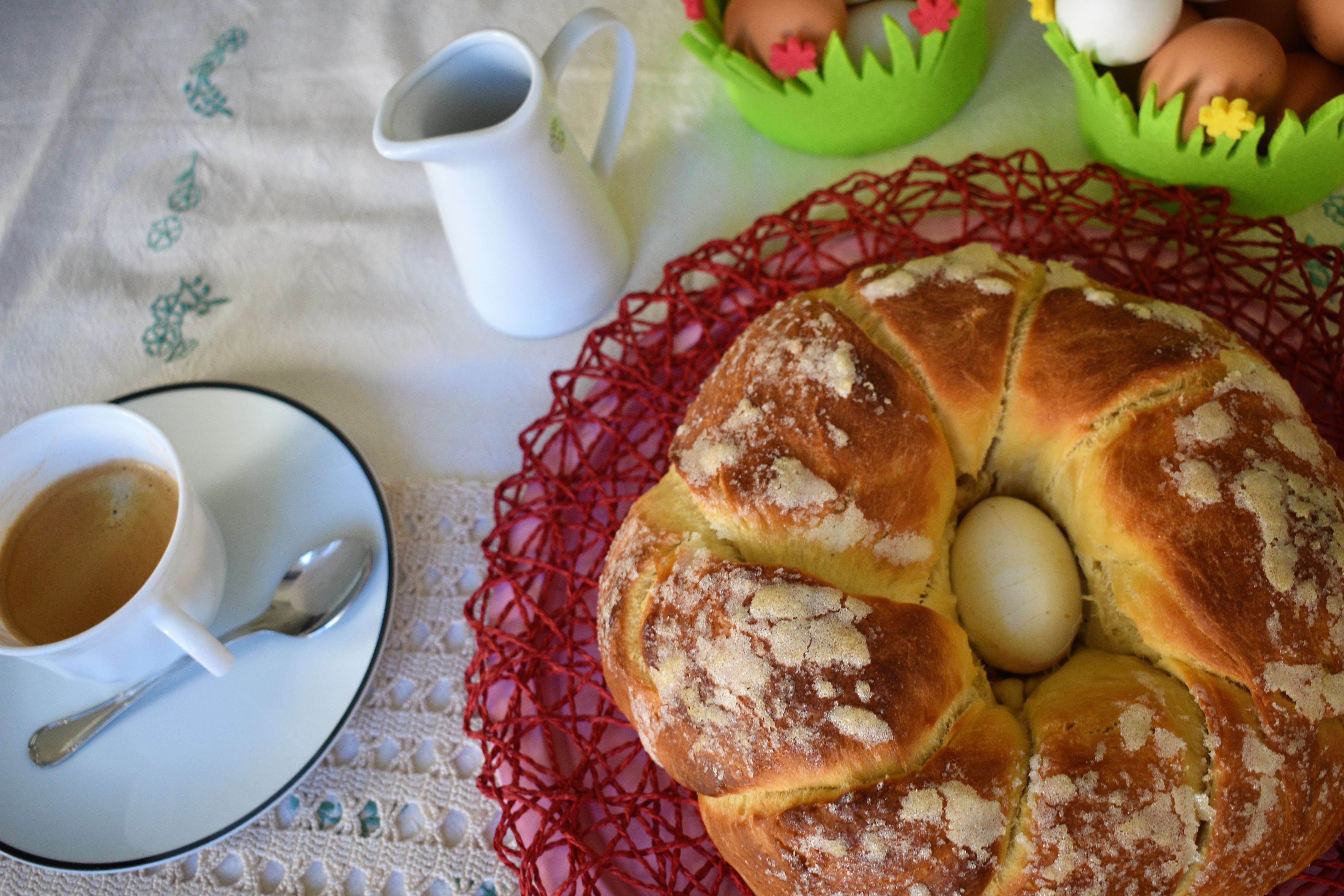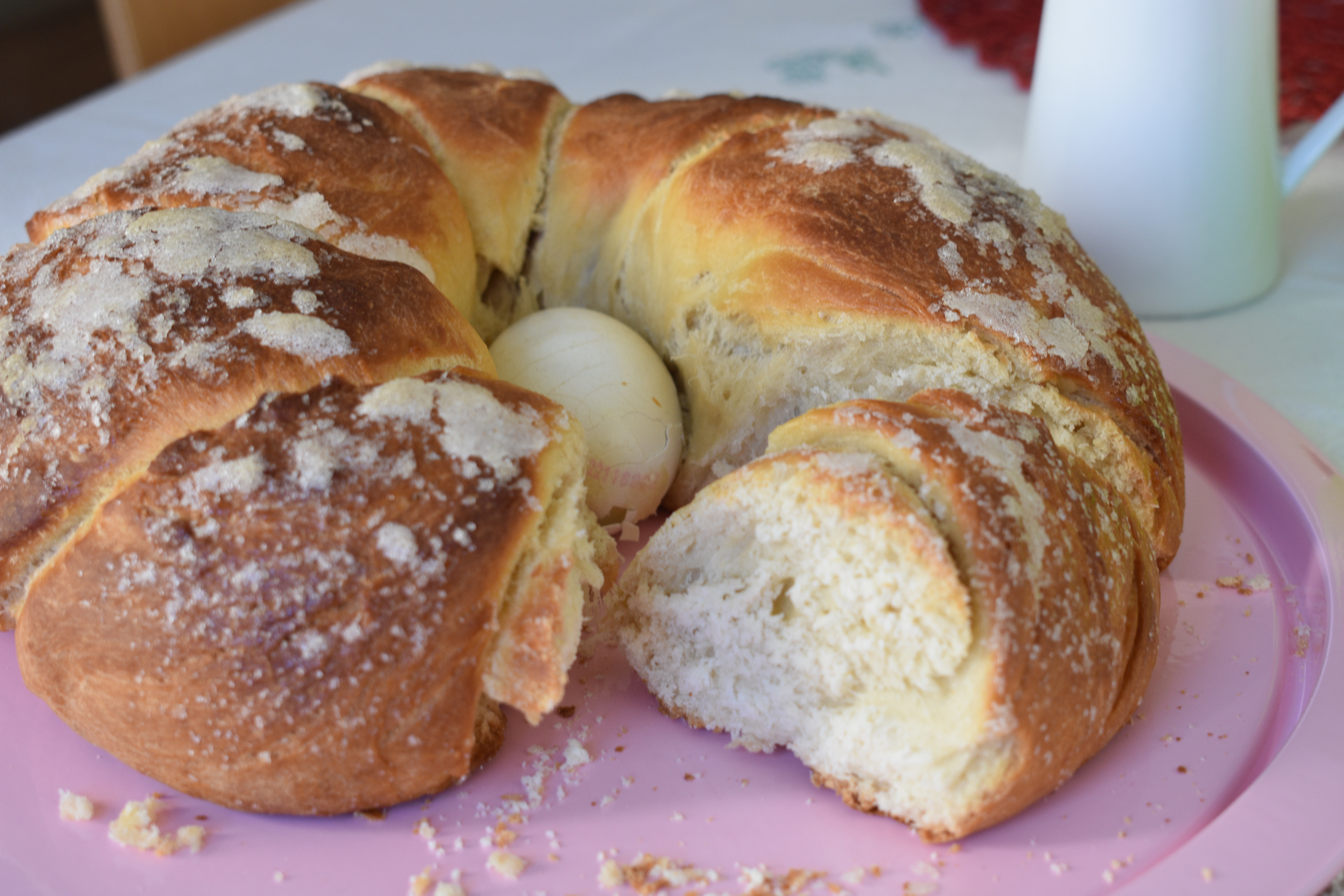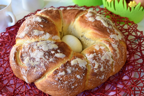 - Cuando la masa haya doblado enharinamos la mesa y la volcamos. Aplastamos con las manos para quitarle el gas. Boleamos suavemente la masa, hacemos un agujero central, como si fuéramos a formar un roscón de Reyes, pero sin estirar la rosca. También podemos hacer dos bolas, las estiramos rodando cada bola para formar dos tiras y trenzamos. Ponemos en el agujero el huevo cocido y dejamos que doble el volumen.