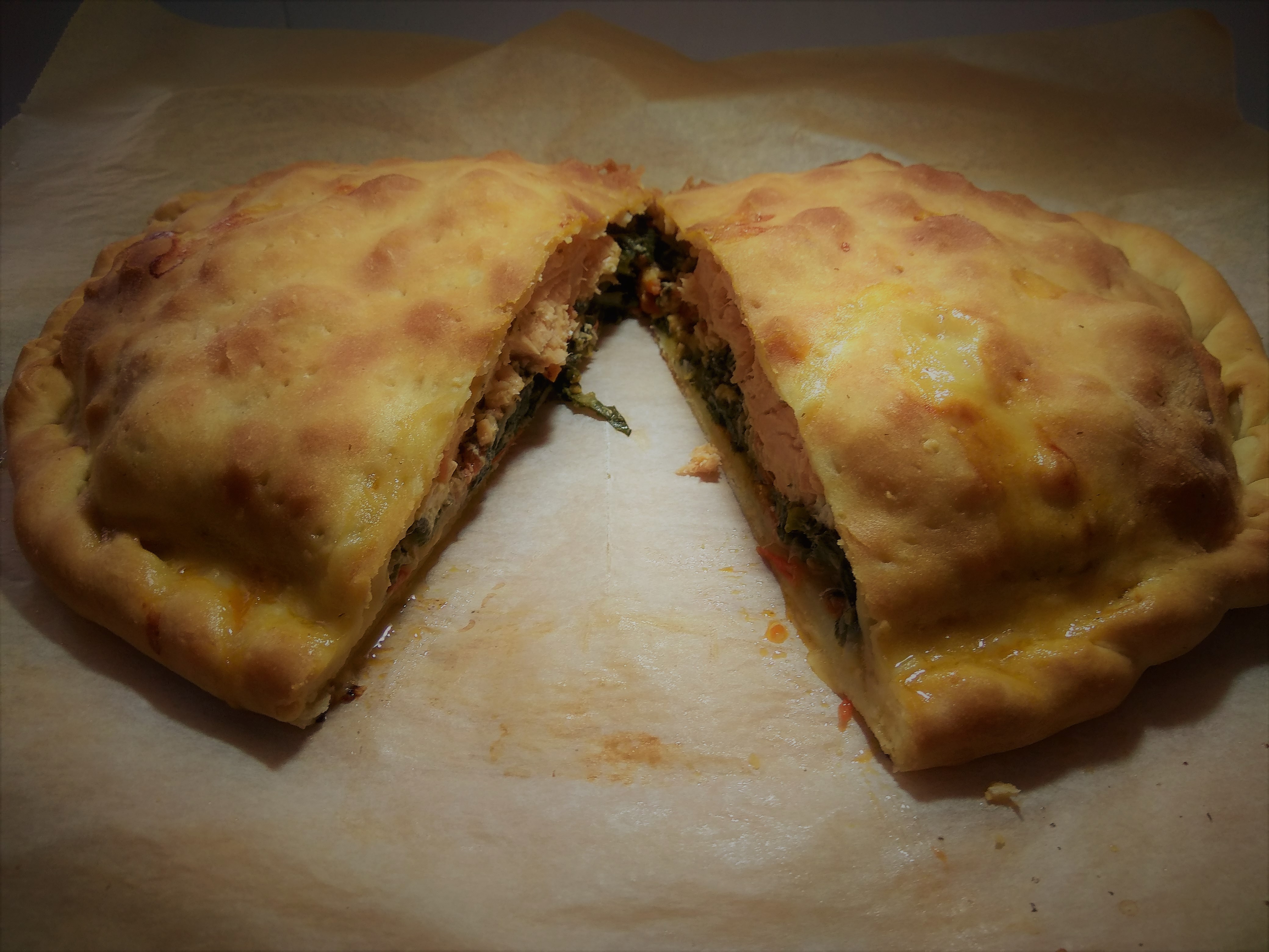 - Estiramos la masa y colocamos sobre un papel en una bandeja de horno. Colocamos el preparado en la superficie de la mitad de la masa estirada, dejando libre los bordes. Partimos el salmón en tiras, salamos y distribuimos por encima del relleno.