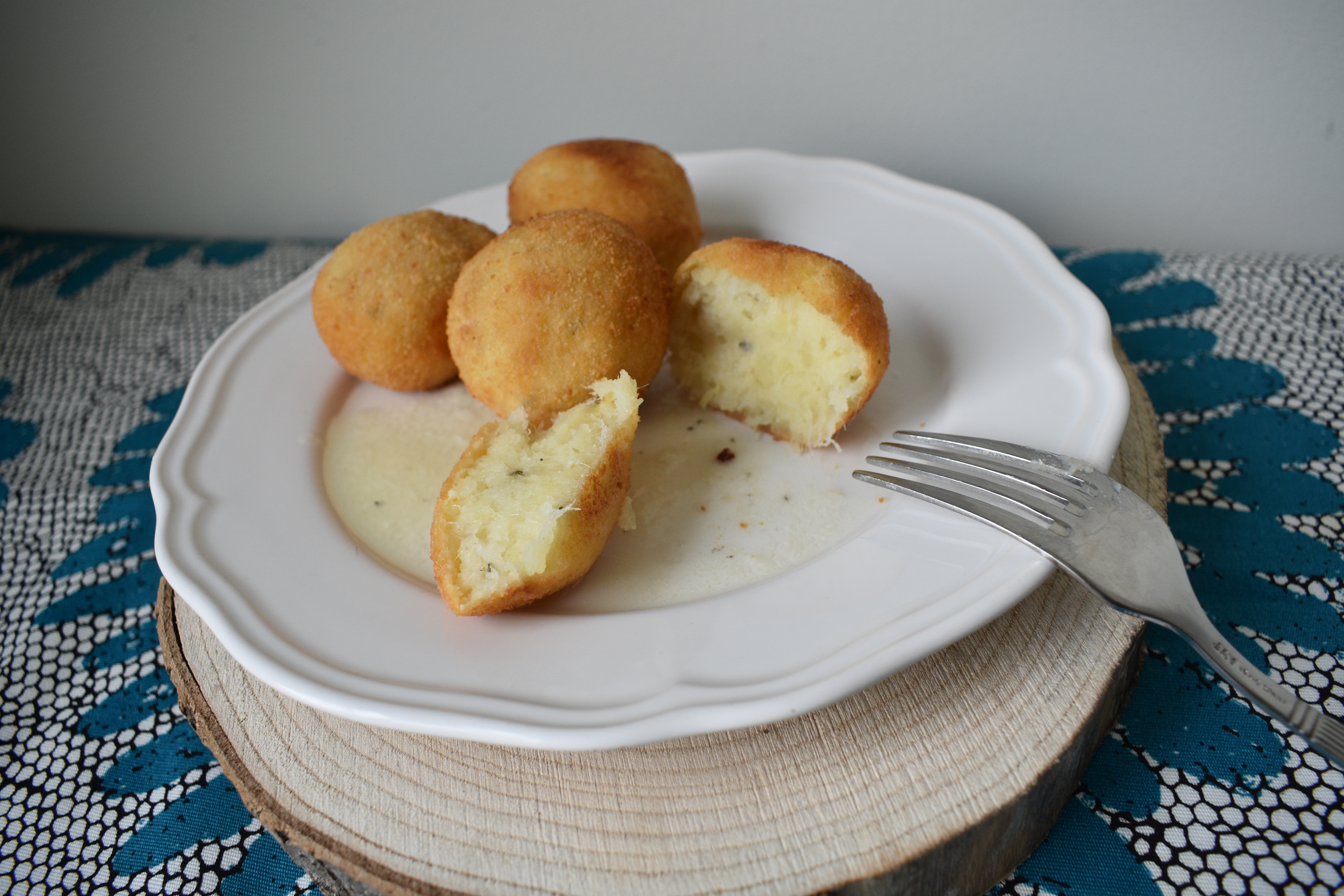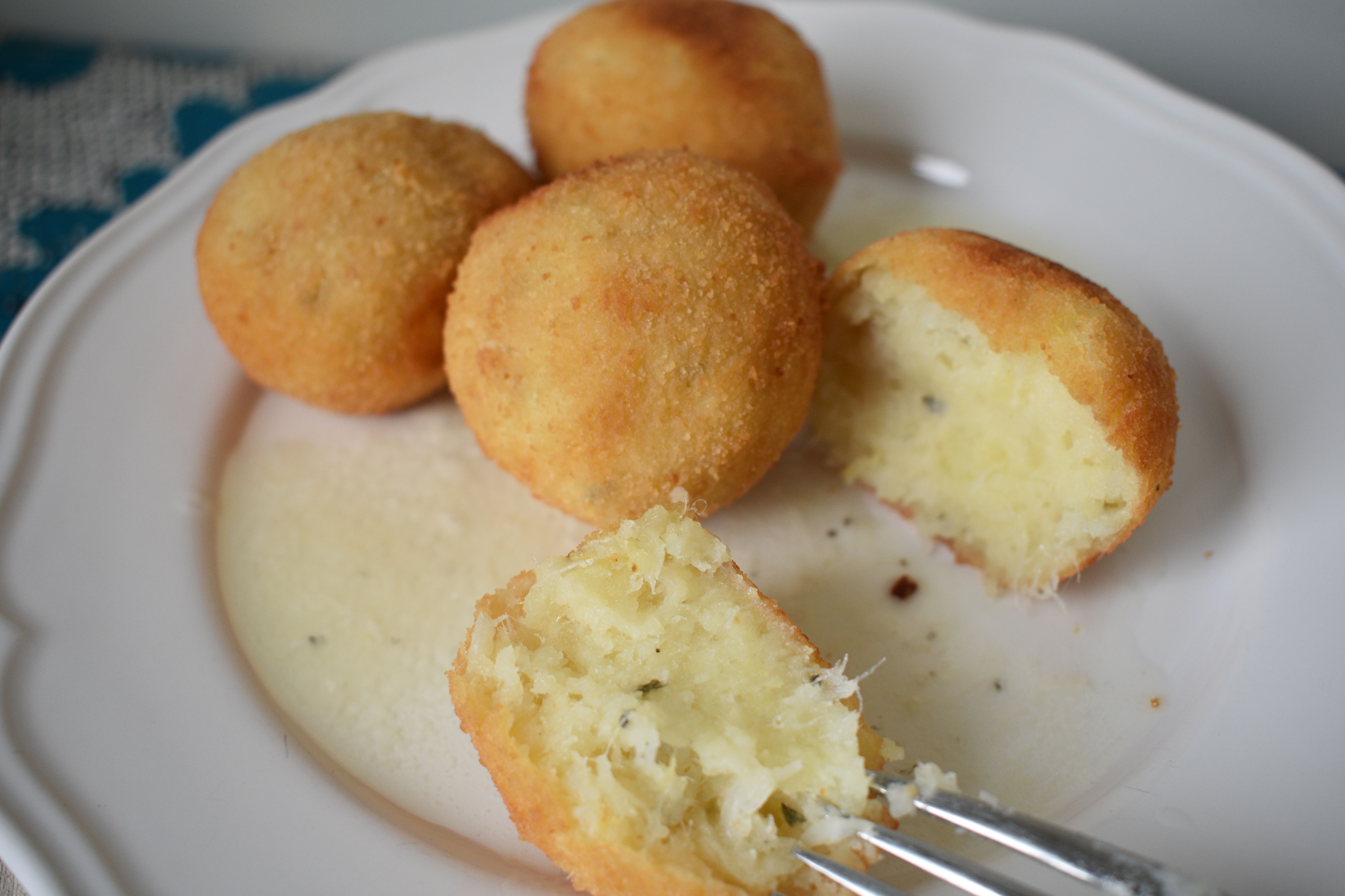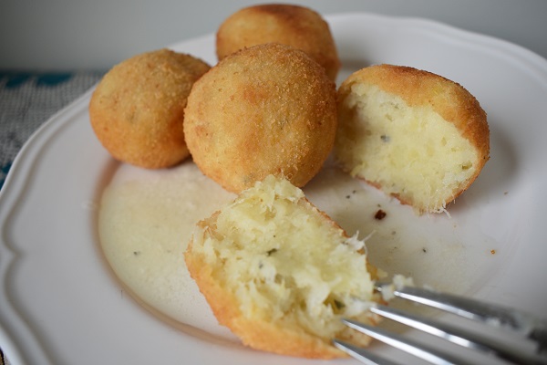 - Una vez fría la masa, tomamos pequeñas porciones y formamos las bolitas. Las pasamos por huevo batido y pan rallado y freímos en aceite caliente a 170º durante 5 o 10 minutos, dando la vuelta con una cuchara para que quede uniforme la cocción. Ponemos sobre papel para eliminar el exceso de aceite y servimos.