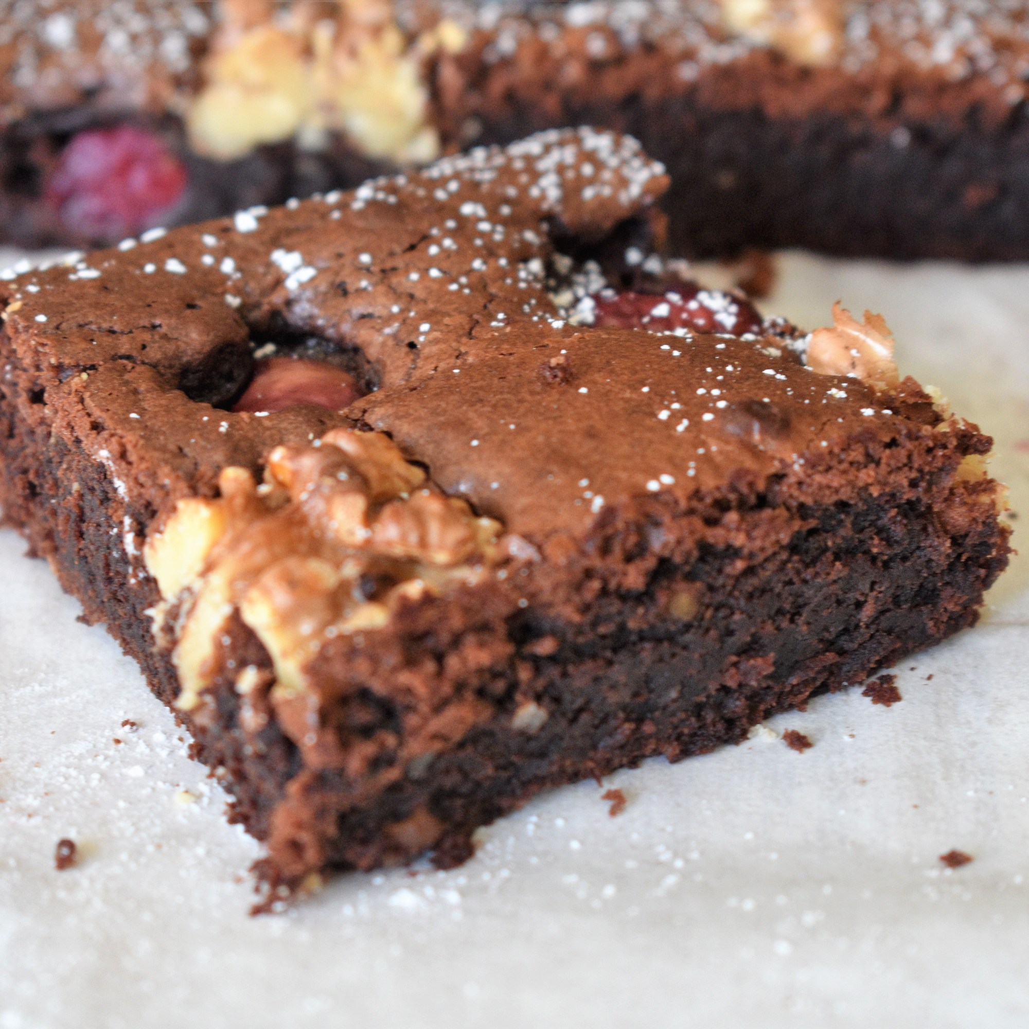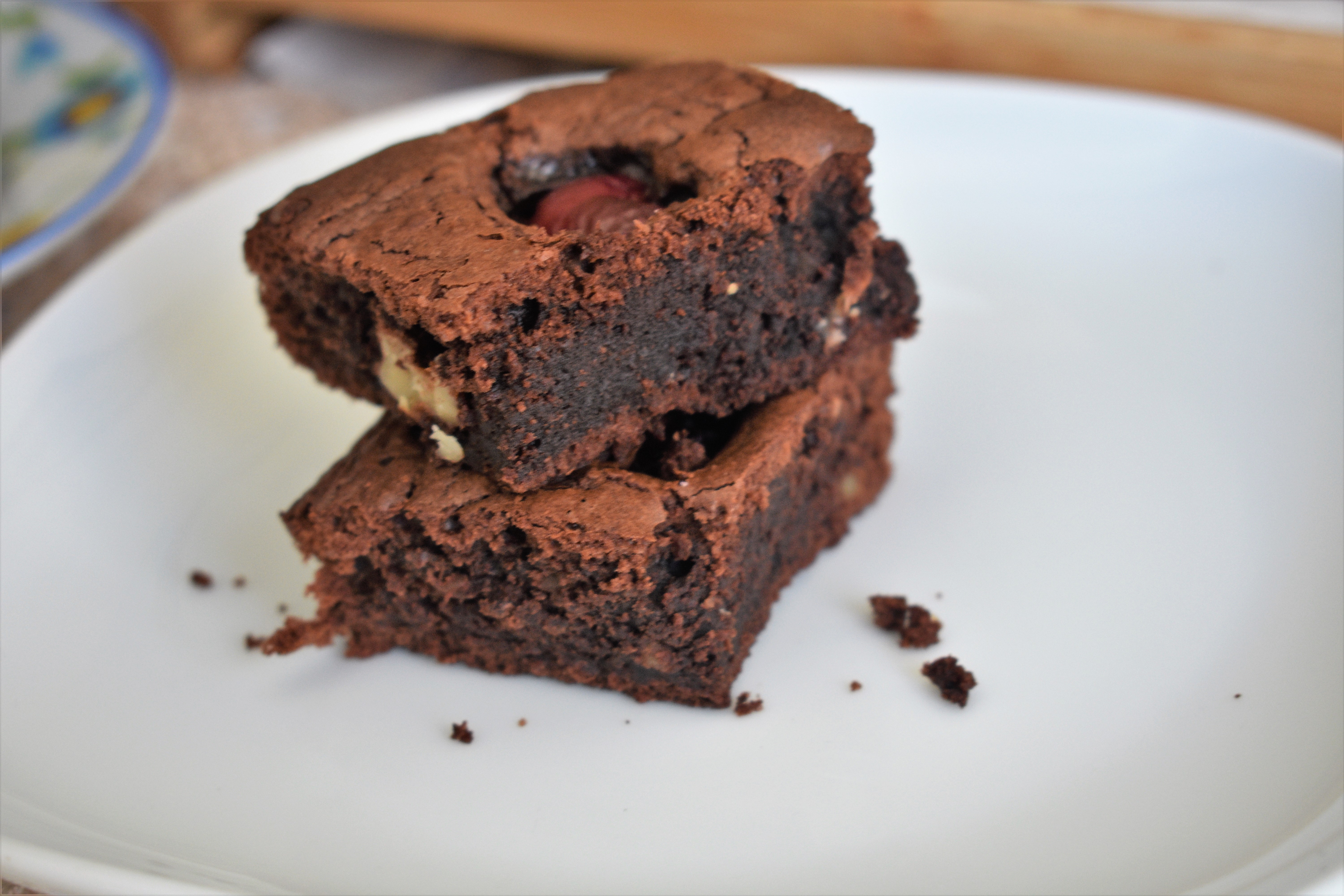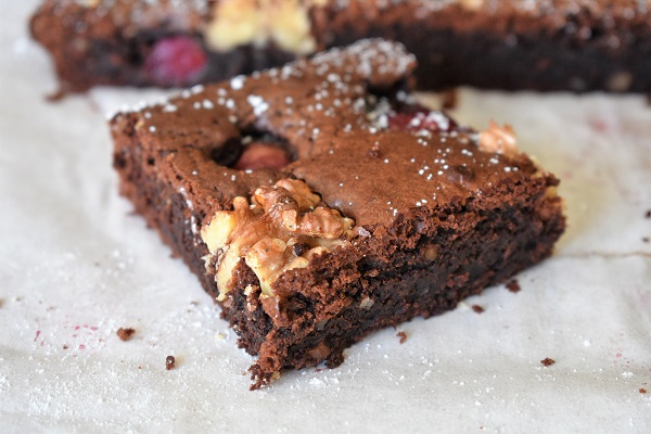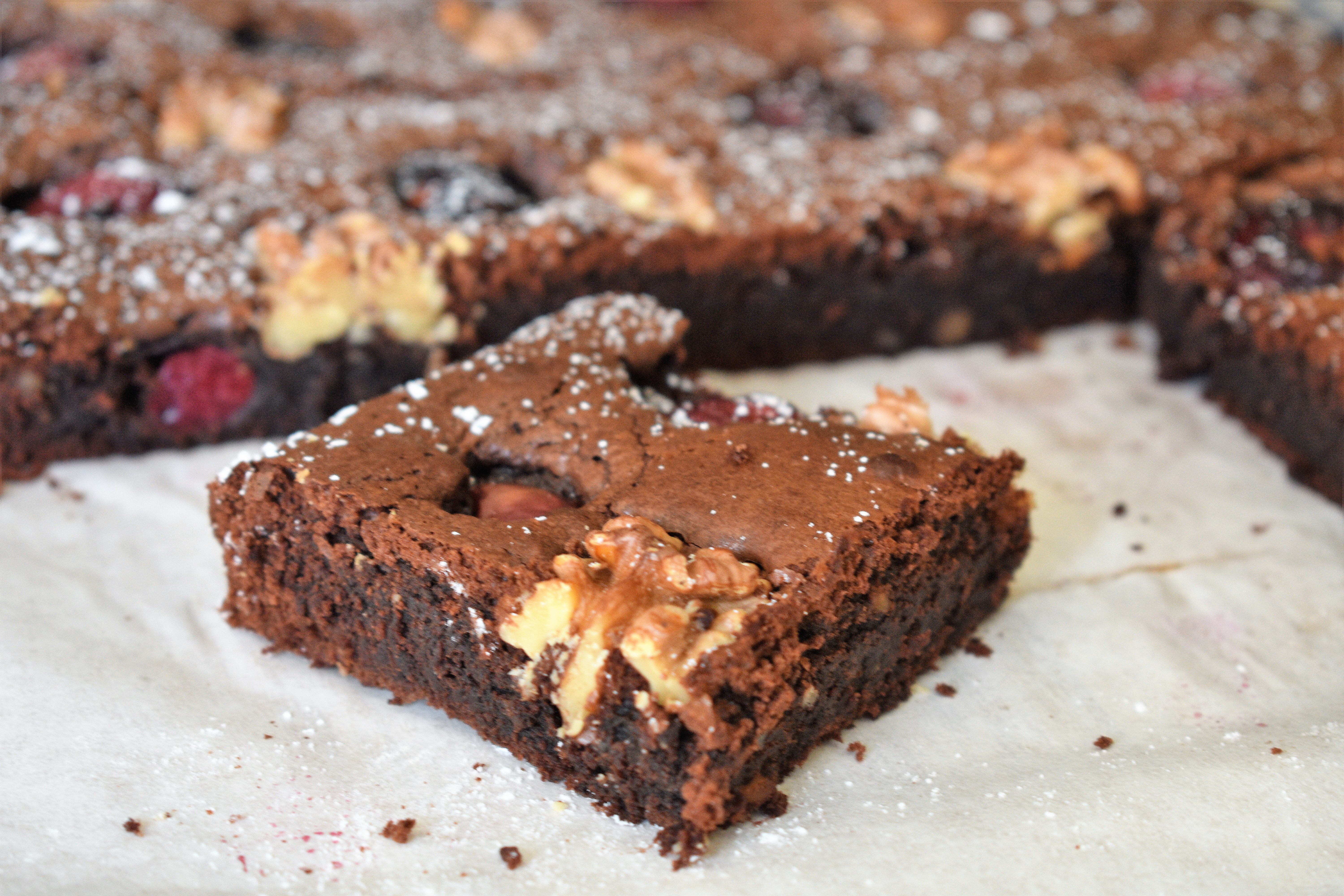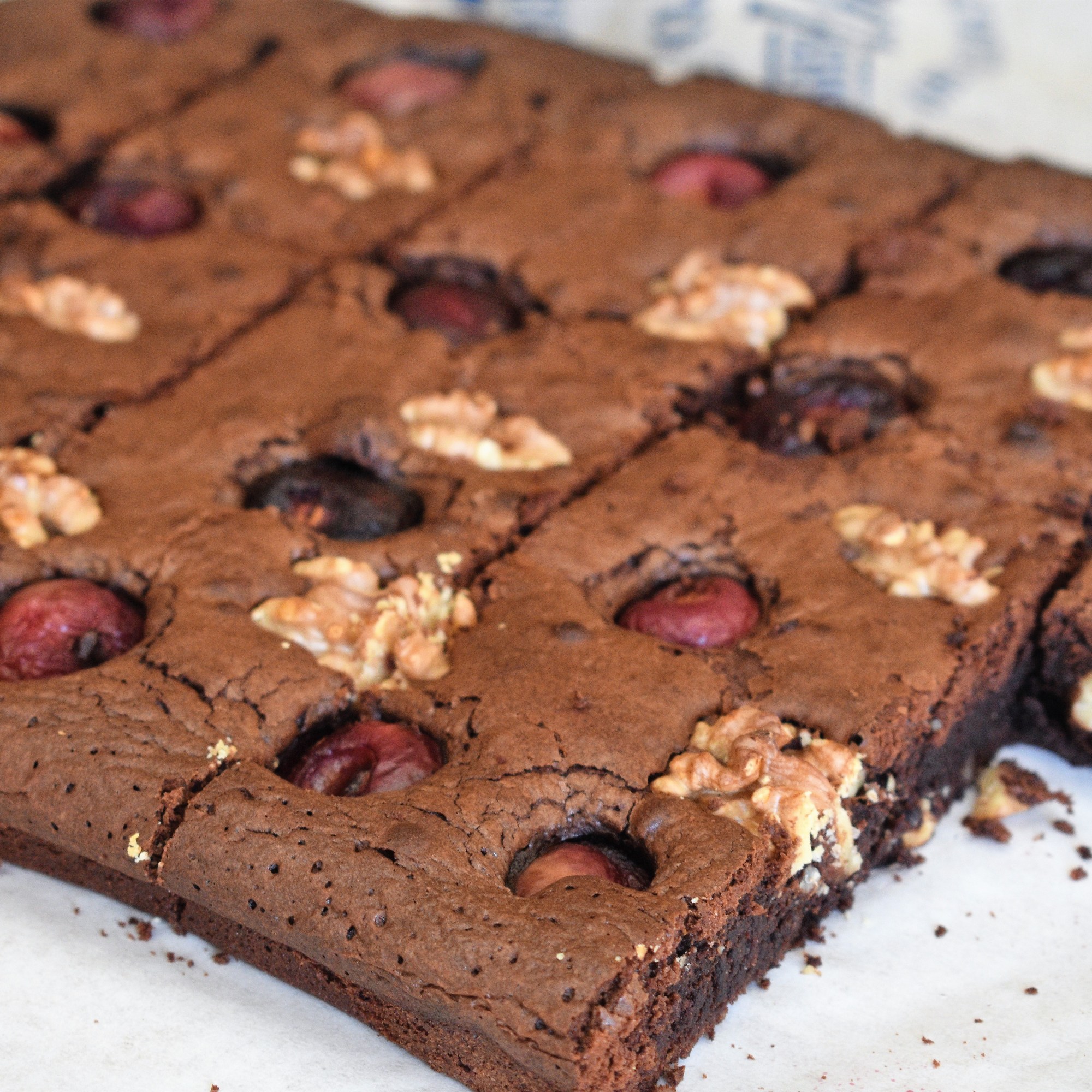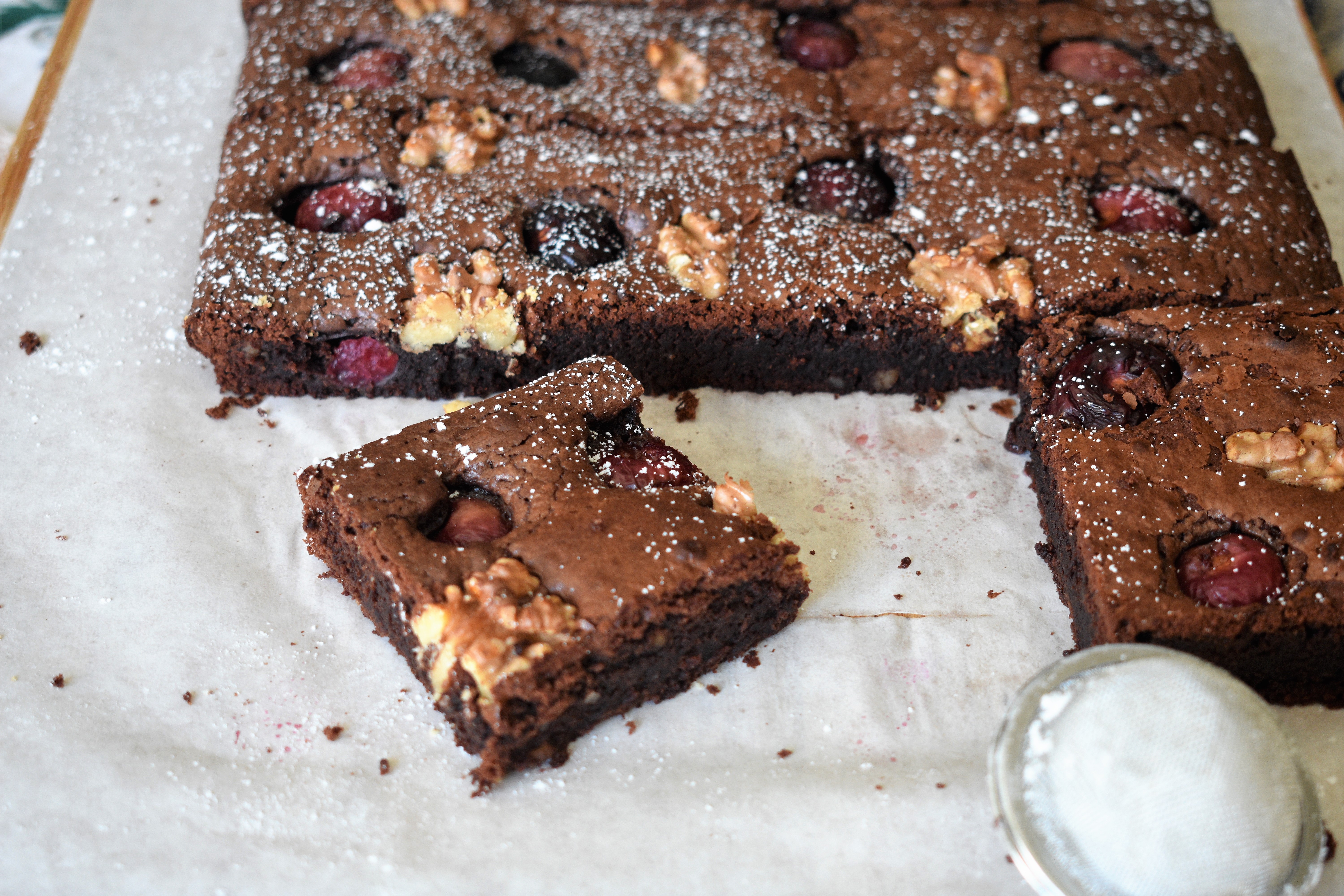 El brownie es un típico bizcocho pequeño de chocolate típico de la repostería americana, que debe su nombre a su típico color marrón ( brown) oscuro. Este bizcocho compacto se creó cuando un importante repostero norteamericano se olvidó de echar levadura a su bizcocho de chocolate. Se suele hacer en un molde cuadrado de 25×25 cm. En mi caso he usado un molde rectangular, por lo cual me ha quedado más plano, que es como a mí me gusta ya que es muy contundente y me gusta para acompañar un rico helado. He seguido una receta que circula en la red de Jamie Oliver que lleva cerezas y nueces. Quería aprovechar las primeras cerezas que están en el mercado, y el resultado es maravilloso.