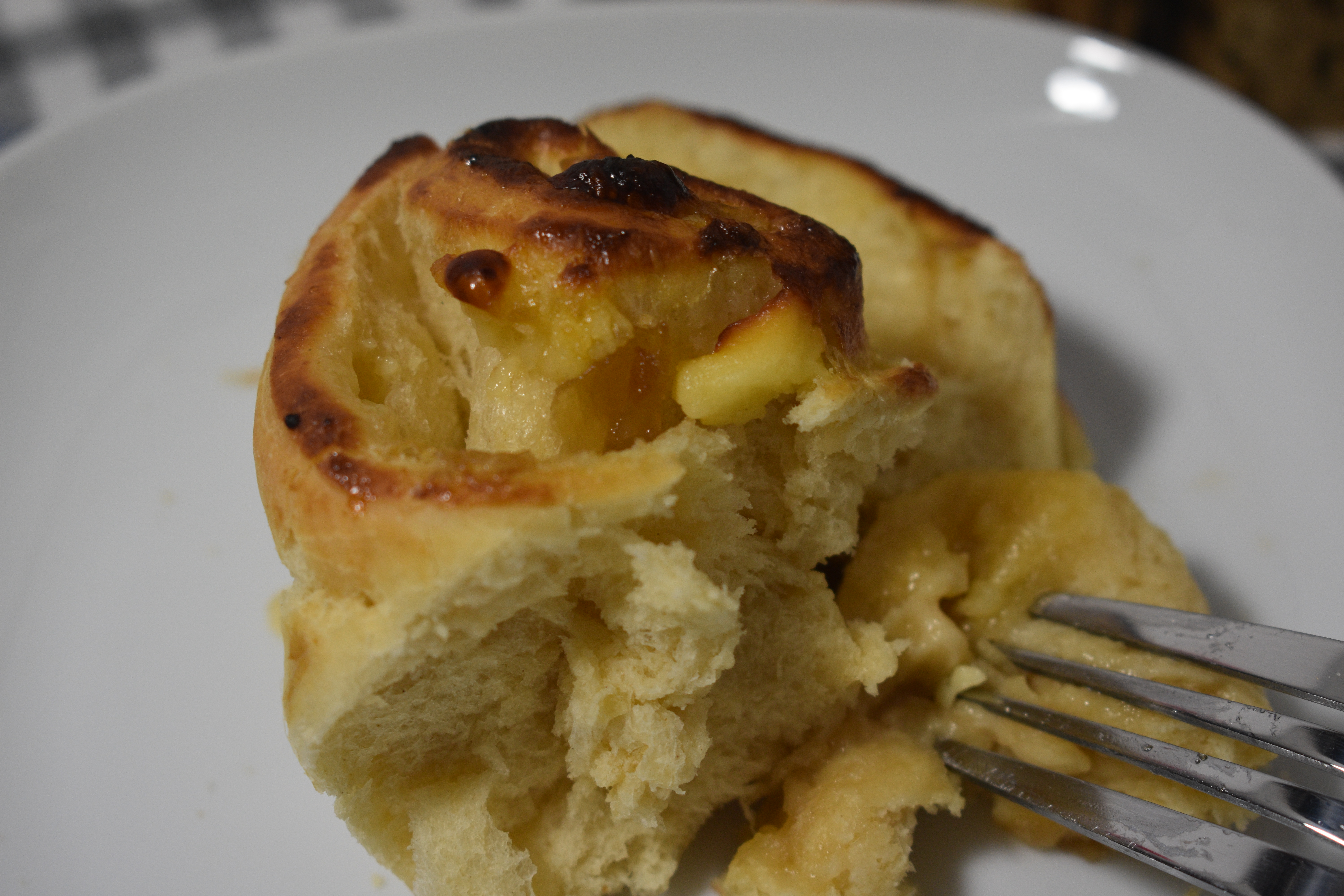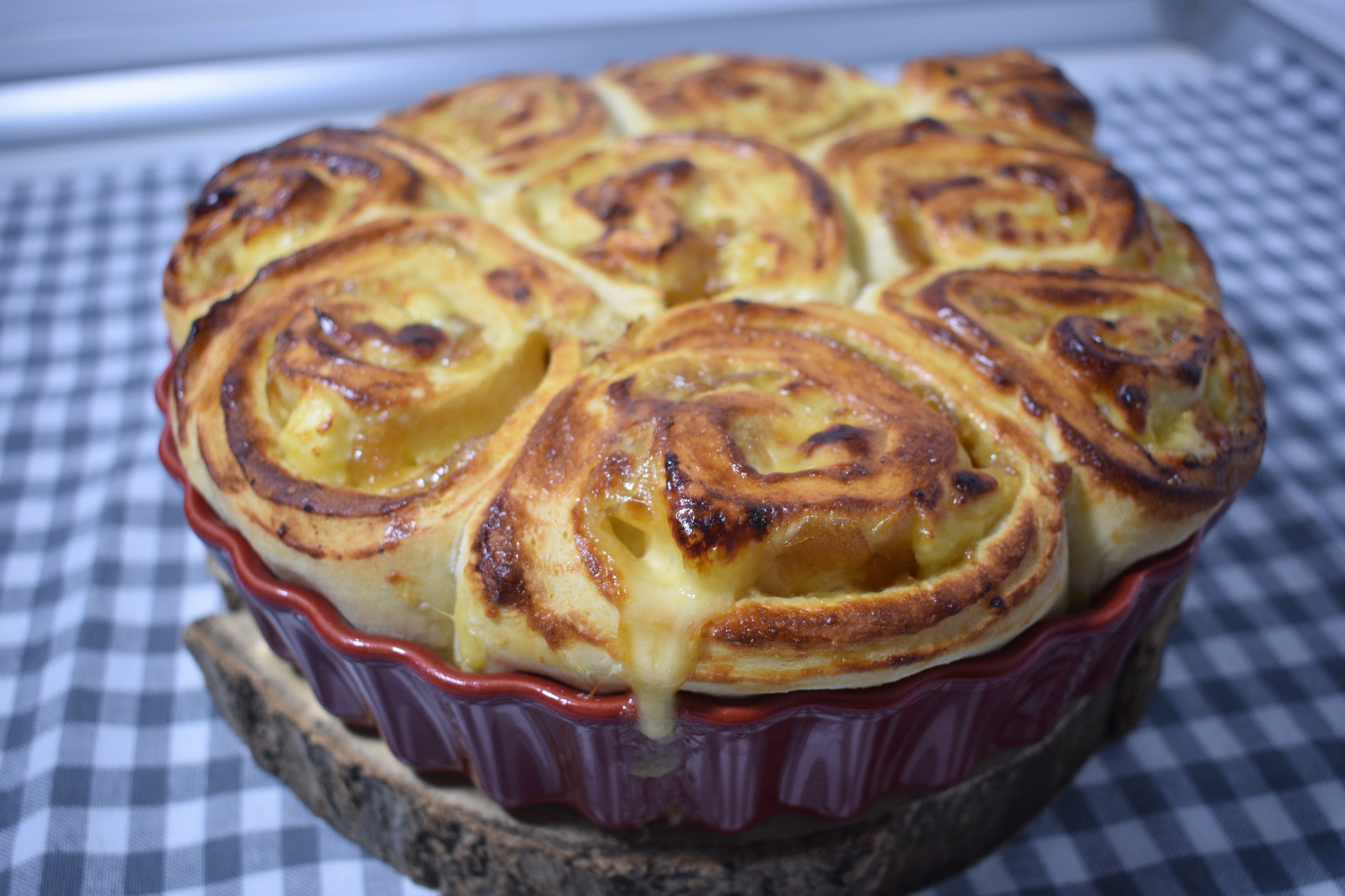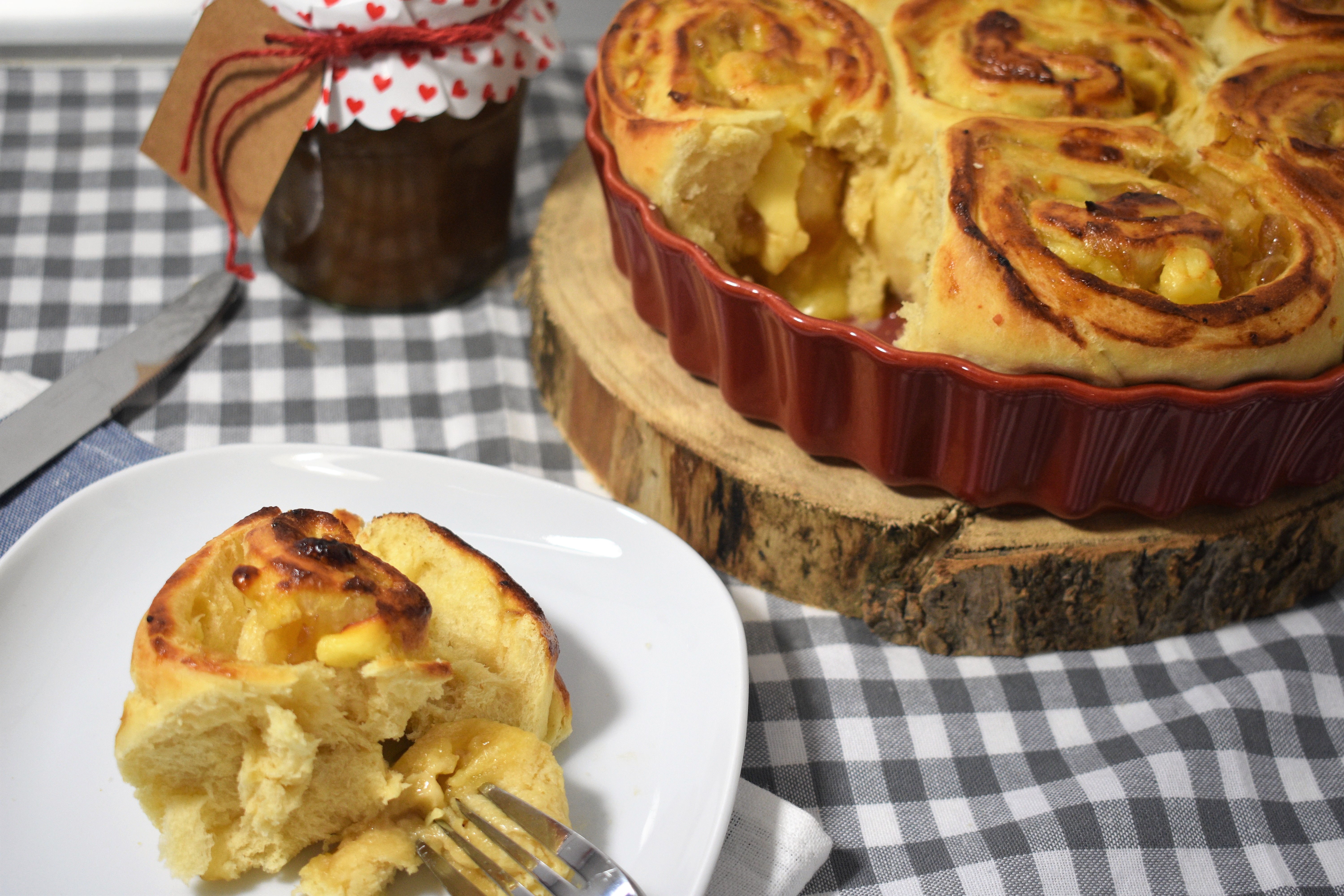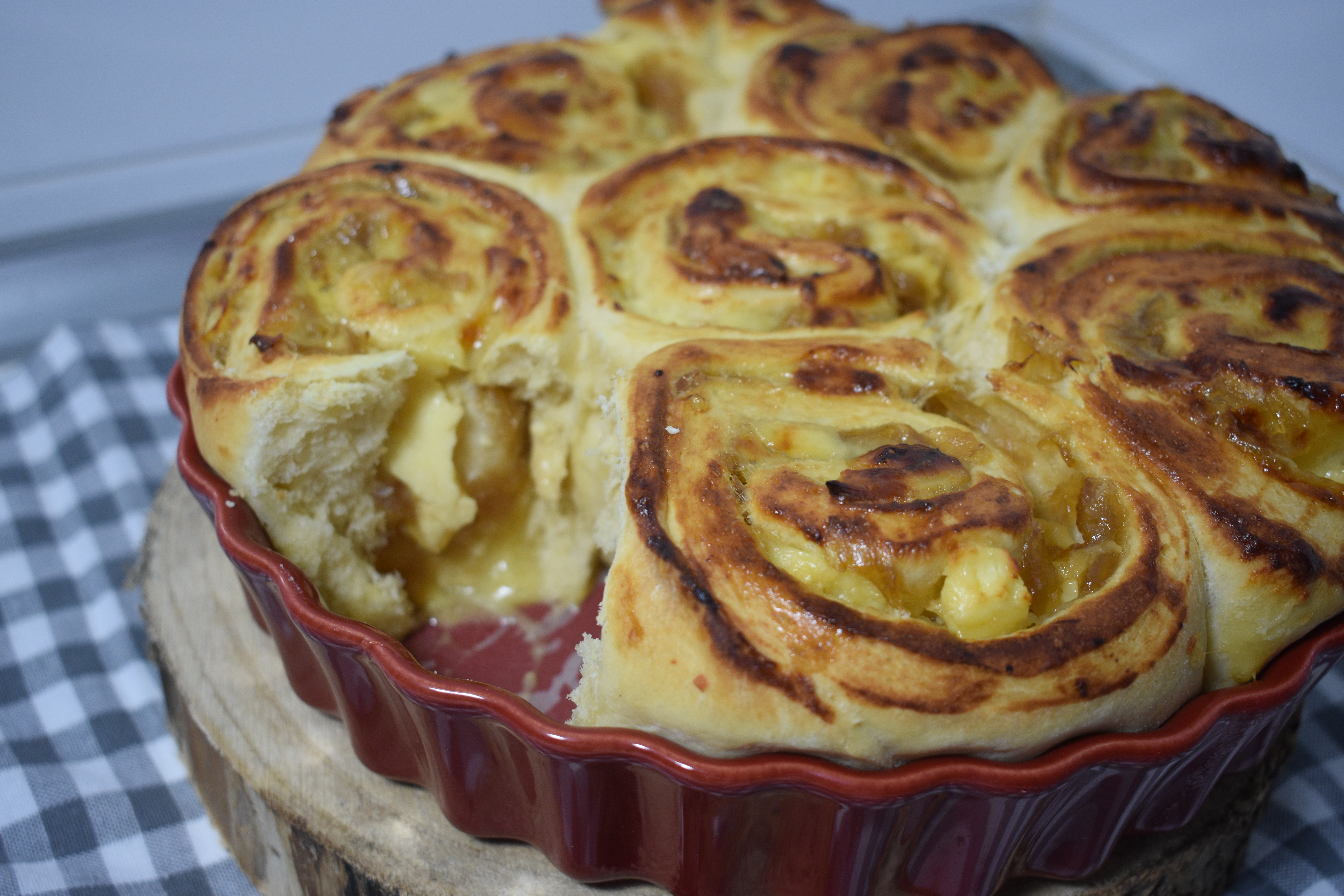 4. Estiramos la masa formando un rectángulo de unos 35x45cm y añadimos el relleno. Untamos bien con la mermelada de cebolla, excepto por unos de los bordes del largo. Colocamos el queso en lonchas finas y enrollamos. Pegamos el borde con agua.