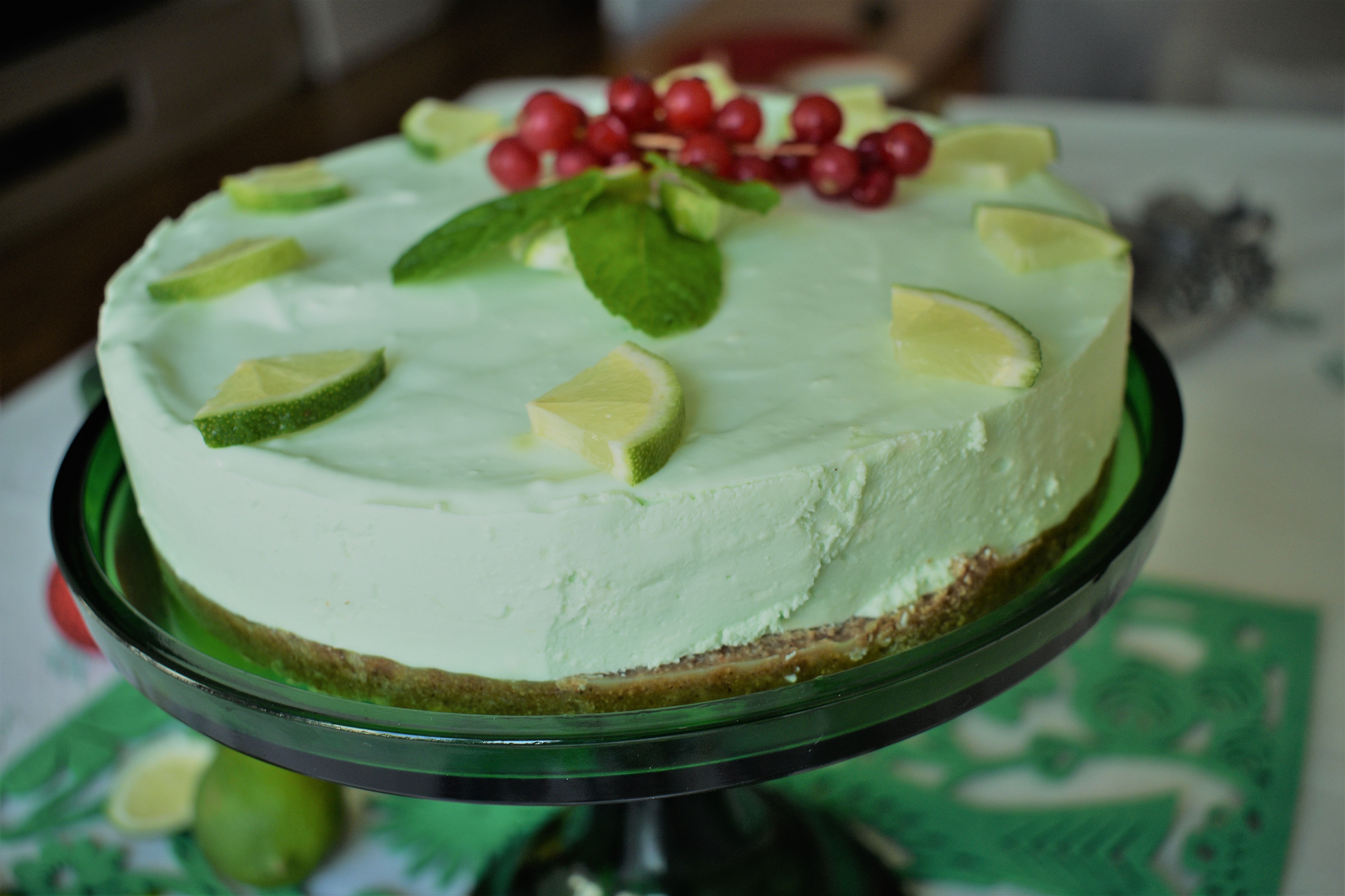 - Vertemos sobre la base de galletas y llevamos a la nevera al menos durante 4-5 horas. Decoramos con trocitos de lima, menta y grosellas.