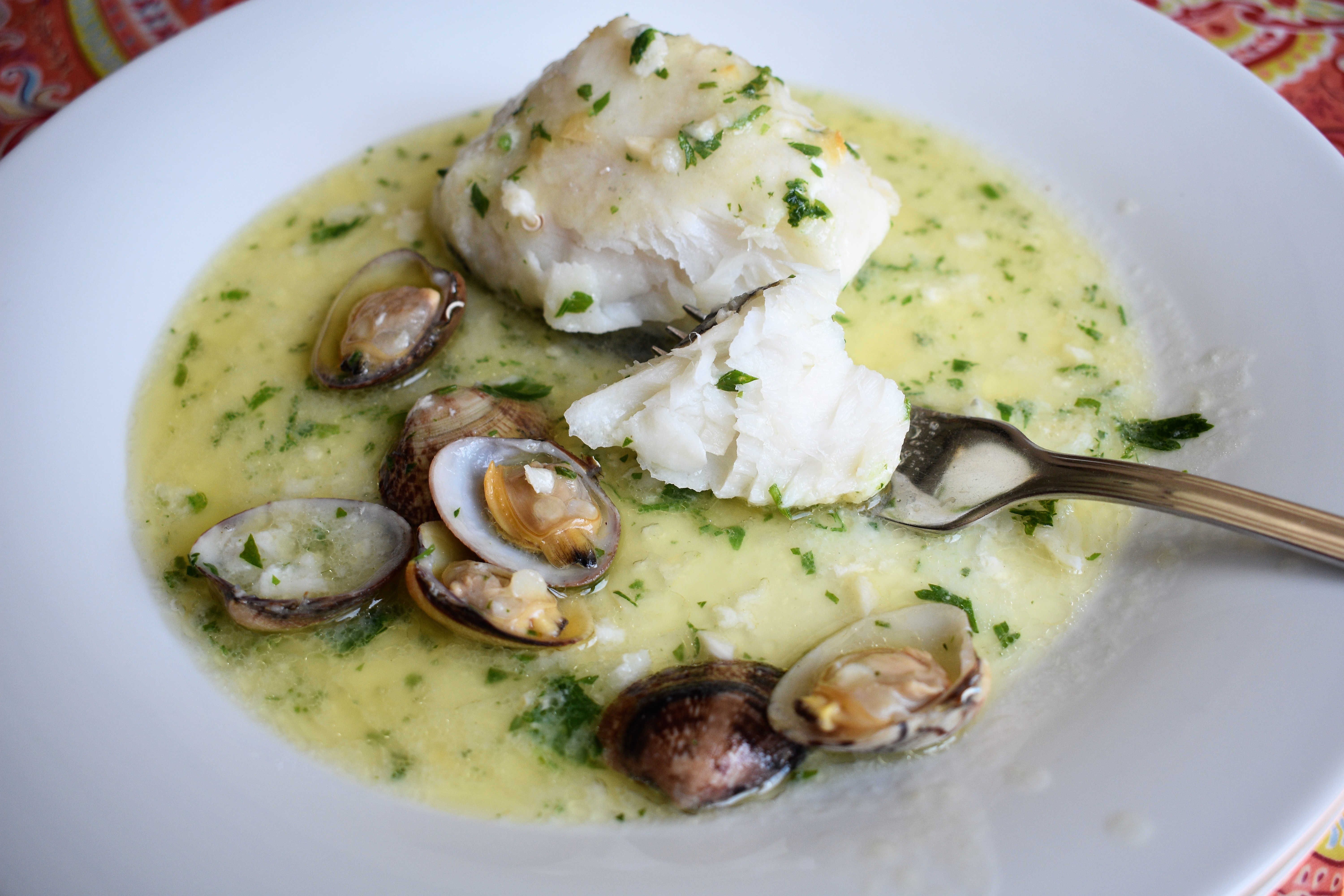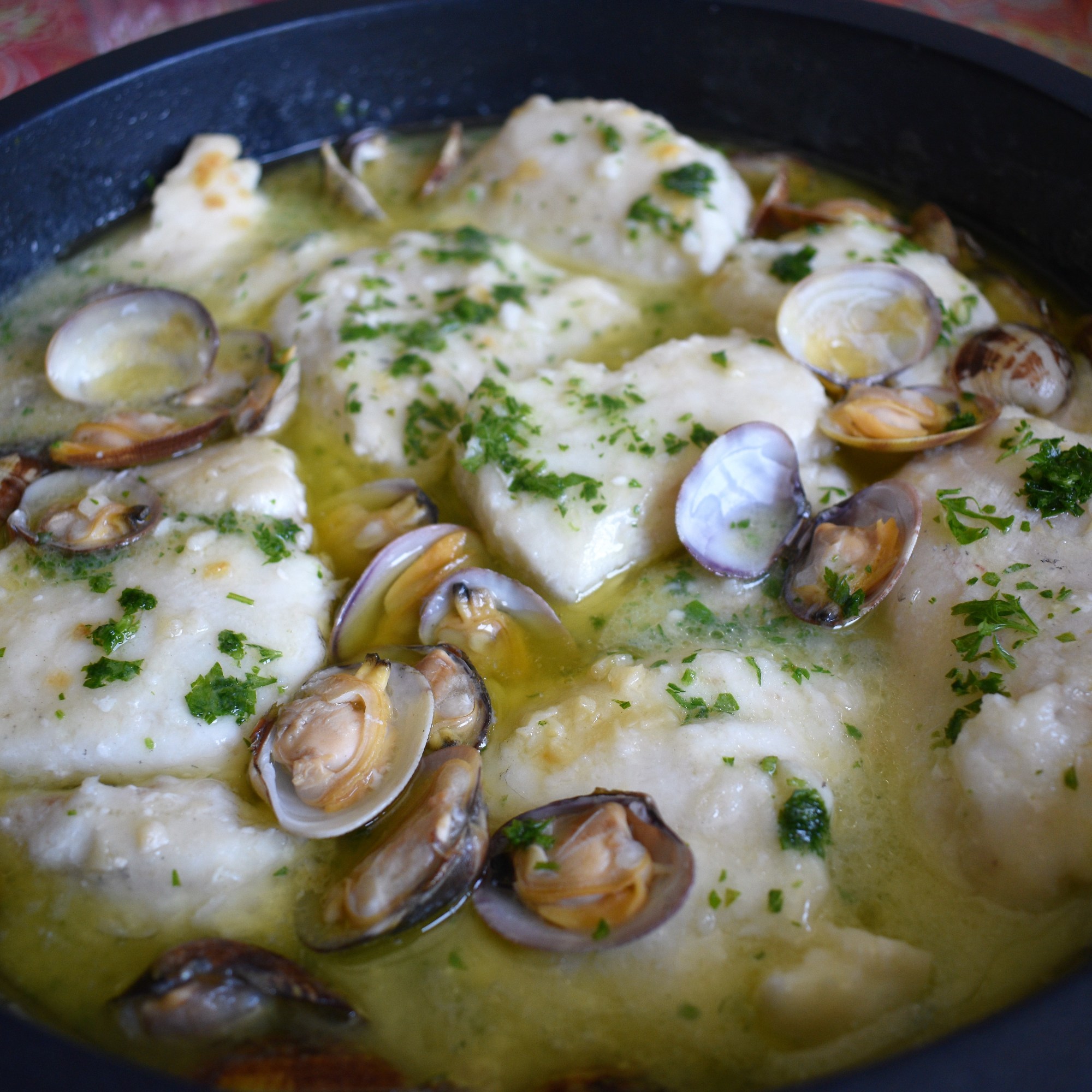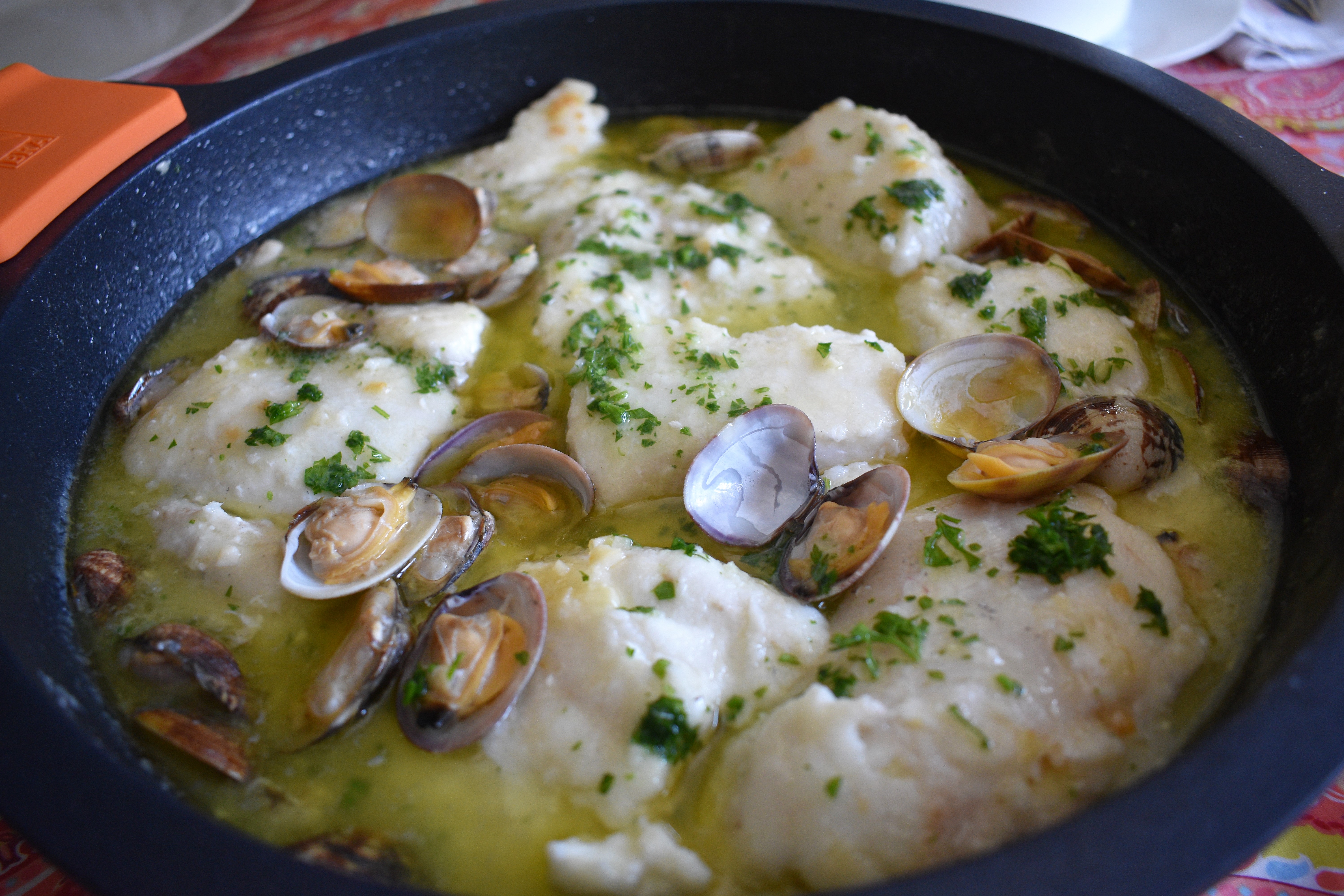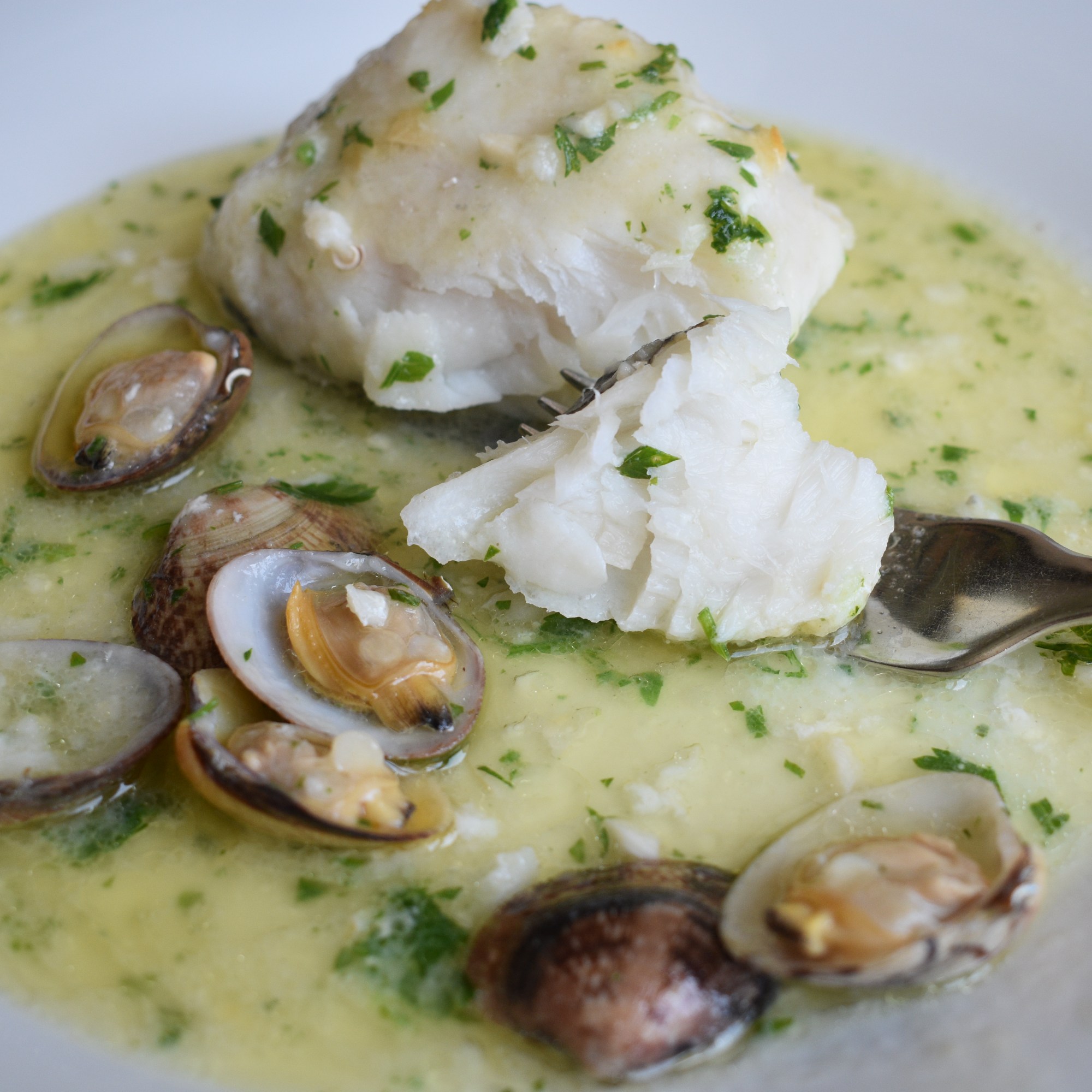 La salsa verde no es más que una emulsión que surge de la unión del aceite de oliva, el jugo que suelta el pescado, y la algina, que es una sustancia que desprende el ajo antes de dorarse. El contrapunto lo da el perejil, la hierba aromática por excelencia. Y si enriquecemos el plato con el sabor de las almejas tenemos un gran plato de pescado con todo el sabor del mar.