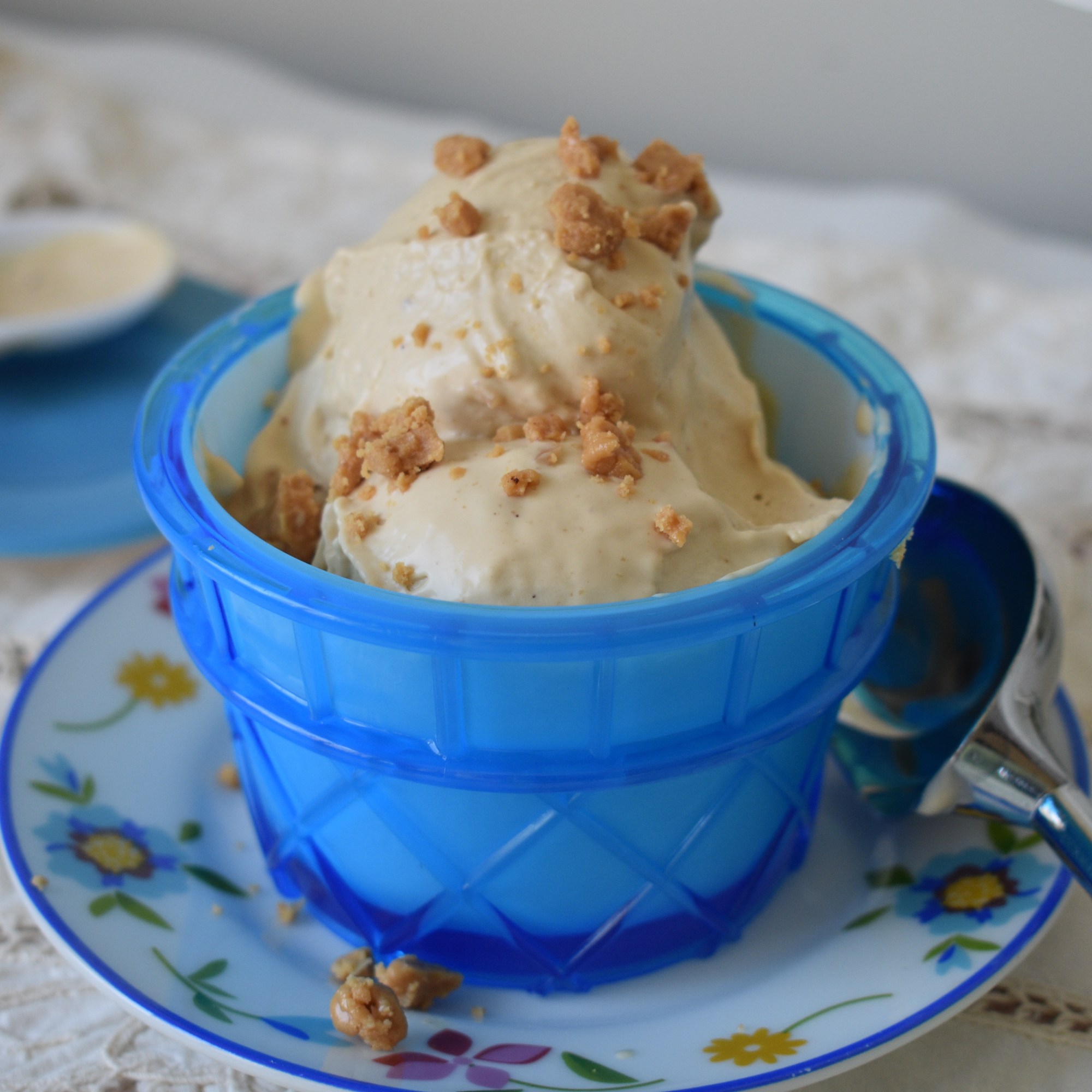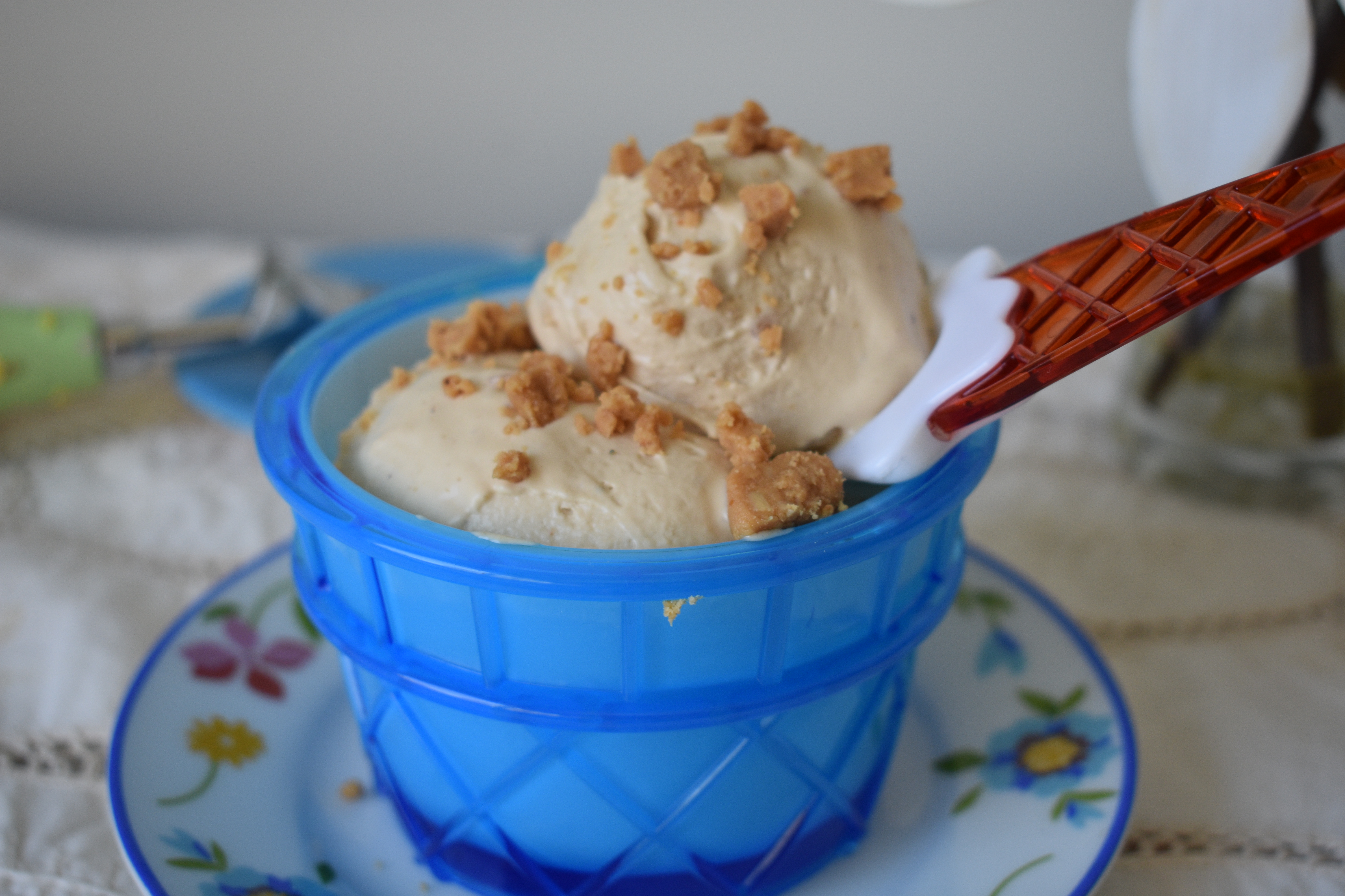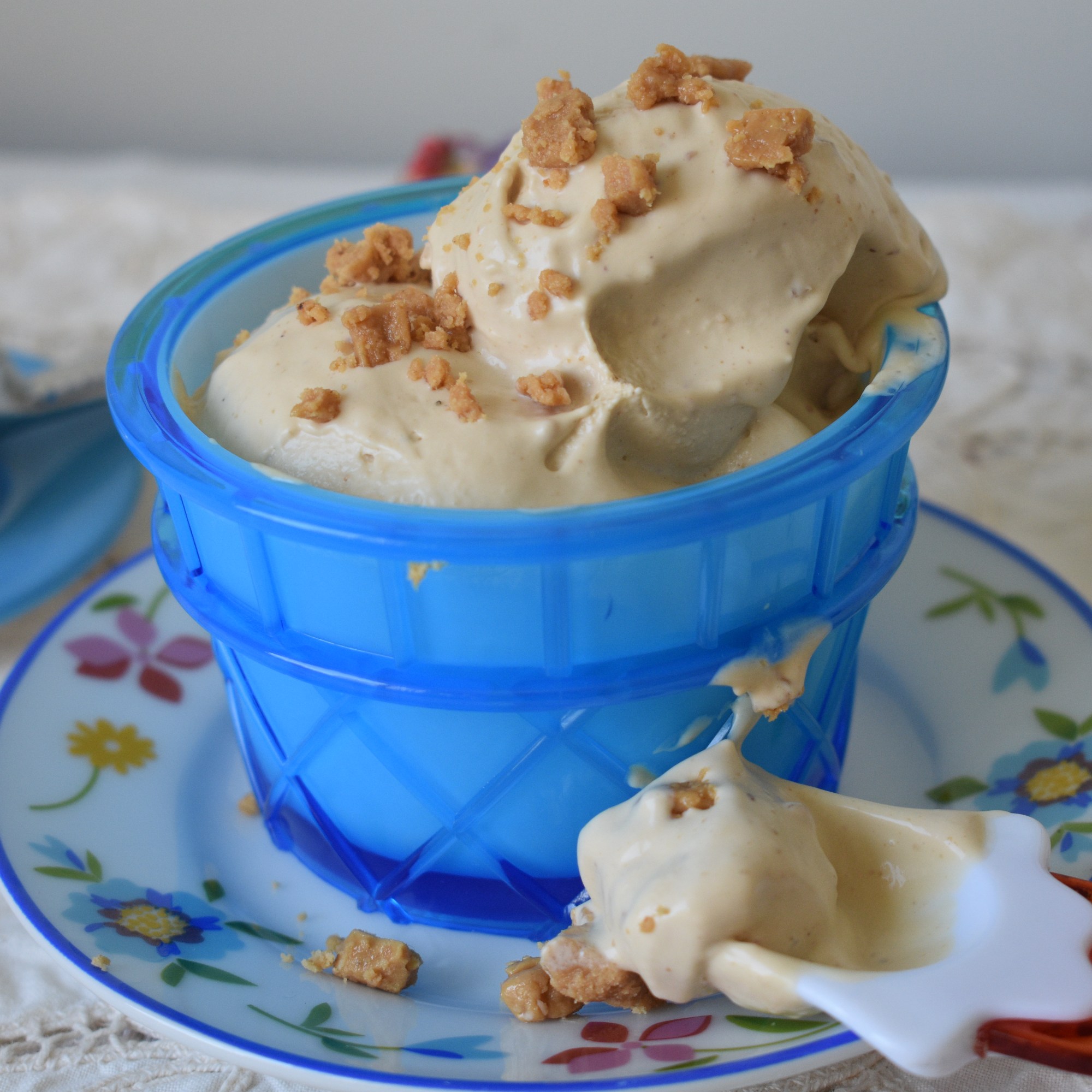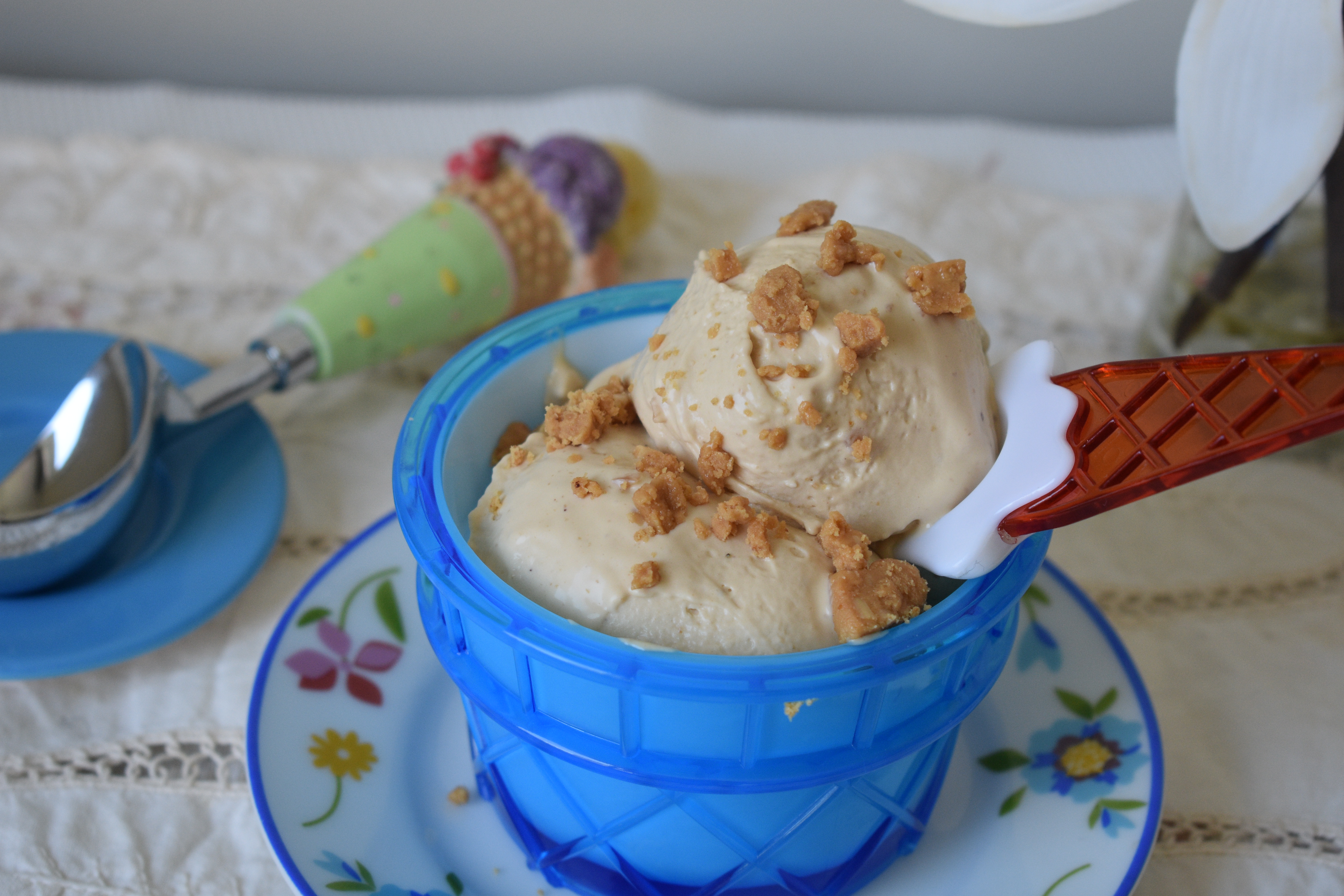 Si decimos turrón pensamos en Navidad. Pero comer un helado de turrón un día de intenso calor es una experiencia mágica. En casa nos pirra el turrón de Jijona, y lo hacemos casero. Y como hacemos tanto siempre sobra, ya que pasado Reyes ya no apetece tanto. Así que lo congelo, con la idea de hacer un bizcocho o este riquísimo helado. Si no tienes congelado, puedes esperar a Navidad y marcarte este postre que dará un toque a tu menú navideño. O congelarlo, para cuando llegue el verano saborear este delicioso helado. Podemos hacerlo con o sin heladera, o usar nuestro robot con el batidor y el bol bien frío para mantecar. La base grasa de la leche entera impide la cristalización y con el aporte de la nata 35% MG ,logramos una textura muy cremosa. Este helado es de los de tipo crema, tiene una base como de natillas o crema inglesa. La yema de huevo aporta un poco más de grasa. Al tener tanta materia grasa, los cristales de hielo del helado son muy pequeñitos, además con el azúcar del turrón y la miel ( que es un azúcar invertido) estos se mantienen separados, resultando una textura de helado muy suave.