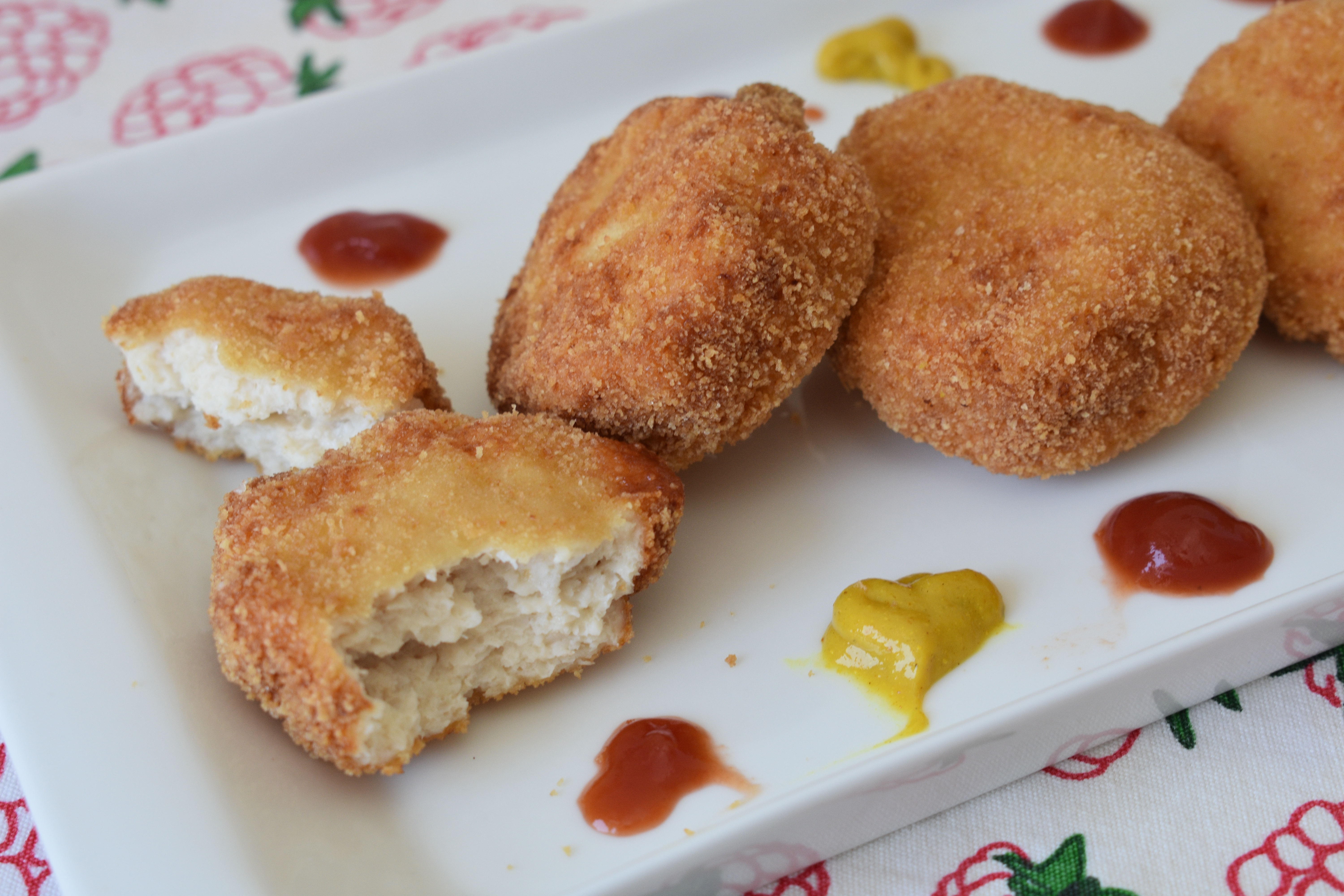 No se a vosotros, pero a mi con los nuggets me pasan como con las salchichas Frankfurt. Desde que vi un programa donde mostraban como las hacían me dio cosa volver a comerlas. Cuando lo hago, siempre me encomiendo a quien sabe que. Pienso que como todo, malo malo no debe ser. También pienso en la Coca Cola y todas las que tomé en mi vida sin saber exactamente que lleva. Una vez intenté hacerlas y aunque ricas mis hijos y yo misma, decidimos que no eran Frankfurt. Pero con los nuggets ha sido al revés. Nos han encantado, sean o no los verdaderos. También es cierto, que a saber si el pollo que compramos es verdadero. Con ello me refiero a que no se si son aquellos pollos que criaban en casa, que salían por el día a comer semilllas y gusanitos por el campo. Bueno ahí lo dejo. Vamos con la receta. Yo usé mi querida Cuco, pero si no la tienes puedes pedir a tu carnicero que te muela el pollo o hacerlo en cualquier máquina que tengas . Imprescindible luego tener una buena batidora.