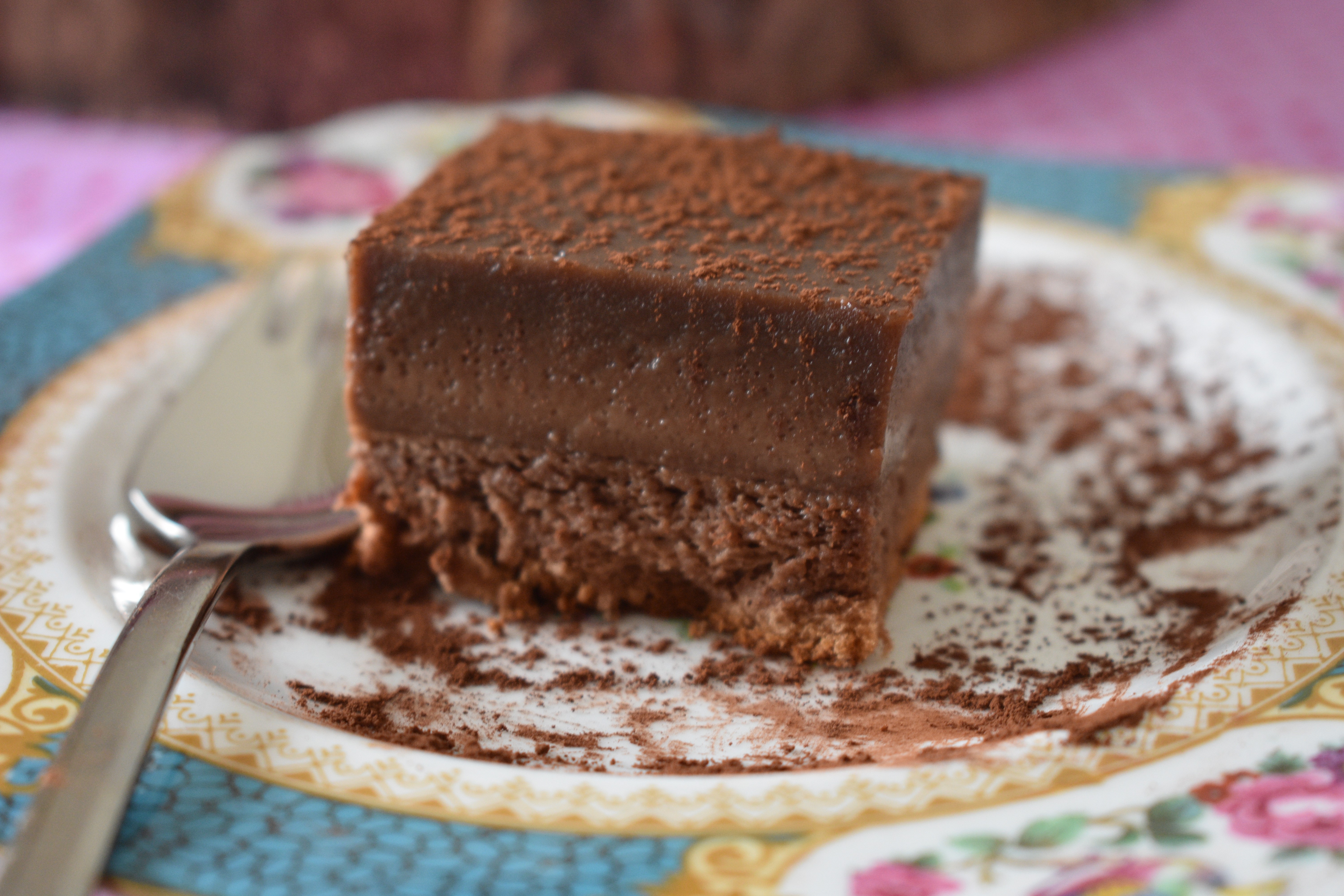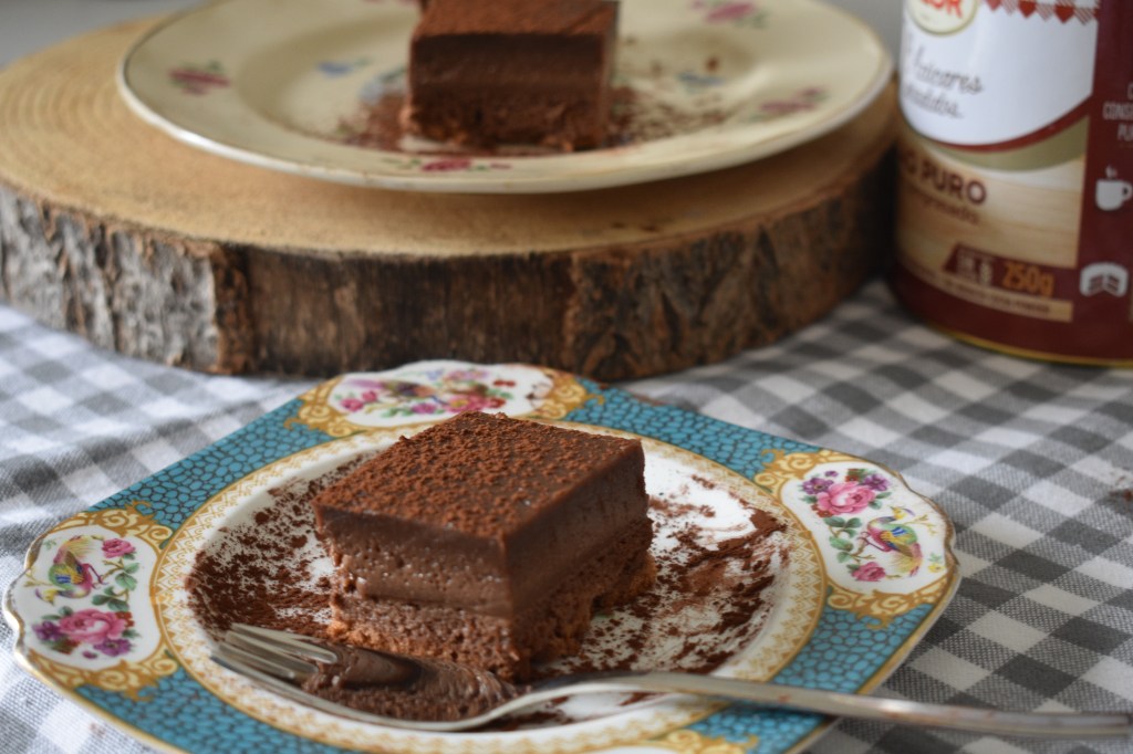 - Dejamos templar en el molde, luego lo llevamos unas horas a la nevera. Desmoldamos en un plato, quitamos el papel, cortamos en cuadraditos y espolvoreamos con cacao con ayuda de un colador.
