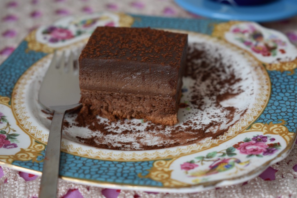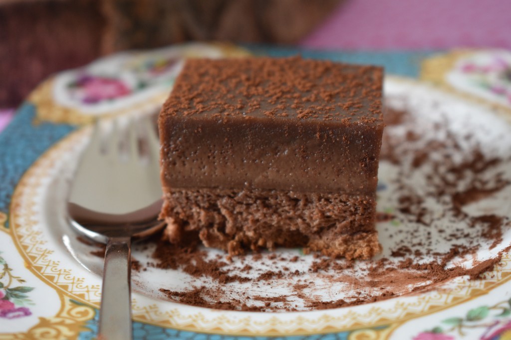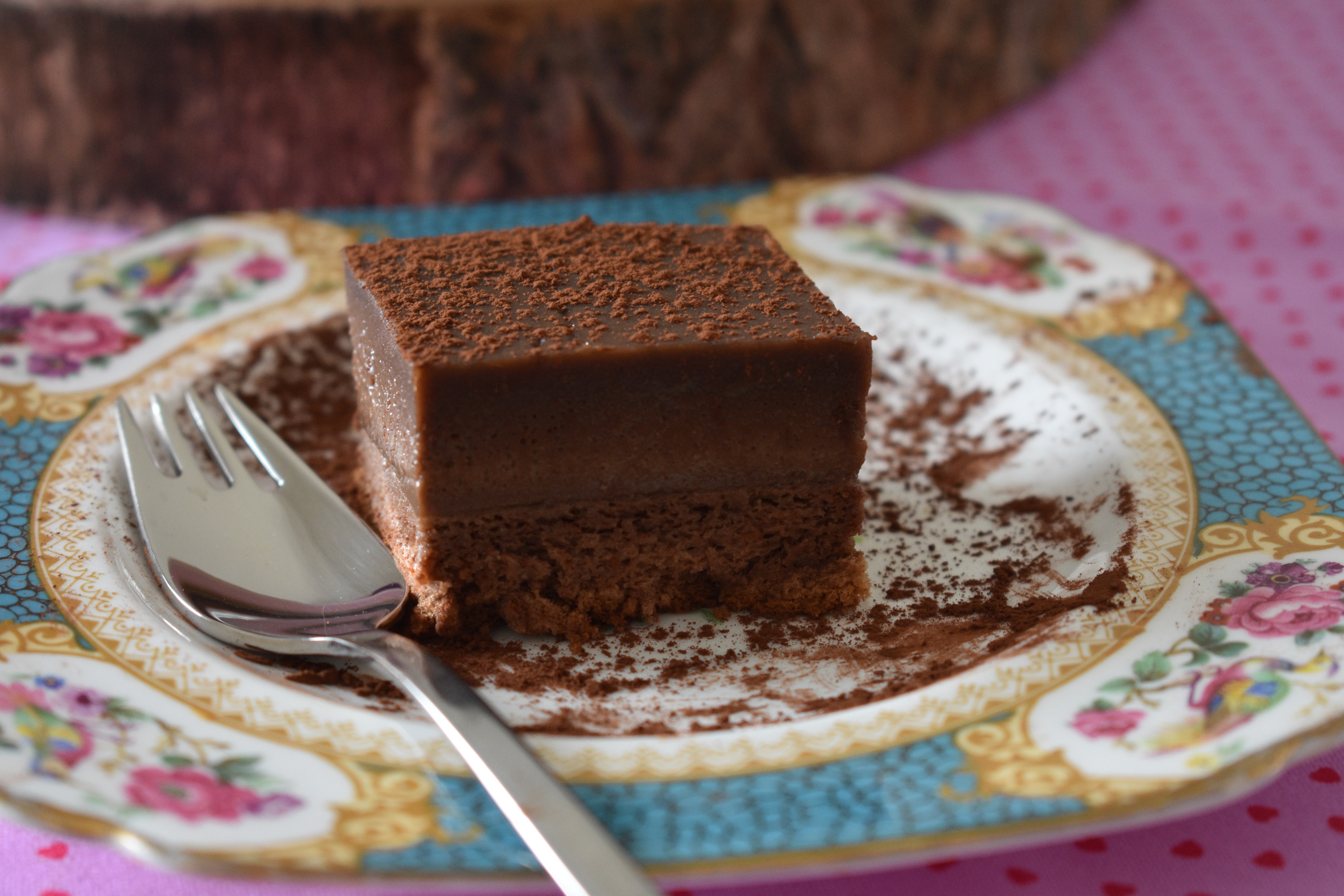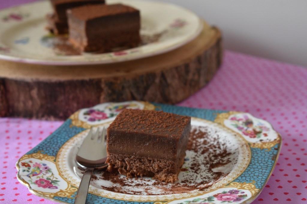 - Dejamos templar en el molde, luego lo llevamos unas horas a la nevera. Desmoldamos en un plato, quitamos el papel, cortamos en cuadraditos y espolvoreamos con cacao con ayuda de un colador. Para que los cuadraditos queden bien es importante que esté bien frío.