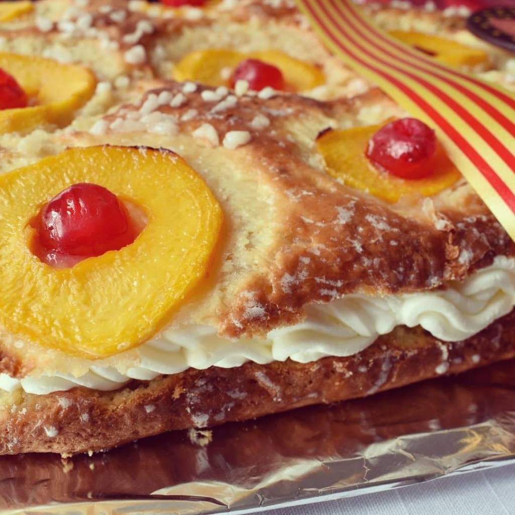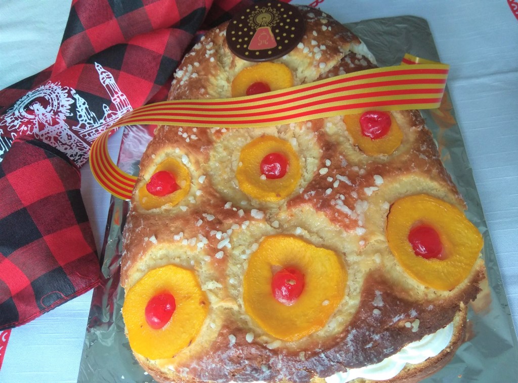 Hoy en Zaragoza celebramos el día del Pilar, una fiesta que traspasa lo religioso y tiene un componente de identidad muy especial. Y como en España cada fiesta va acompañada de un dulce os ofrezco esta versión de brioche relleno con forma de manto de la virgen. También lleva algo muy típico de nuestra tierra para formar el adorno del manto, unos melocotones de Calanda, que en nuestra tierra llevan el sello de D.O.