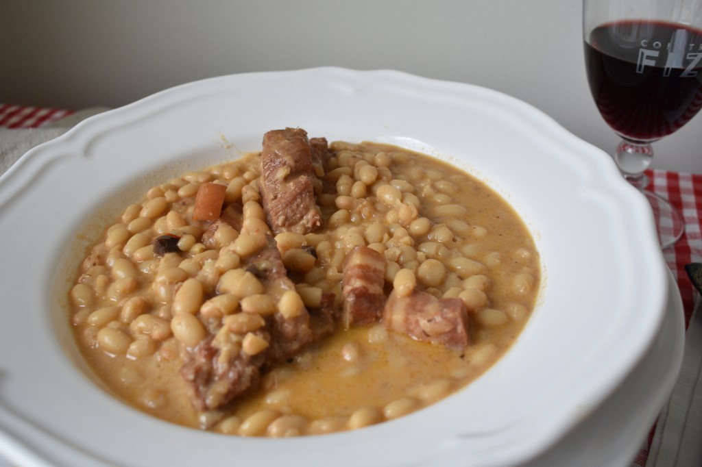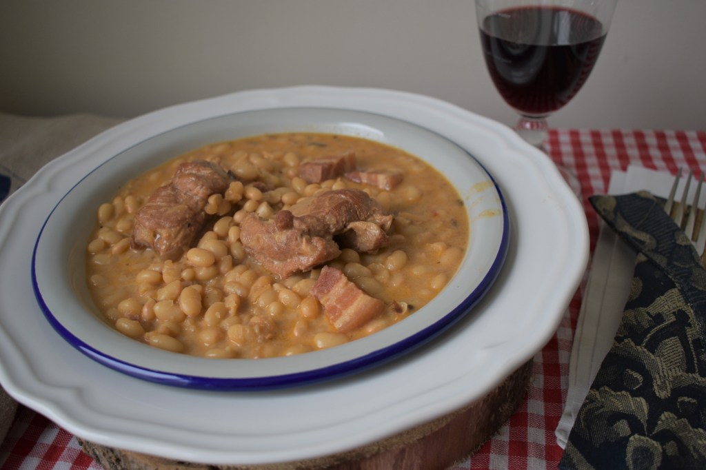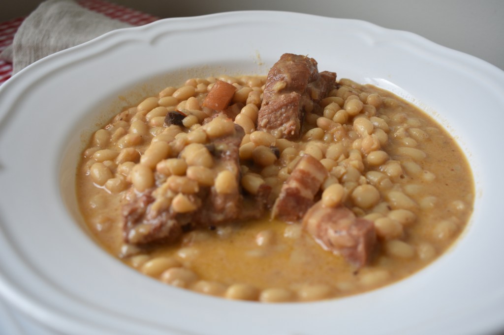 Estamos en otoño y apetecen los platos de cuchara y cocinar a fuego lento. Las legumbres son ricas en fibra: las judías blancas contienen un 23%, y las pintas hasta un 25%. Además, aportan vitaminas del grupo B (tiamina, niacina, B6 y ácido fólico), y minerales como calcio, magnesio, potasio, cinc, fósforo y hierro. Si además las enriquecemos con carne, en éste caso de la tierra ( costilla de cerdo de Teruel), tenemos un plato exquisito y completo. La carne de cerdo de Teruel es muy preciada en el sector gastronómico, por su calidad y suave sabor. Creo que no hay más que decir..así que solo te queda coger tu olla y comenzar.