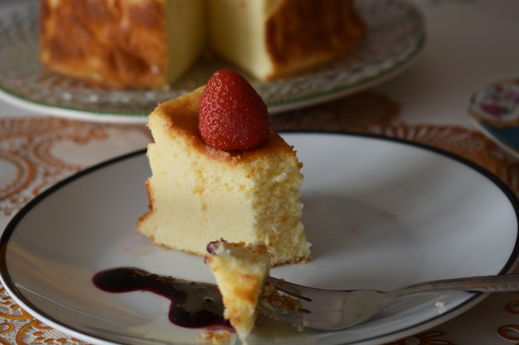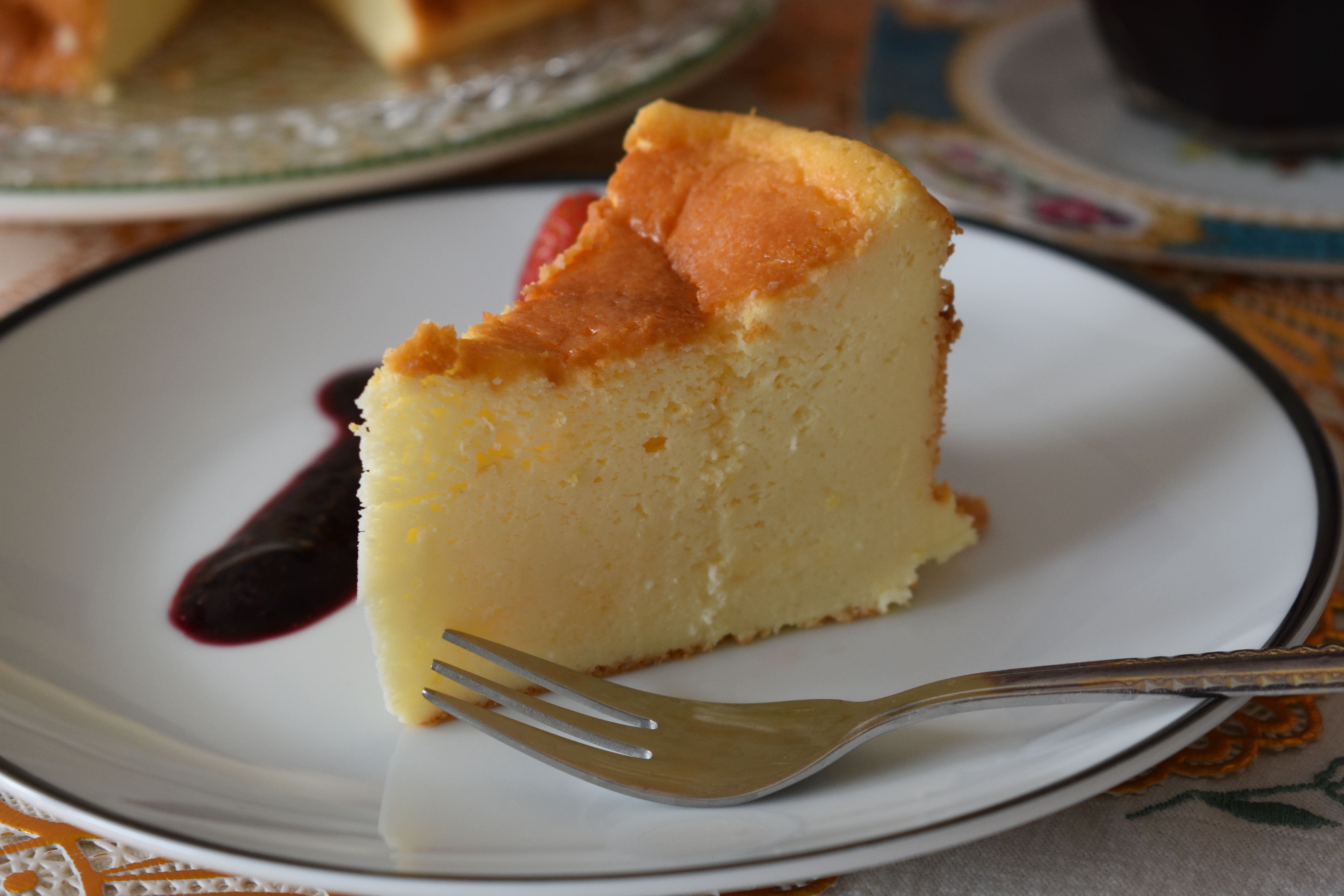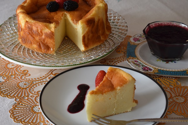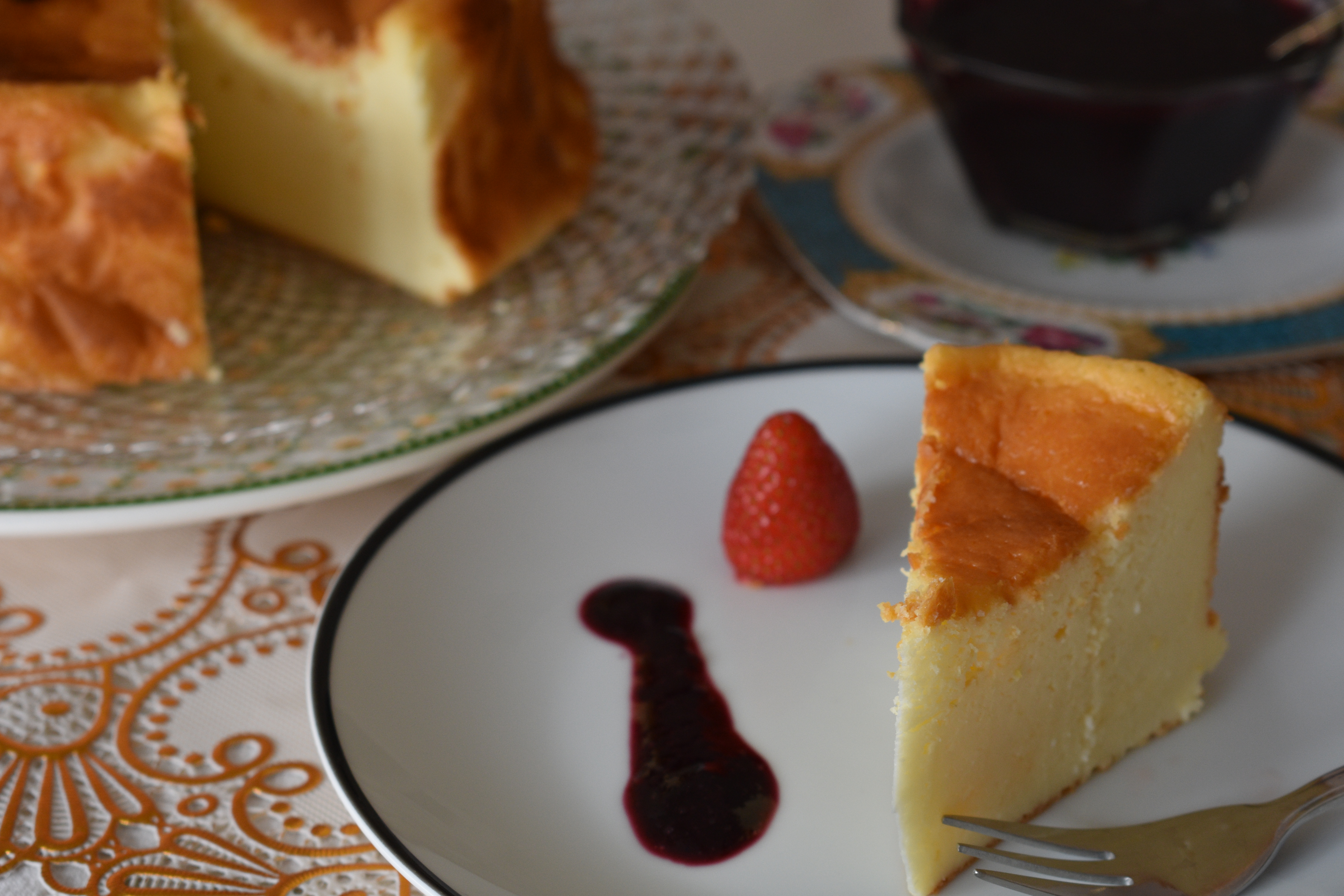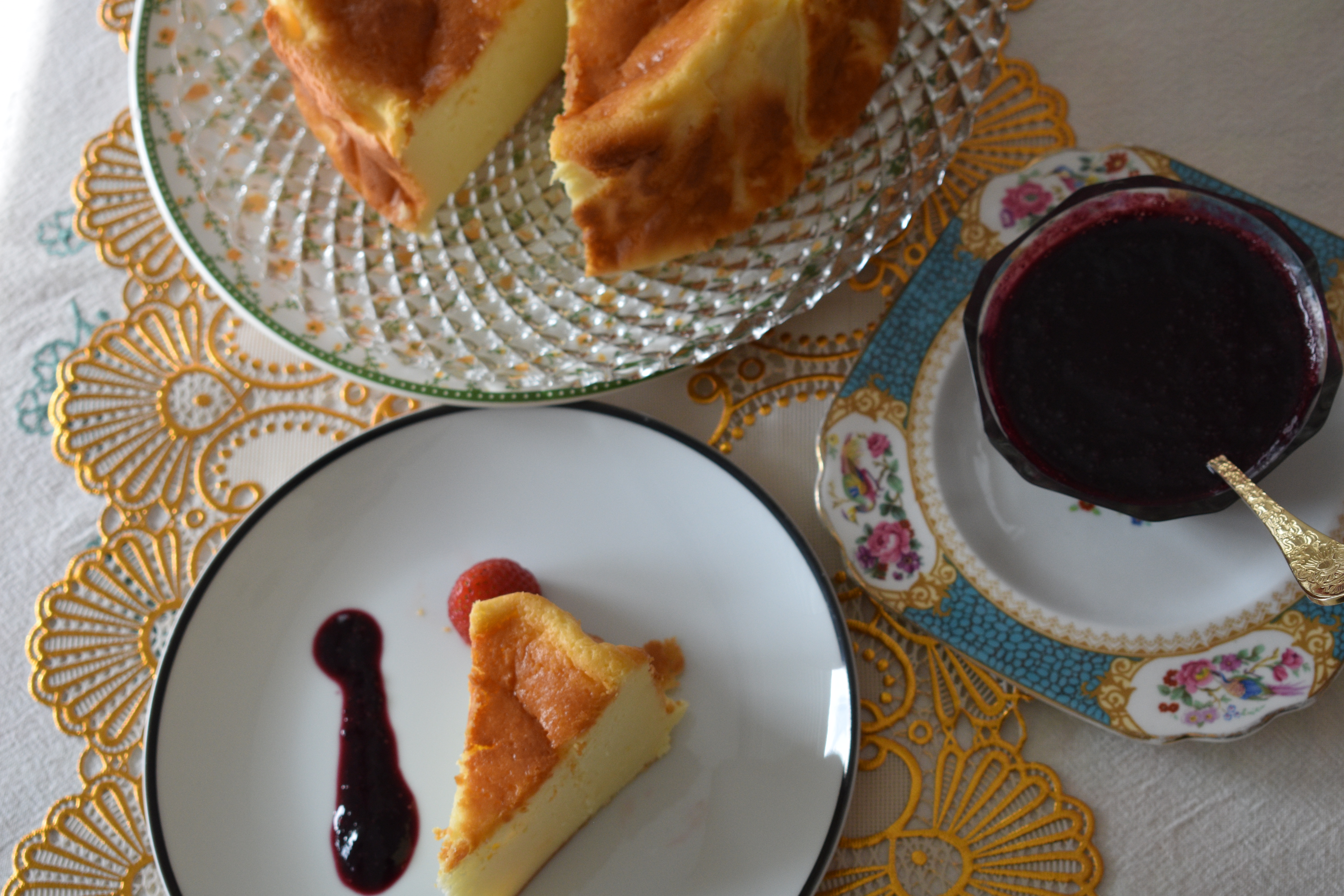 El mundo de las tartas de queso es infinito, y para mí, que me encanta el queso un reto. Cada vez que veo una receta allá que me lanzo. Esta receta está adaptada a mi gusto del blog «La cocina de Fabrisa». Es una tarta para devorar, que puedes acompañar con cualquier salsa o mermelada de frutos rojos que tengas en casa. Yo suelo tener siempre arándanos frescos, y no me cuesta nada poner un cazo con azúcar, un poquito de agua y limón y hacer mi salsita. Isabel, del blog antes referido, también propone la idea de hacerla con una base de galleta. Pero así, sin base, está deliciosa.