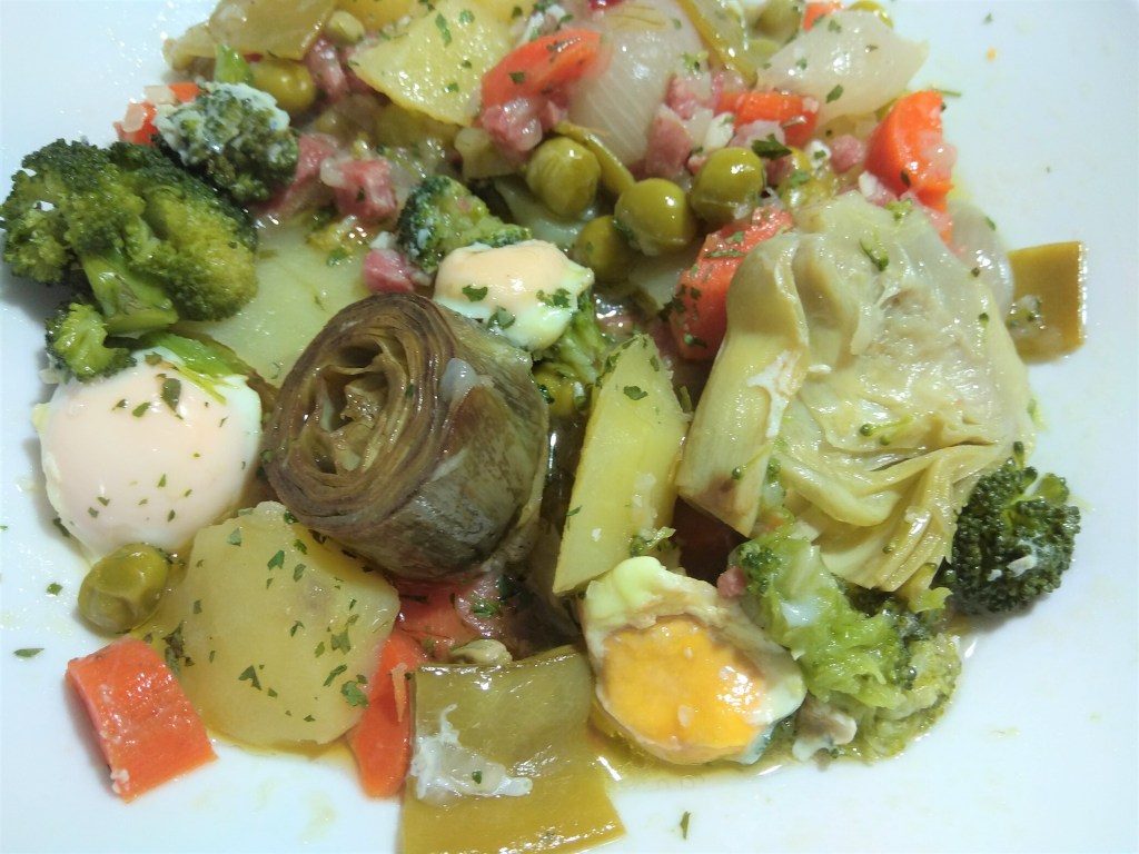 5. Agregamos los bisaltos, zanahorias y las alcachofas. Rectificamos de sal, y cocinamos 5 minutos más. Cuando falten 2 minutos, cascamos los huevos de codorniz y dejamos terminar. Servimos con un poco de perejil picado por encima.