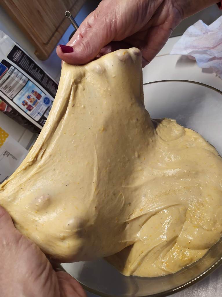 - Ponemos en el bol los huevos, el puré de calabazas,leche, azúcar, harina, levadura, sal y especias. Iniciamos velocidad 4 durante 2 minutos, dejamos descansar 10 minutos. Así tres veces. Total 6 minutos de amasado y 30 de reposo.