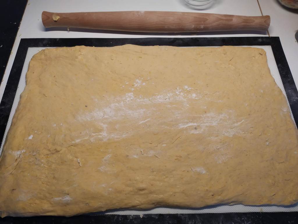 - Cuando la masa ha fermentado, la pasamos a la encimera enharinada y la extendemos con un rodillo hasta obtener un rectángulo de unos 30×20 cm.
