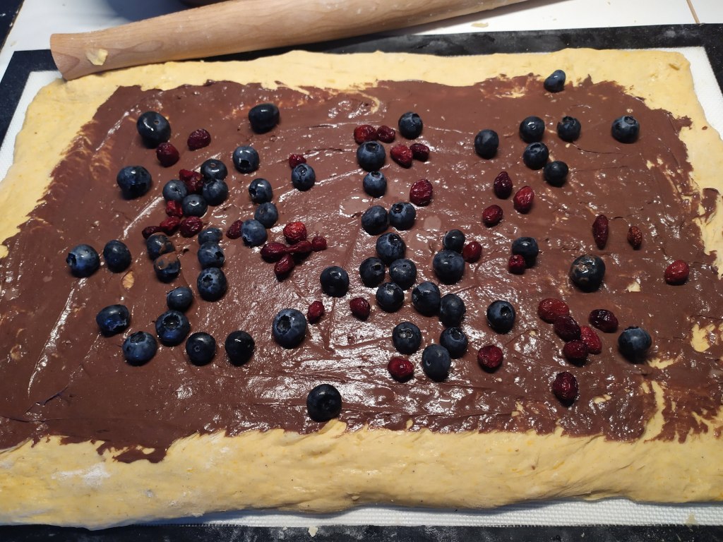 - Mezclamos bien en un bol el queso, cacao y azúcar. Formamos una pasta homogénea y con la espátula repartimos el relleno por toda la masa, dejando un margen en el borde para que no se salga al hornear. Esparcimos los arándanos.