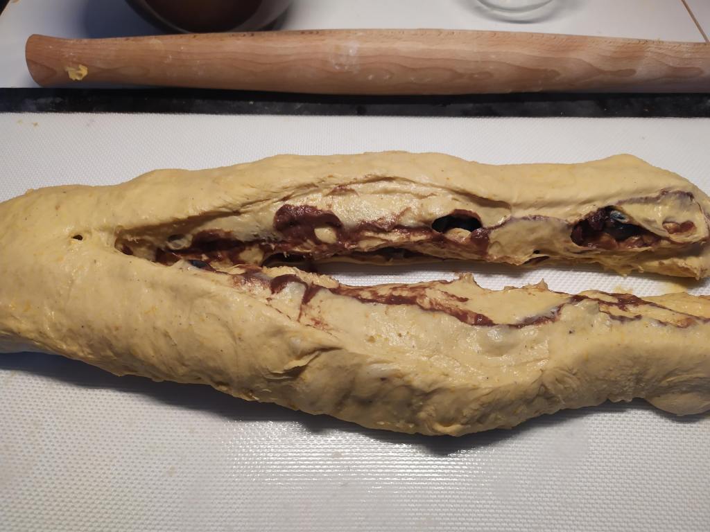 - Hacemos un rollo con la masa, enrollándola por el lado más largo. Con un cuchillo grande y afilado cortamos el rollo a lo largo, dejando unido uno de los extremos. Pasamos una mitad sobre la otra haciendo como una trenza.