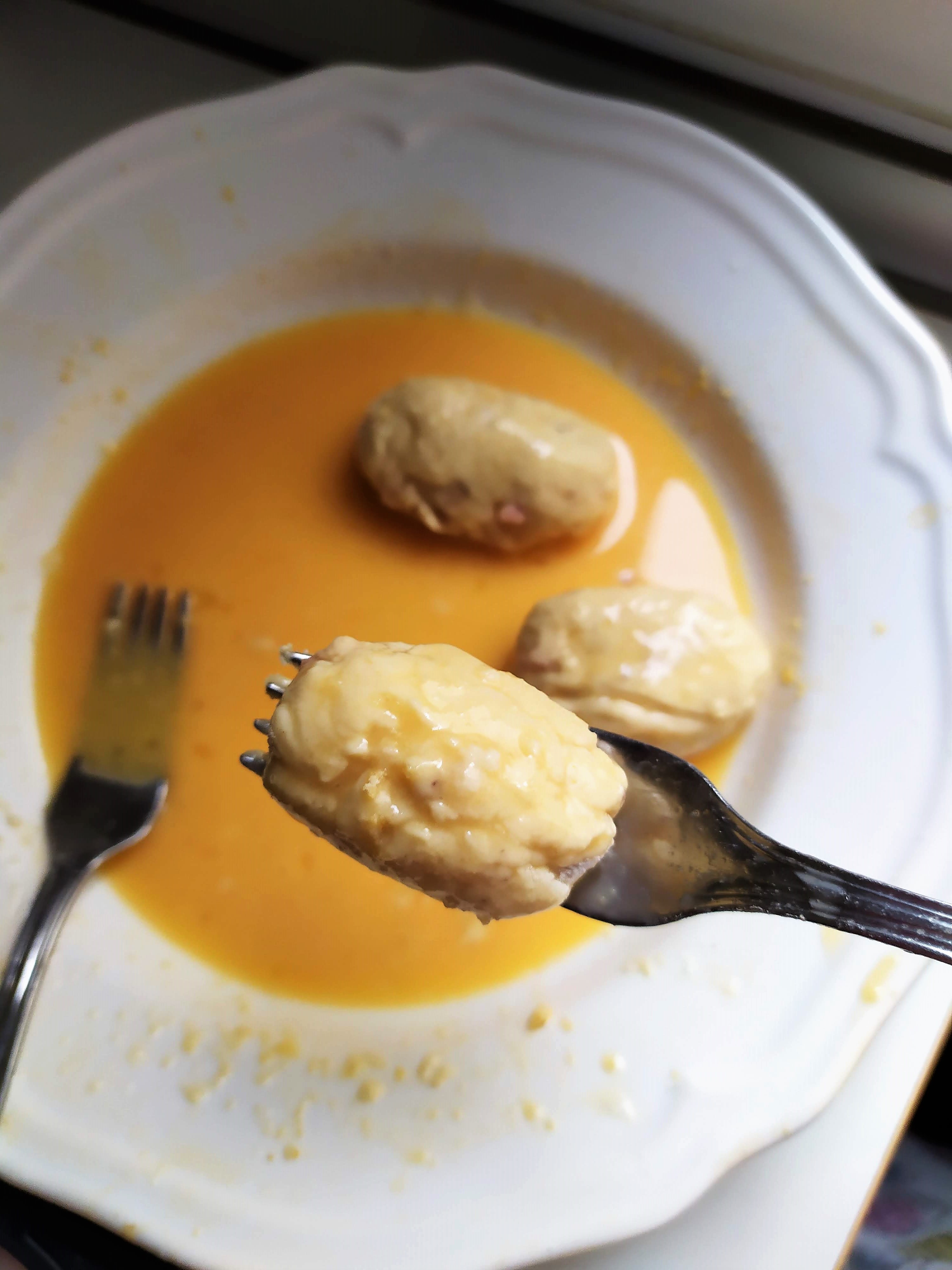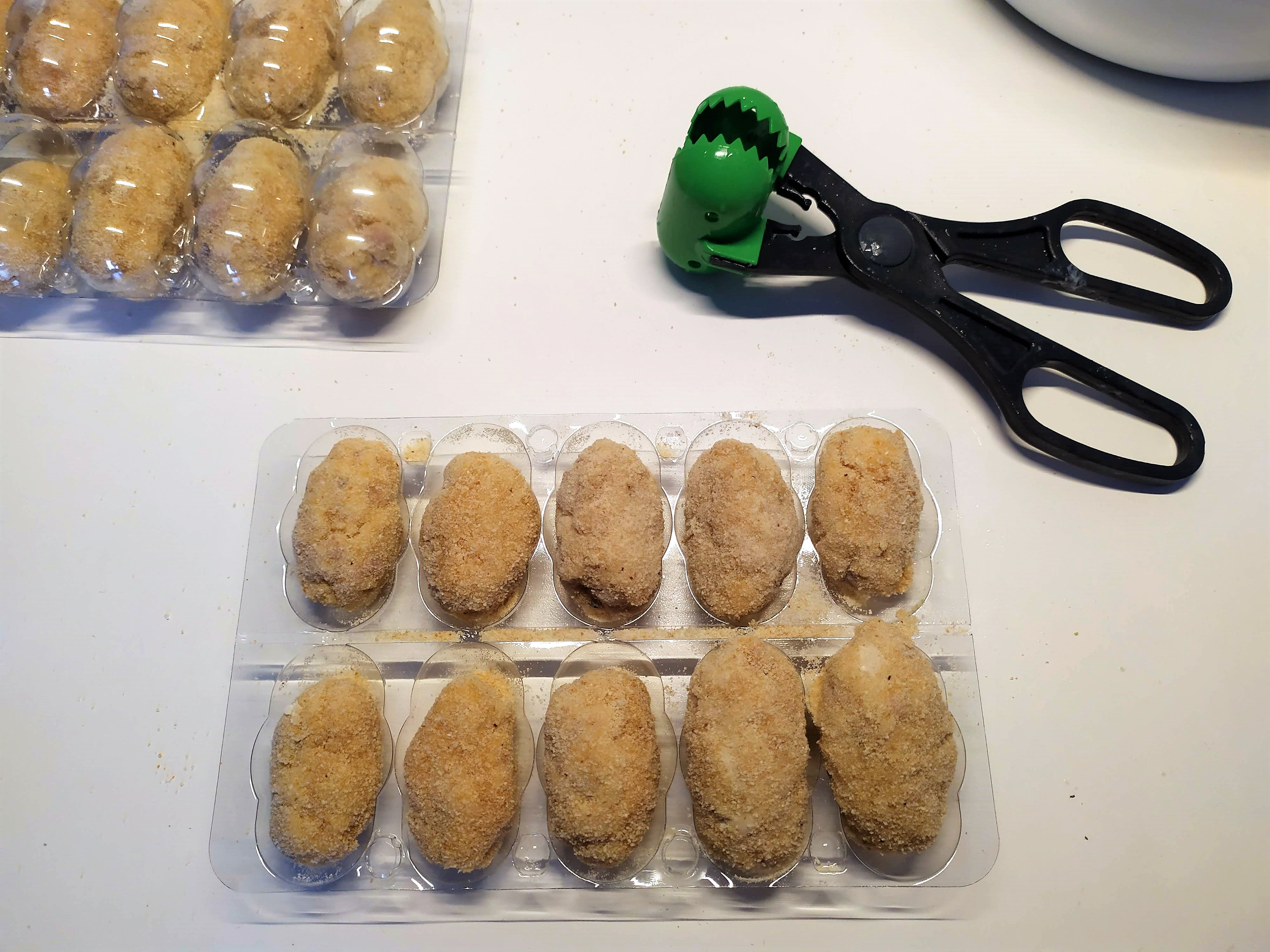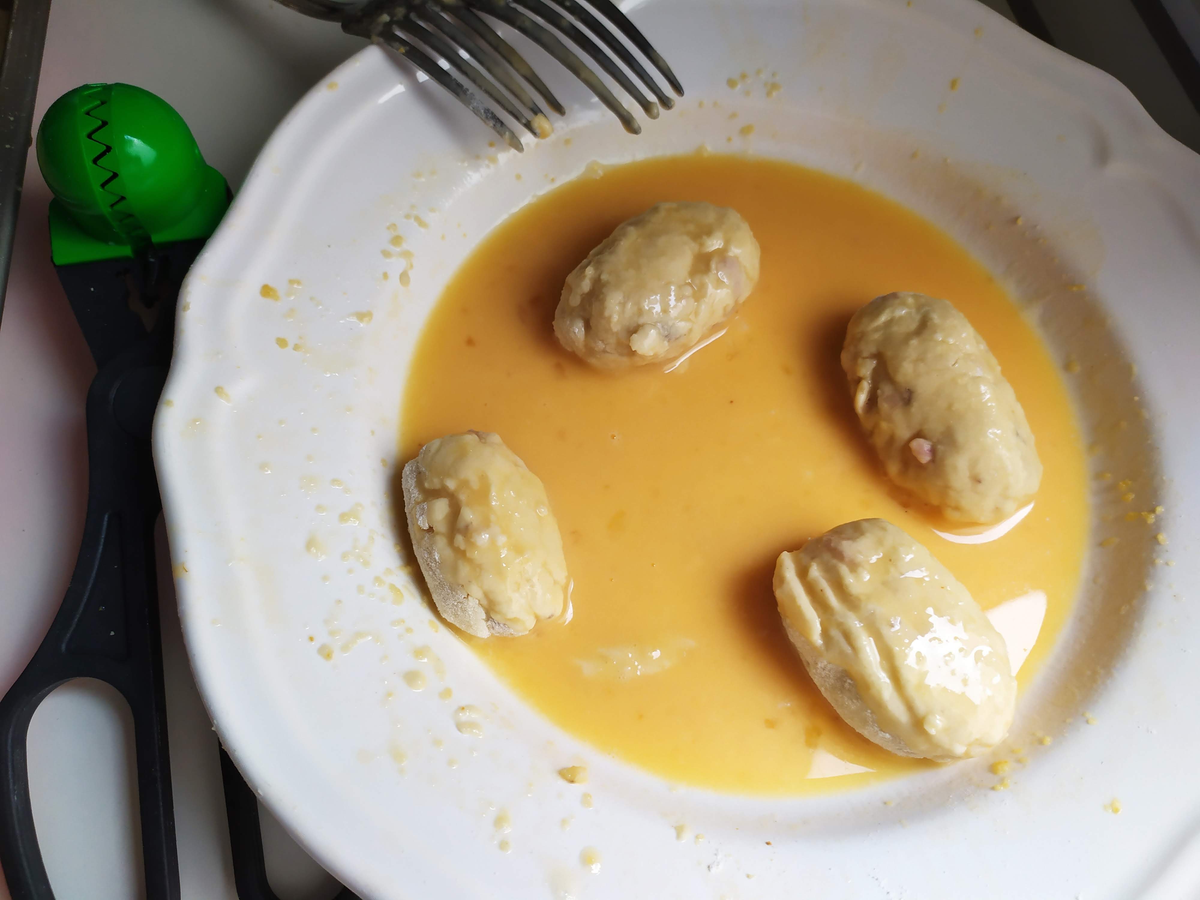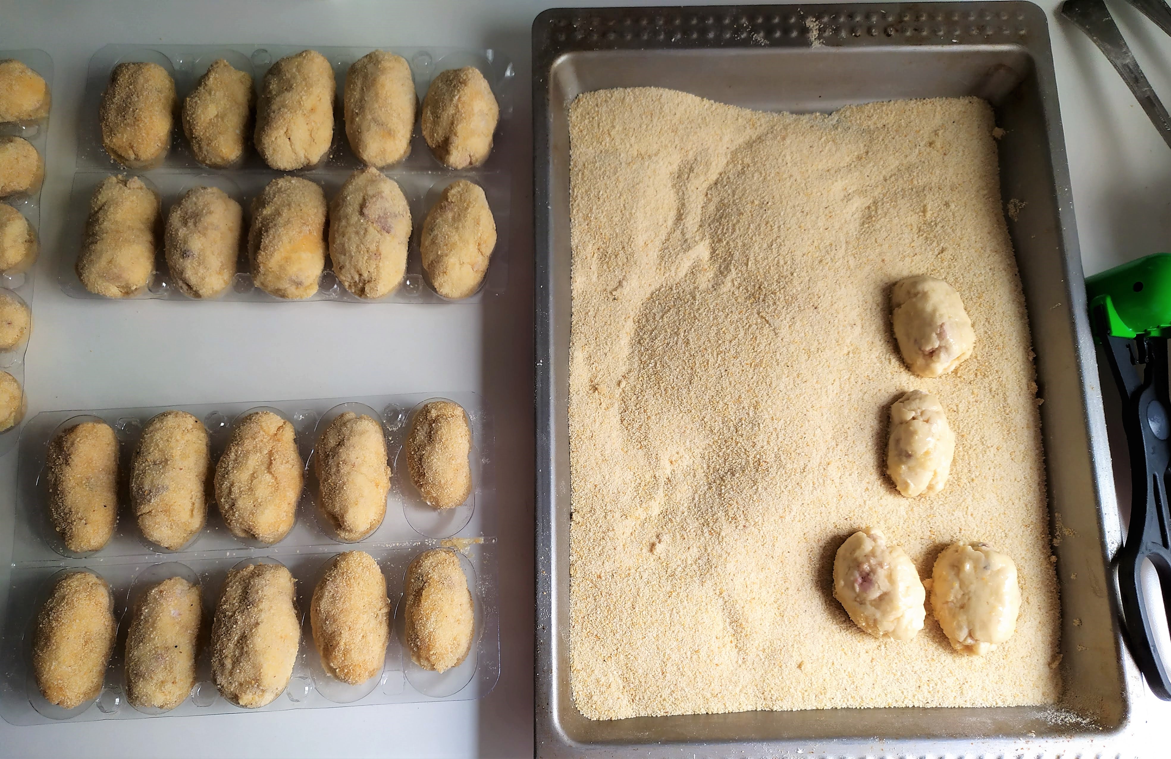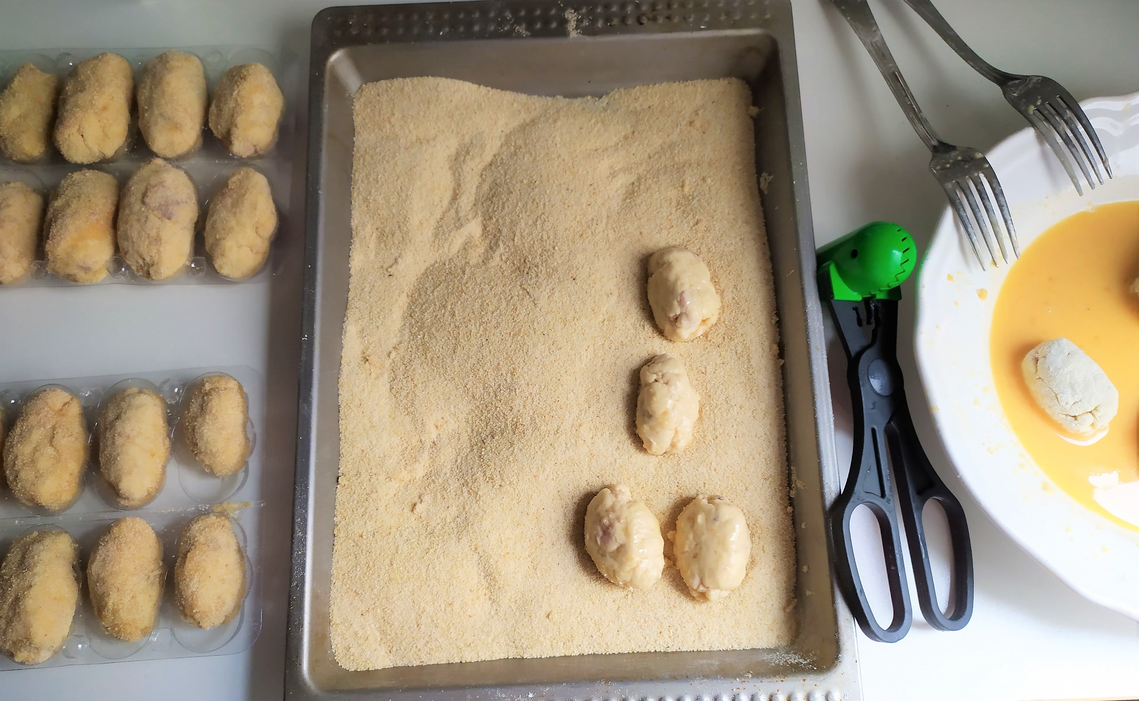 - Cogemos porciones, damos forma y pasamos por harina, huevo y pan rallado .