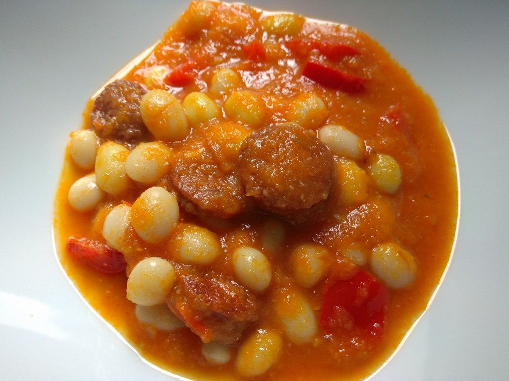 8. Añadimos las pochas con un poquito de agua de la cocción, rectificamos de sal y sazonamos con una pizca de pimentón y añadimos el puré de verduras. Cocinamos a velocidad 2 durante 10 minutos a 95ºC.