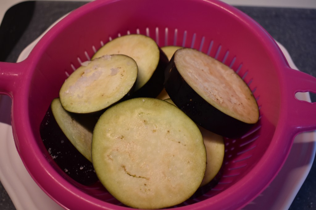 - Ponemos las rodajas en un colador y espolvoreamos en capas con un poco de sal gruesa. Dejamos que suelten el amargor, durante al menos media hora.