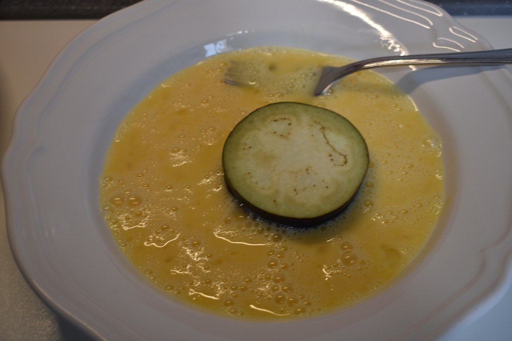 - Enjuagamos las rodajas de berenjena y secamos muy bien.