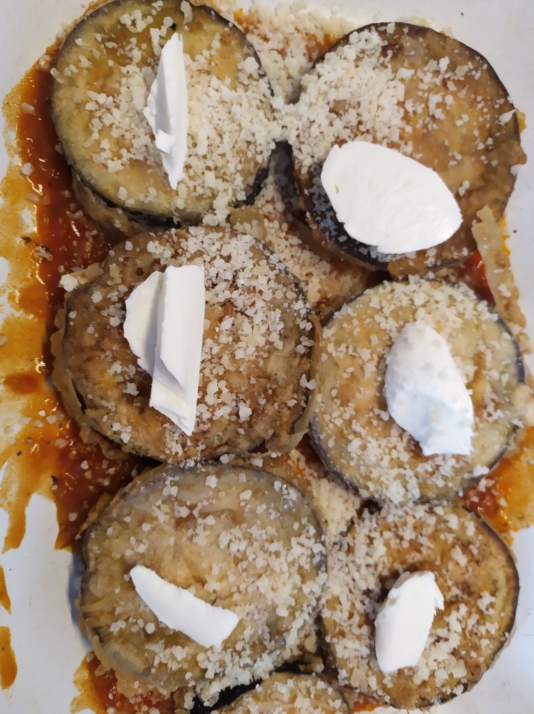 - Luego una capa de berenjenas, cubrimos con queso parmesano rallado y trocitos de mozarella.