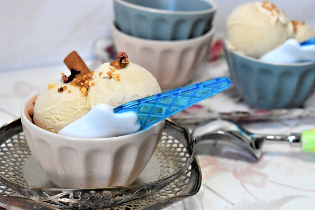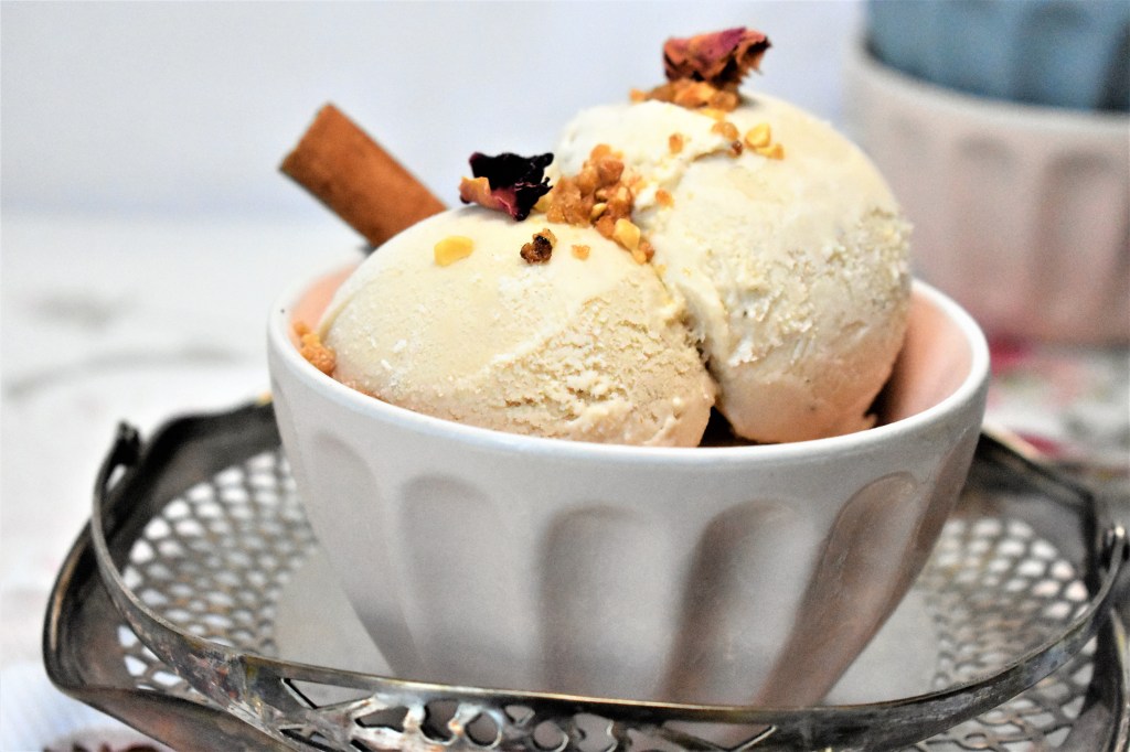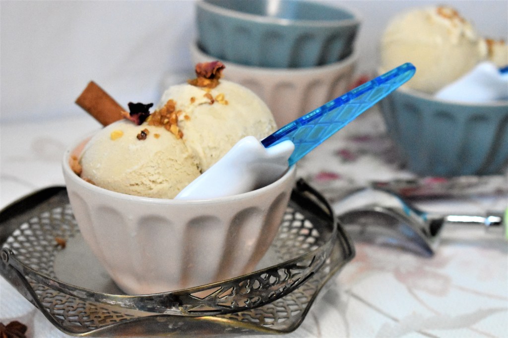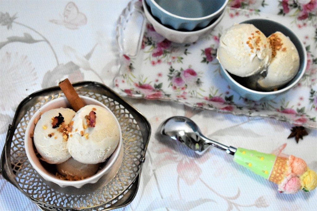 El té chai, también conocido como masala chai es una bebida típica del sur de India que consiste en una mezcla de te verde o negro con especias y hierbas aromáticas. La versión más popular de masala chai usa las especias conocidas como calientes,: cardamomo, clavo, pimienta, anís, jengibre y canela. En algunas regiones pueden agregar almendras y azafrán. Se puede tomar con leche o agua caliente, al gusto. Gracias a las especies este té consigue además de sabor, una serie de propiedades medicinales extras, se considera que es digestivo, anti-inflamatorio, anti-oxidante y proporciona beneficios para quien tenga problemas cardiovasculares y respiratorios. La verdad que me encanta el sabor de las especies, y suelo tomar cada día en la versión que viene preparada. Así que me he lanzado a hacerlo en versión helado para estos días en que el calor asoma. Cogí la receta de la página de Le Creuset y la he adaptado a mi manera. Yo he usado té chai que compro a granel, pero puedes usar bolsitas preparadas (Mercadona, Hornimans).