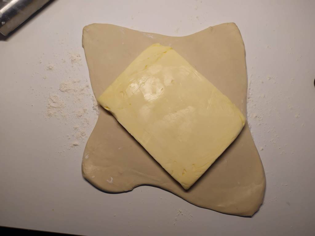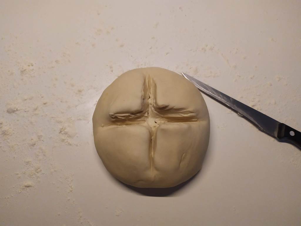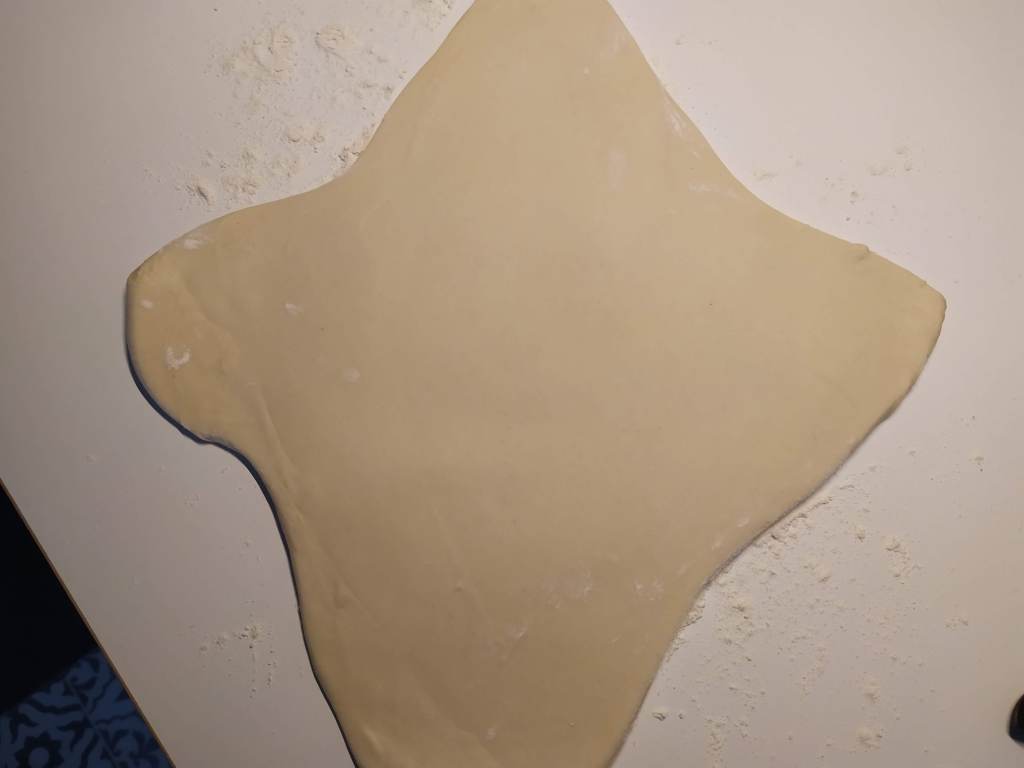 - Hacemos unos cortes en cruz y estiramos la masa en forma de cruz o de trébol de 4 hojas con una almohadilla en el centro del tamaño del pan de mantequilla. No muy fina para que no se rompa.