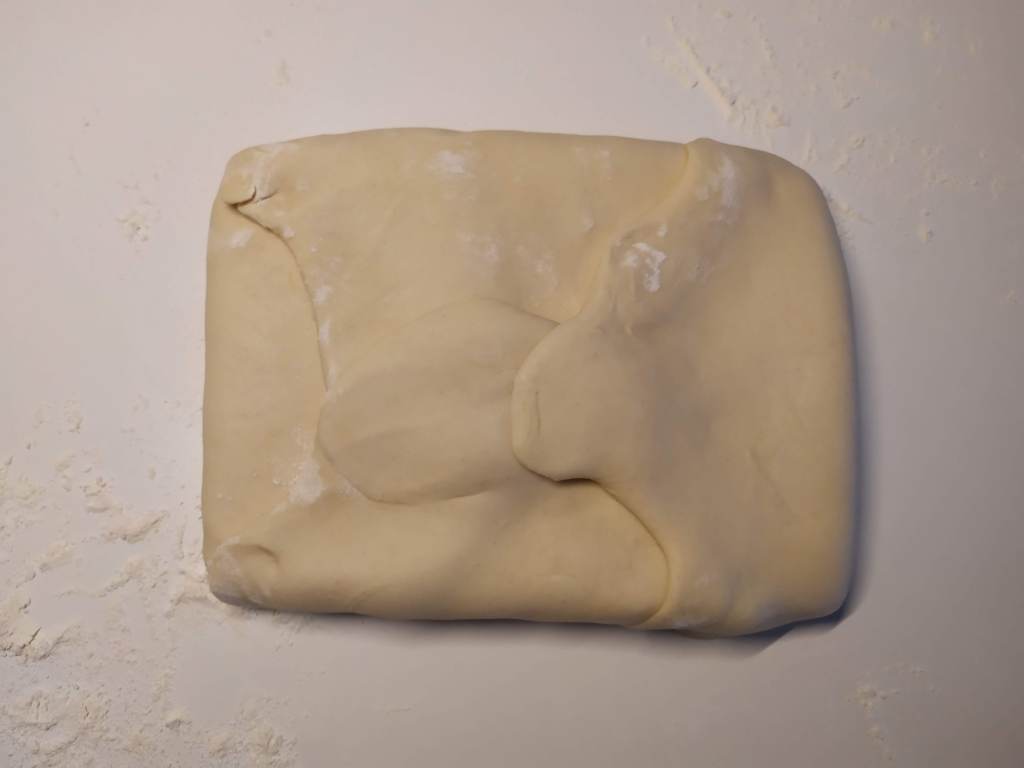 - Colocamos el pan de mantequilla en el centro y cubrimos con los cuatro lados de masa, envolviendo la mantequilla con la masa como si hiciéramos un paquete bien sellado. Envolvemos con film y llevamos al frigorífico 15 minutos.