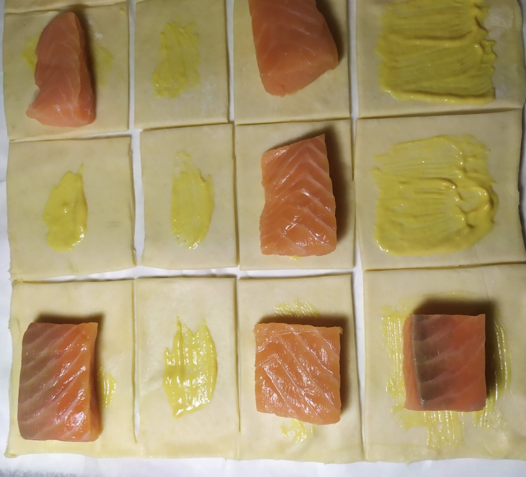 - Estiramos la lámina de hojaldre rectangular y la cortamos en 8 partes iguales. En el centro de 4 de las porciones, extendemos un poco de salsa y colocamos sobre cada una un lomo de salmón cortado a la medida.