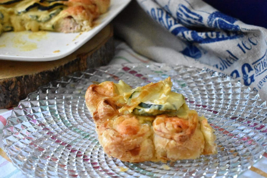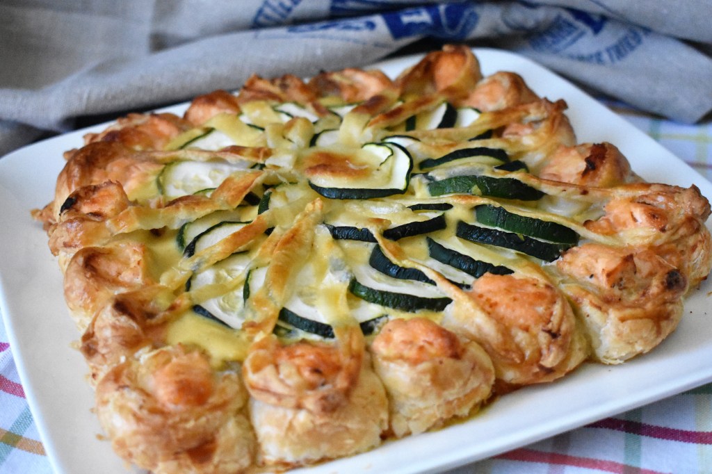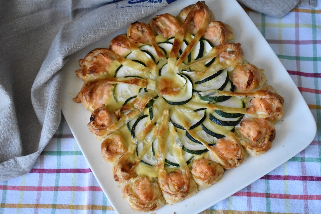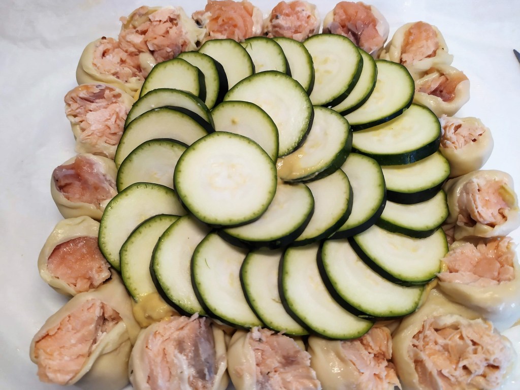 - Rellenamos la corona con la crema de cebolla y mostaza. Adornamos con las rodajas de calabacín,