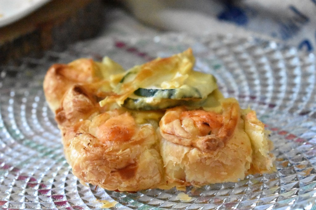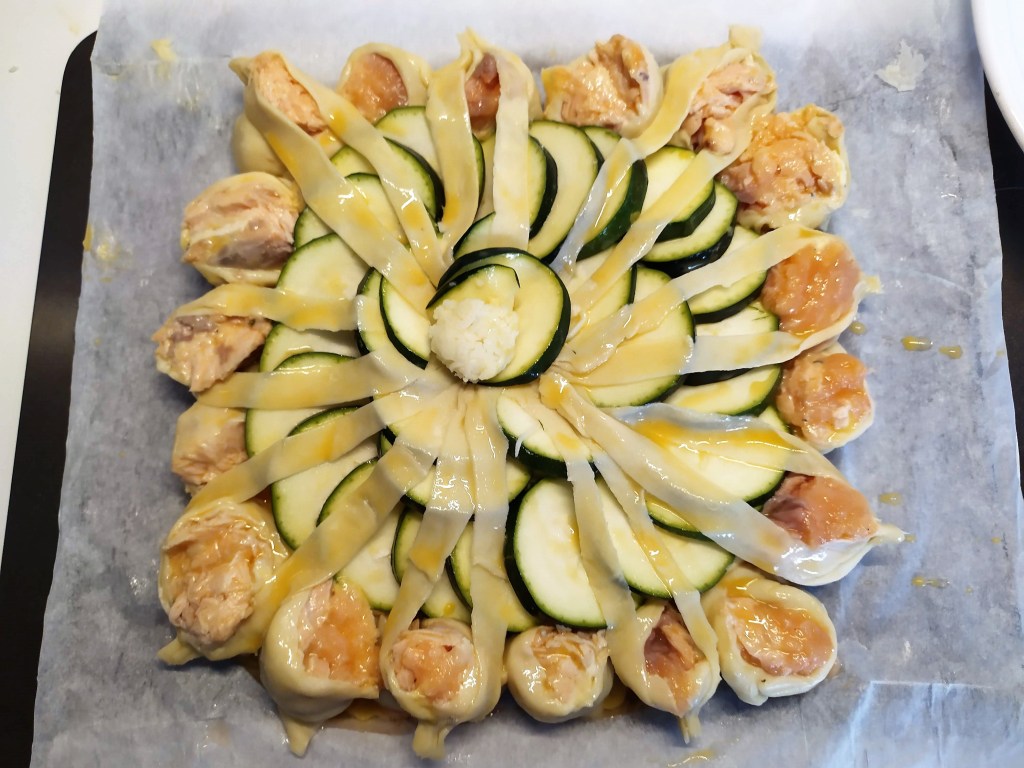 - En el medio ponemos la bola de queso y unimos con tiras de hojaldre. Pintamos con huevo.