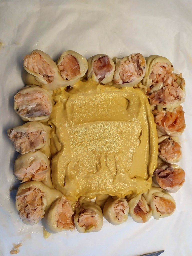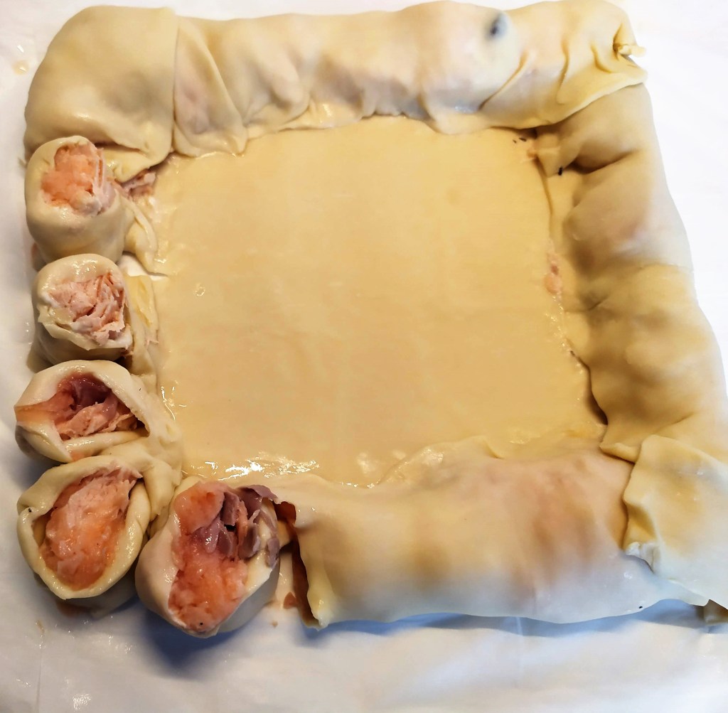 - Cortamos el salmón en trozos de unos 3 cm de altura y rodeamos la línea marcada. Hacemos unos cortes en la masa y vamos cubriendo el salmón la masa formando una especie de corona.