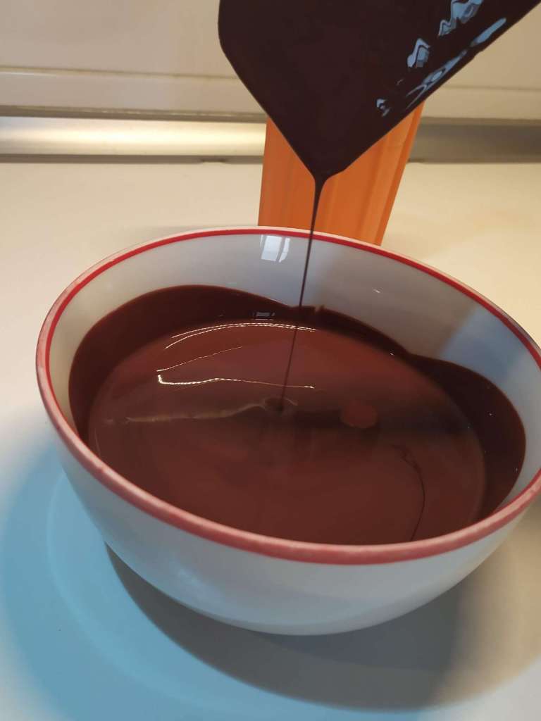 - Colocamos en un vaso alto, y vamos removiendo. El chocolate irá espesando un poquito. Esperamos a que el chocolate esté a 30º. Para esta operación es importante tener un termómetro de cocina, para encontrar el punto ideal del chocolate.
