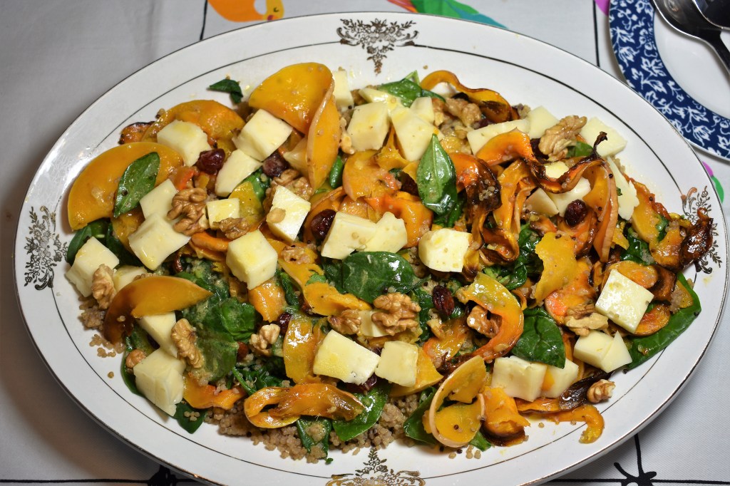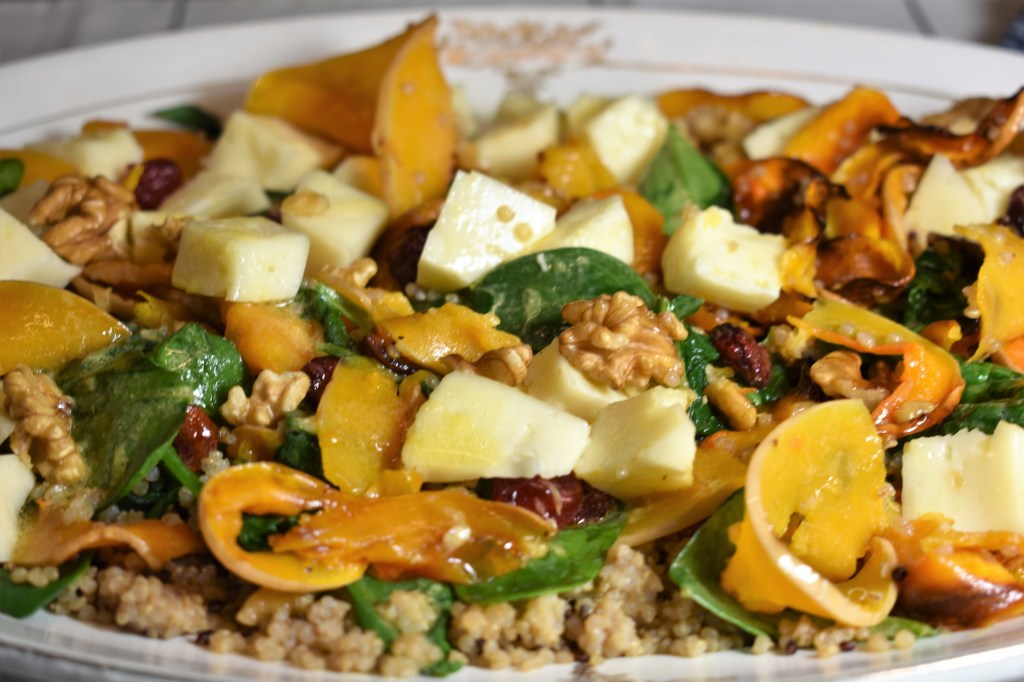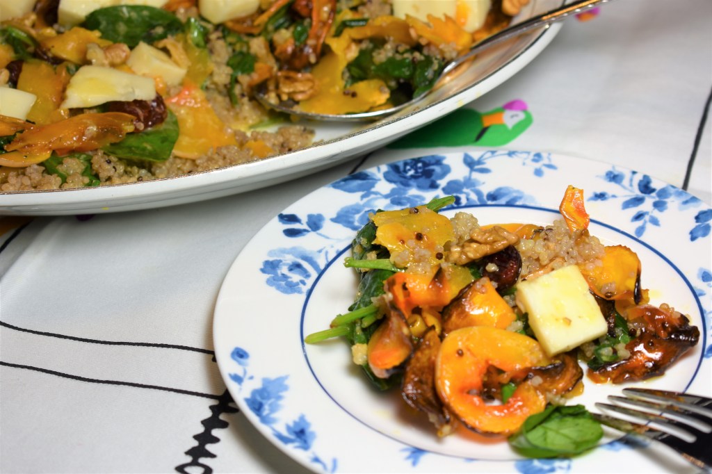 - Colocar la quinoa en una fuente plana, mezclar con la espinaca, colocar la calabaza, el queso elegido y