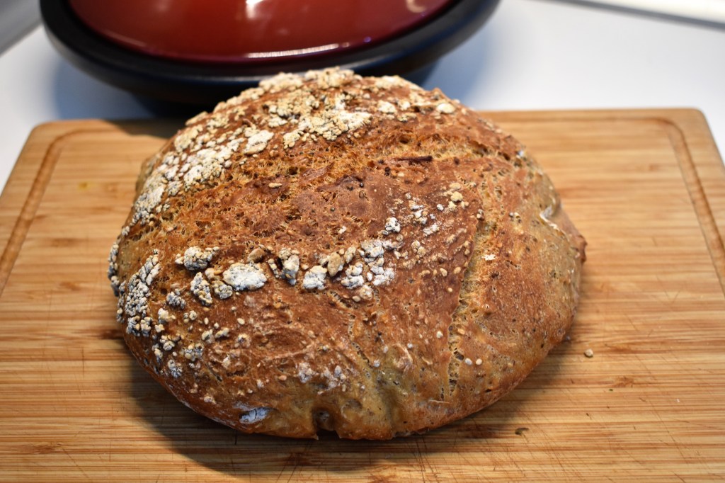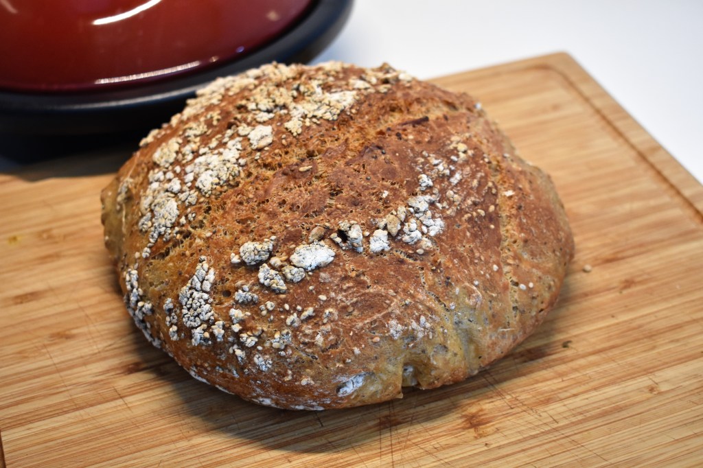 - Volcamos el pan sobre un papel sulfurizado, le hacemos un corte o cortes a nuestro gusto, y llevamos al tajine con cuidado de no quemarnos. Tapamos y horneamos 20 minutos a 220º . Destapamos, bajamos a 200º el horno y seguimos horneando 20/25 minutos. Sabemos que el pan está cuando al golpearlo suena a hueco.
