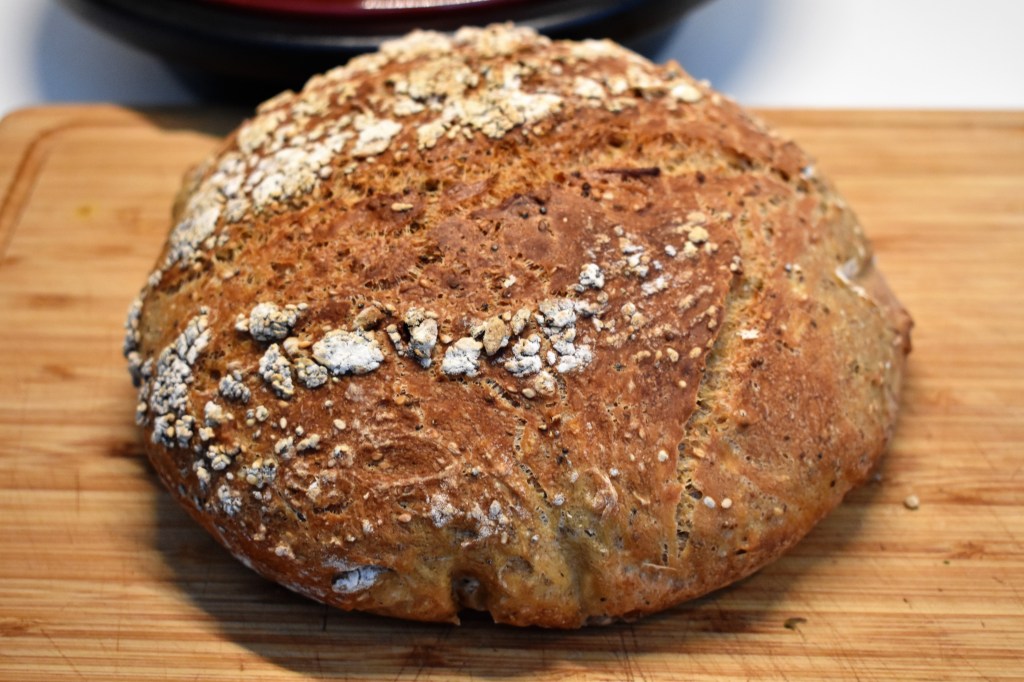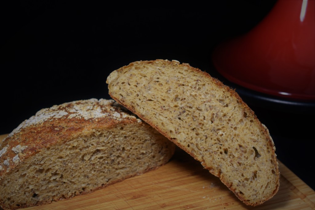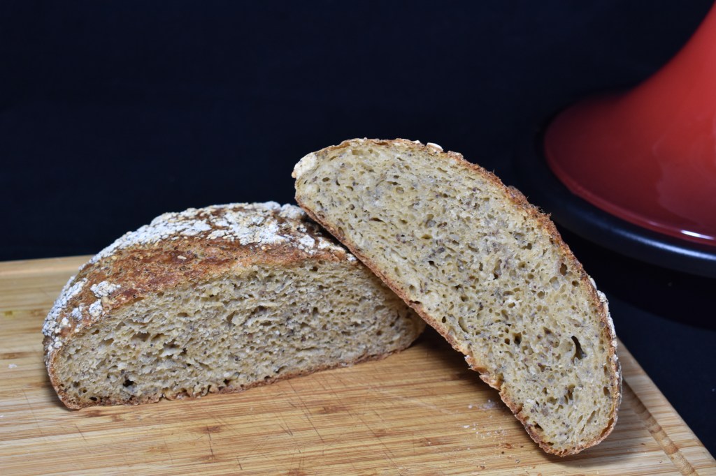 Tenía ya ganitas de hacer pan, pero como comprenderéis, en Zaragoza y en verano es una tarea de alto contenido explosivo. Pero bajaron un poquito las temperaturas y Hugo Soca nos invitó a hacer pan casero. El lo hizo rápido para poder cumplir con su programa. Yo he seguido la receta del cocinero más famoso de Uruguay, pero le he cambiado la harina y la técnica. Le he quitado levadura, lo he amasado lentamente con sus reposos y lo he dejado levar lentamente en frío durante la noche. Al día siguiente lo he formado, levado y cocinado en un tajine. El mío es de la marca le Creuset, de la tienda de ClaudiaandJulia. Eso se lo copié a Mónica Prego, y me pareció una idea excepcional. Así fue que surgió este pan, muy muy rico. Importante saber que este pan lo vamos a iniciar el día de antes, por lo cual es necesario organizarnos. Usaremos la noche para el levado en frío.