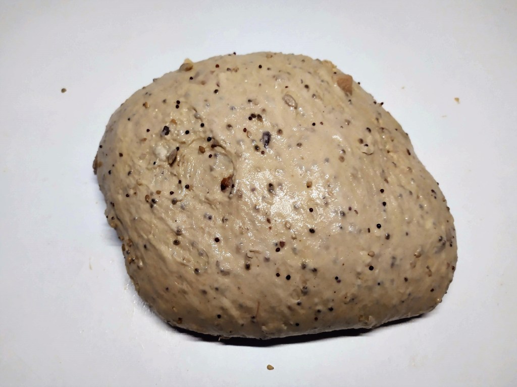 - Añadimos el resto de harina, las semillas hidratadas, y por último la sal.