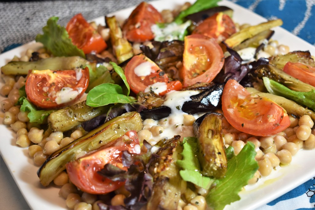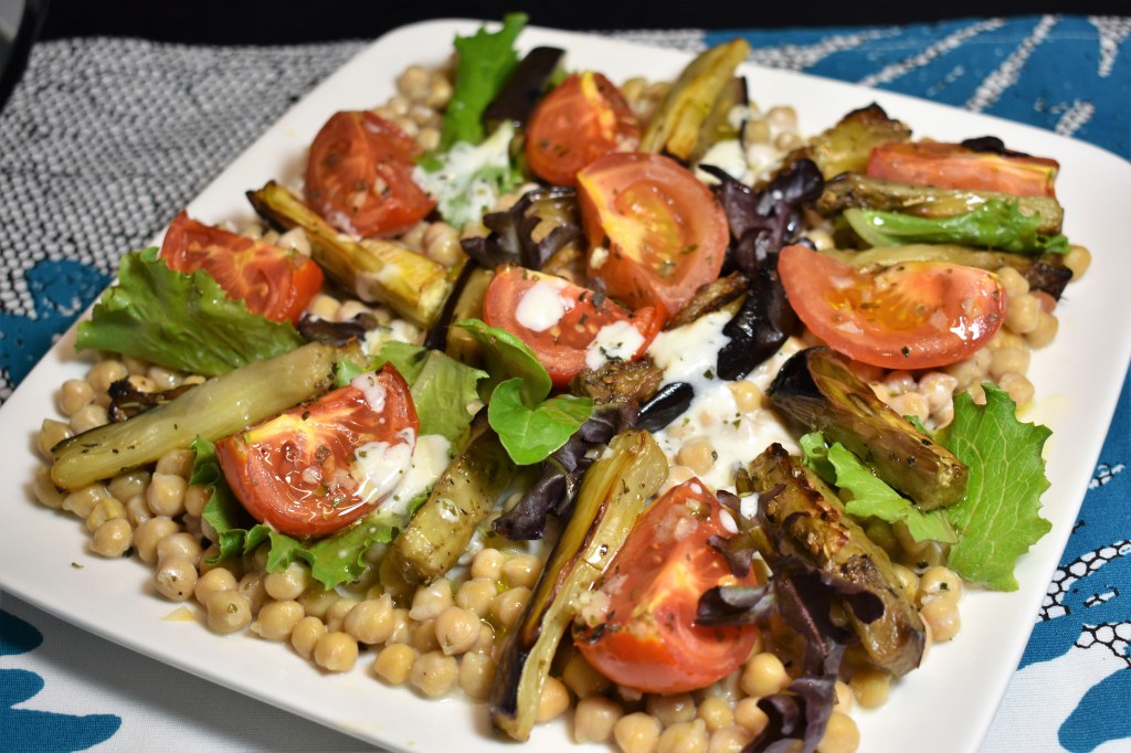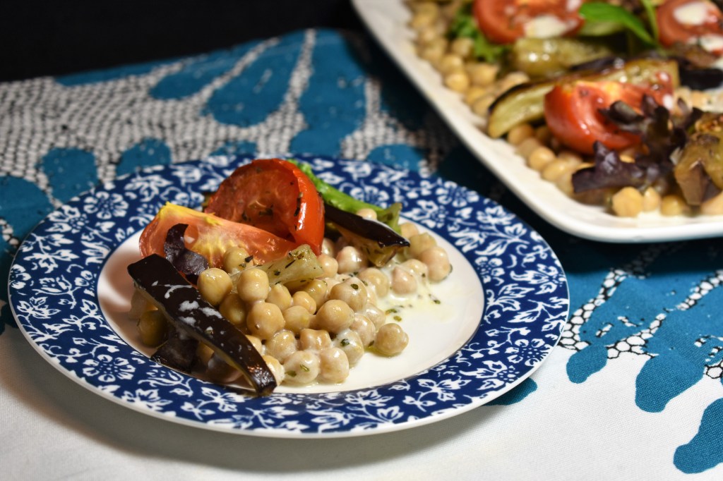 - Disponemos los garbanzos, berenjenas, tomates, hojas de albahaca picada y aderezamos.